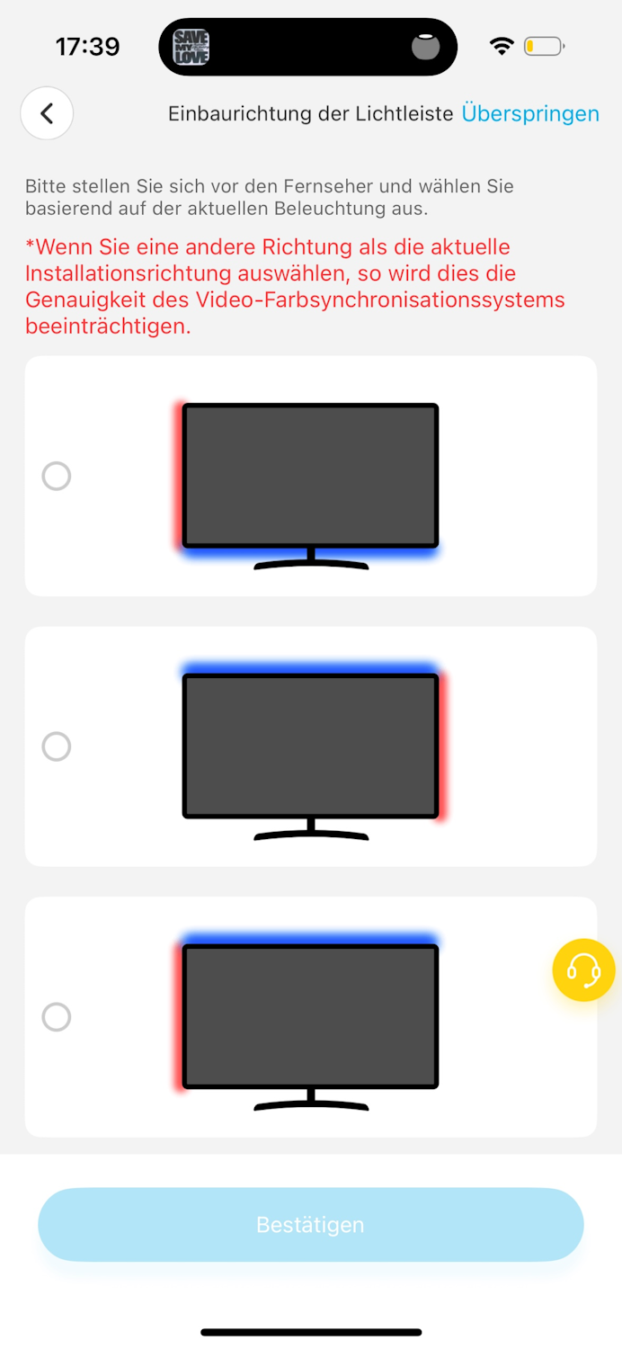 Bei der Ersteinrichtung wird jetzt die Richtung der LED Streifen eingestellt. Vergleicht einfach die blau und rot leuchtende Seite des Fernsehers mit den Bildern in der App und der erste Punkt ist eingestellt.
