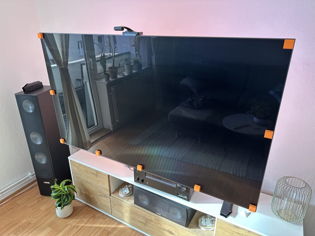 Deshalb nutzt man solch ein System auch eher in abgedunkelten Räumen oder einfach abends, aber ein zu nah aufgestelltes Lowboard mit reflektierender Oberfläche oder ein zu stark leuchtendes, unteres LED Band können die Kameraaufnahme auch verfälschen. So auch in unserem Setup, bei dem oft der untere, linke Balken durch eine Reflektion beeinträchtigt wurde. Der AV Receiver hilft an dieser Stelle auch nicht, da er noch näher am TV aufgestellt ist. Die Beeinflussung hängt aber auch stark mit der TV Bildschirmoberfläche zusammen. Bei unserem vorherigen Sony TV hatten wir auch tagsüber keine großartigen Spiegelungen, wobei das jetzige Samsung Modell auch dort bereits regenbogenartige Reflektionen zeigt.