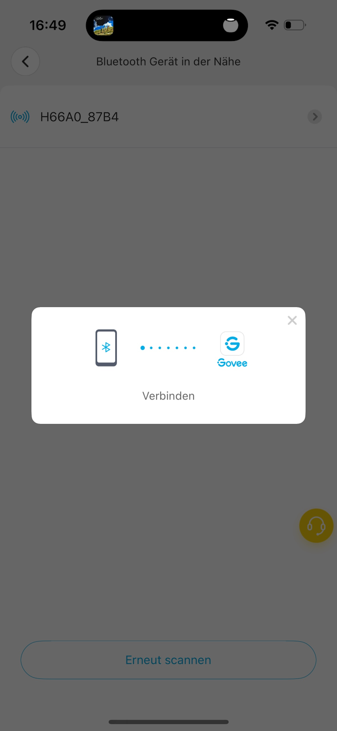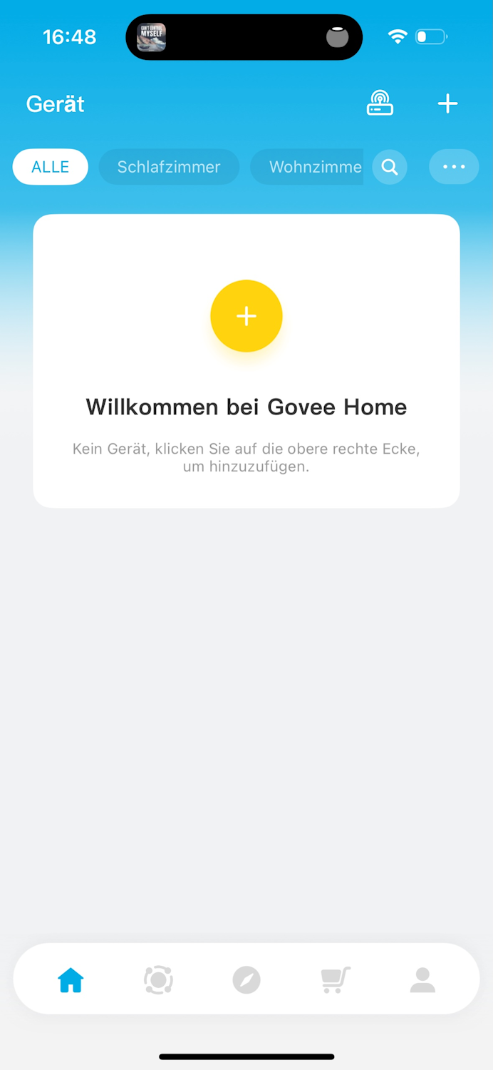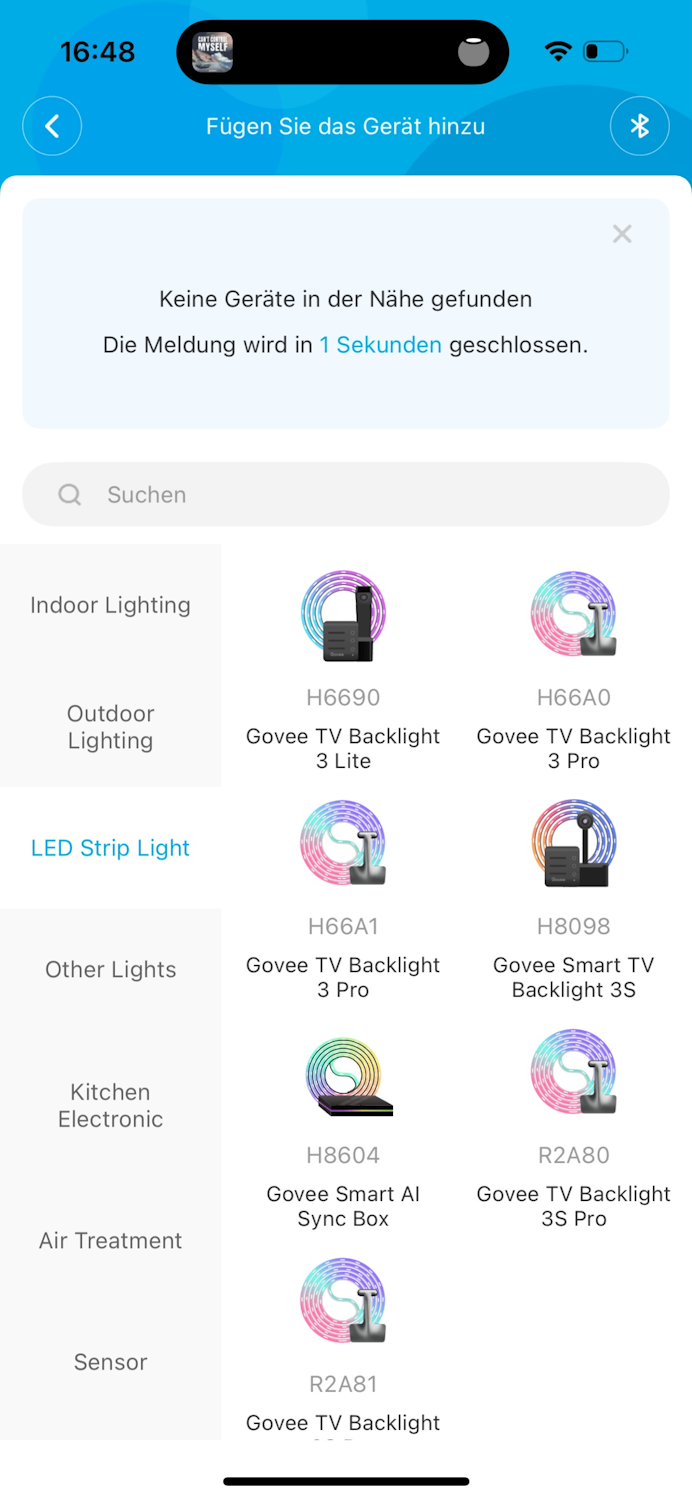 Via „Govee Home“ App geschieht die gesamte Einrichtung. Verfügbar im Google Play Store und im Apple App Store ist die App in wenigen Sekunden einsatzbereit. Da wir zuerst keine Anleitung hatten und das Gerät auch noch nicht mit Strom versorgt hatten, haben wir in der App auf das große, gelbe Plus ein Gerät manuell hinzugefügt und einfach mal geschaut was passiert. Unter dem Modellnamen H66A0 findet sich auch das 65″ Backlight 3 Pro, damit es aber weiter geht, hat lediglich erstmal die Steuerbox Strom bekommen.