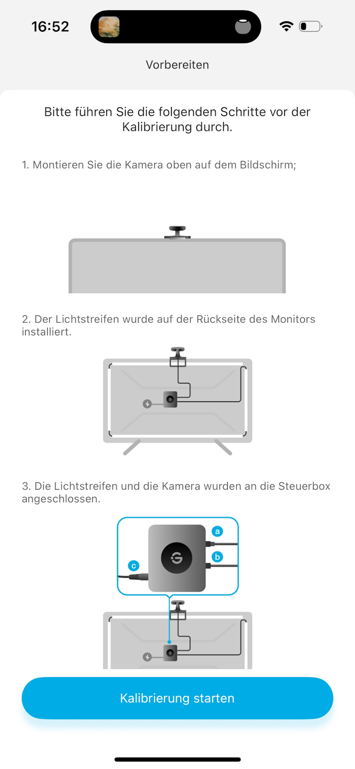 Durch die Helligkeitsreduktion des unteren Streifens und mehrmalige Kalibrierung mit weiter nach innen gesetzten Begrenzungen für die Kamera, konnte ich diesen Effekt fast eliminieren, aber er taucht in machen Szenen immer noch auf. Das Kamera System ist in unserem Setup allerdings die einzige Möglichkeit für ein Ambilight, da wir die Apps des Smart TVs nutzen um Inhalte zu schauen. Eine HDMI Variante hat Govee mit der KI Sync Box Kit 2 auch im Programm, dazu braucht es aber externe Quellen, wie z.B. ein FIre TV Stick oder ähnliches.