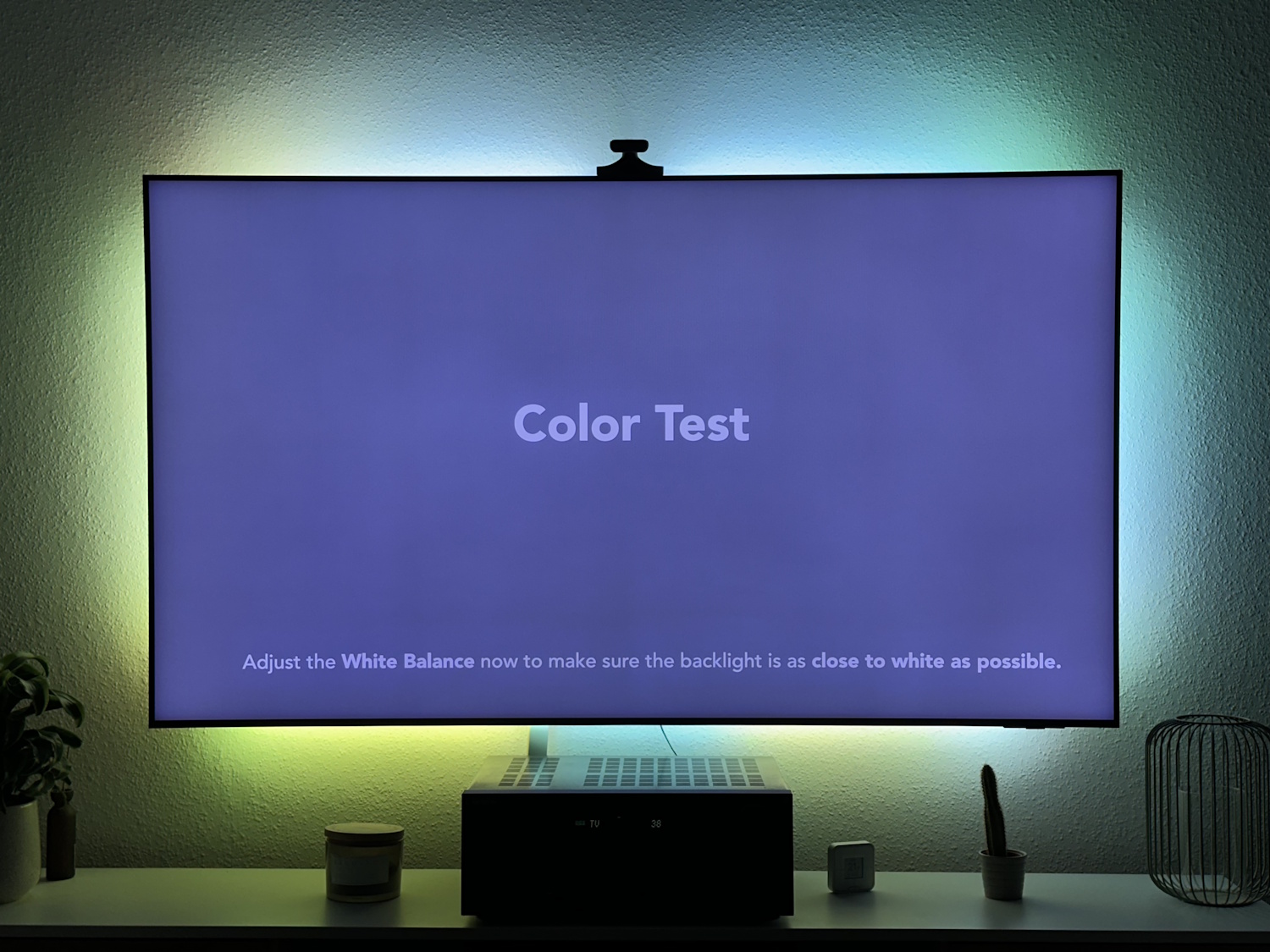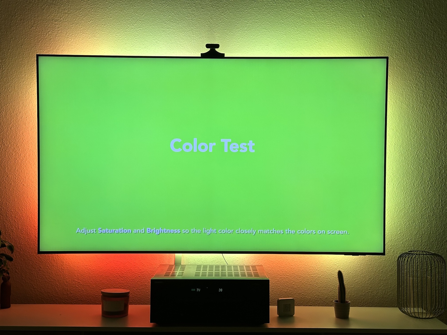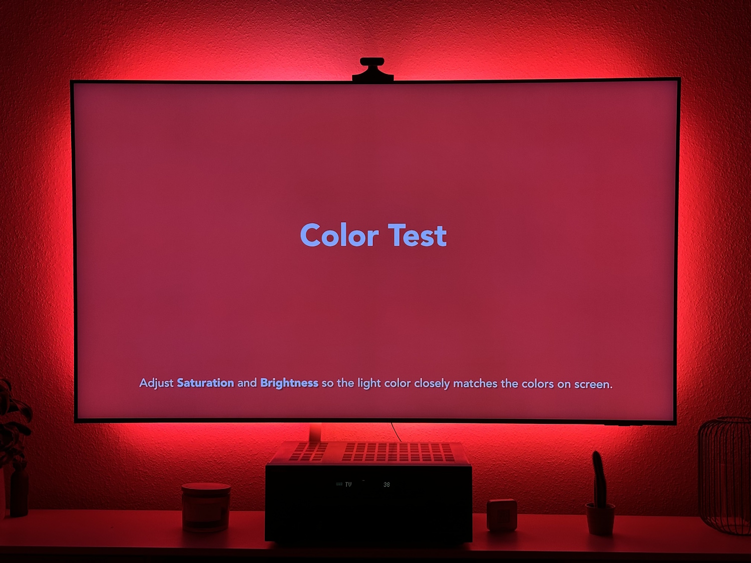 Bei der Farbtreue hatte ich allerdings so meine Probleme. Eine Kalibrierung der einzelnen Farben ist nicht möglich. Per App lässt sich die Sättigung der Farben im gesamten, als einzelnen Schieberegler anpassen. Weißabgleich wird mittels eines grauen Bildes gemacht. Govee hat dazu für das TV Backlight 3 Lite ein Video auf Youtube, was sich im Idealfall direkt auf dem TV abspielen lässt und somit ein bestmögliches Ergebnis mit den zwei Kenngrößen zu erreichen ist. Da ein kamerabasiertes System das Bild des TVs selbst scannt, sollten darauf möglichst keine Reflektionen zu sehen sein, da sie sonst die erkannte Farbe abändern könnten.