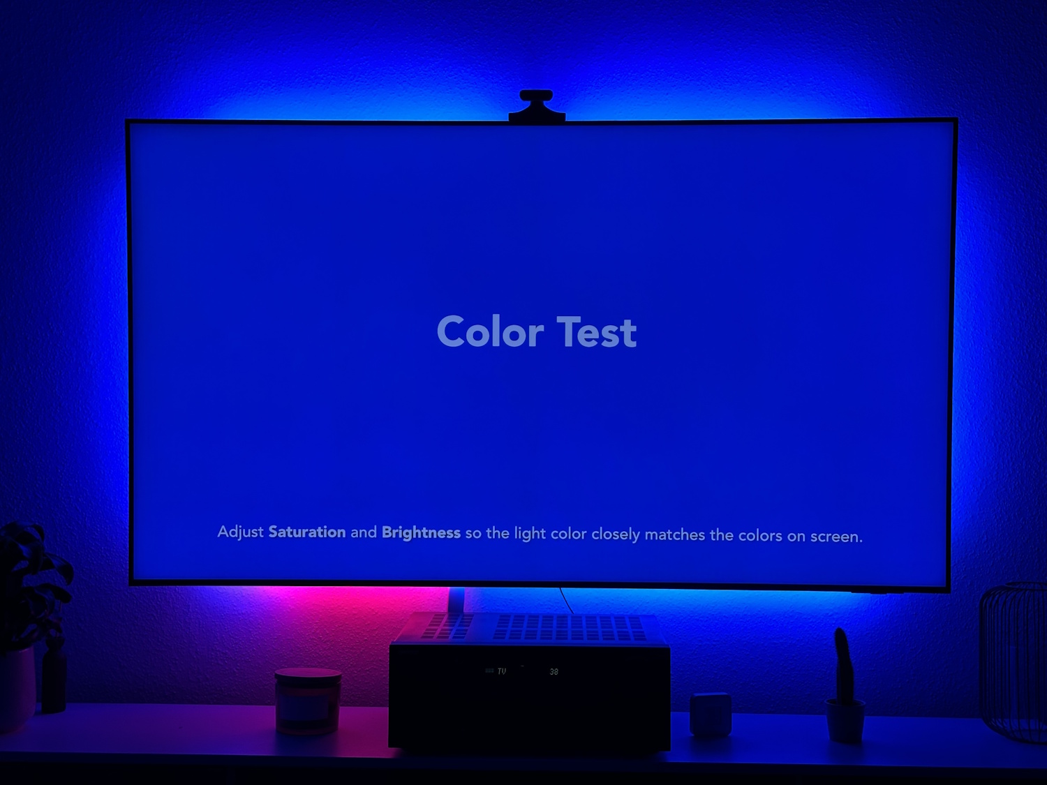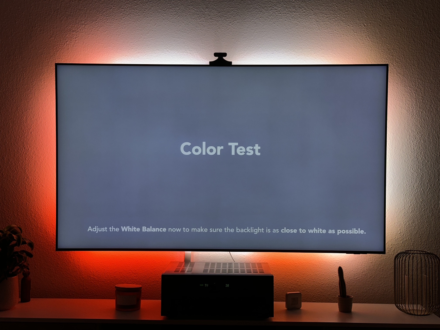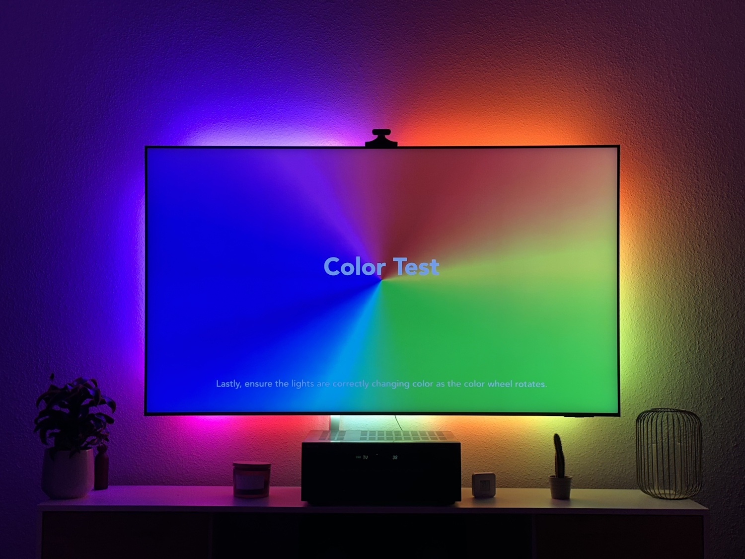 Bei der Farbtreue hatte ich allerdings so meine Probleme. Eine Kalibrierung der einzelnen Farben ist nicht möglich. Per App lässt sich die Sättigung der Farben im gesamten, als einzelnen Schieberegler anpassen. Weißabgleich wird mittels eines grauen Bildes gemacht. Govee hat dazu für das TV Backlight 3 Lite ein Video auf Youtube, was sich im Idealfall direkt auf dem TV abspielen lässt und somit ein bestmögliches Ergebnis mit den zwei Kenngrößen zu erreichen ist. Da ein kamerabasiertes System das Bild des TVs selbst scannt, sollten darauf möglichst keine Reflektionen zu sehen sein, da sie sonst die erkannte Farbe abändern könnten.