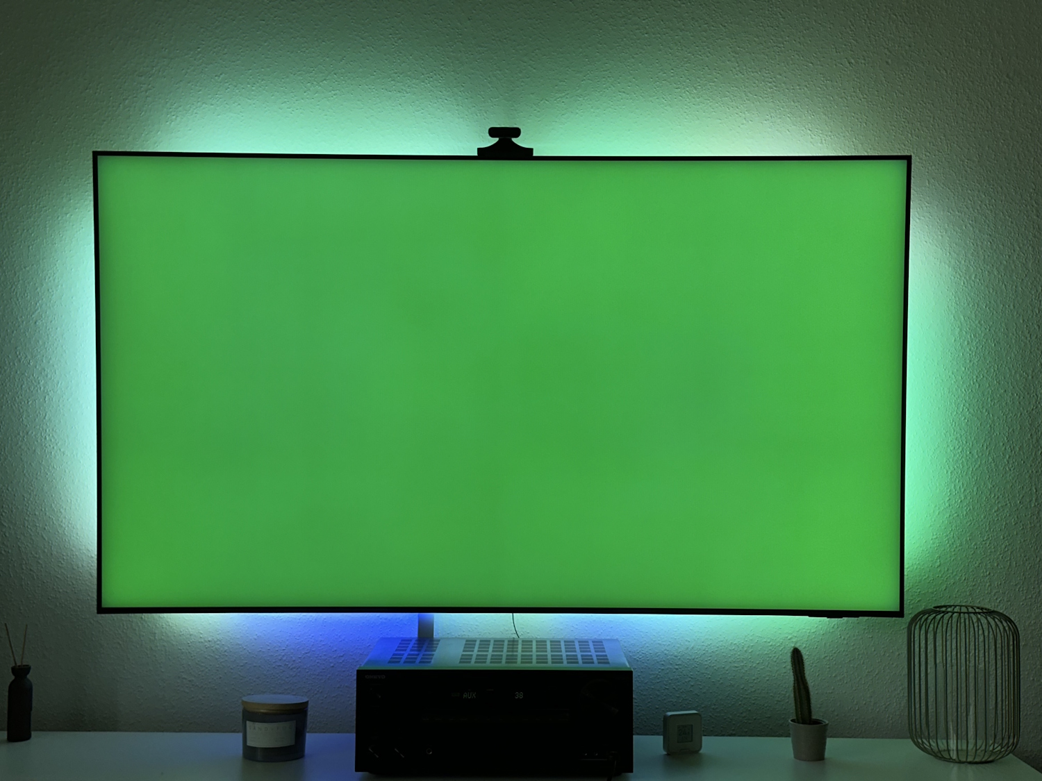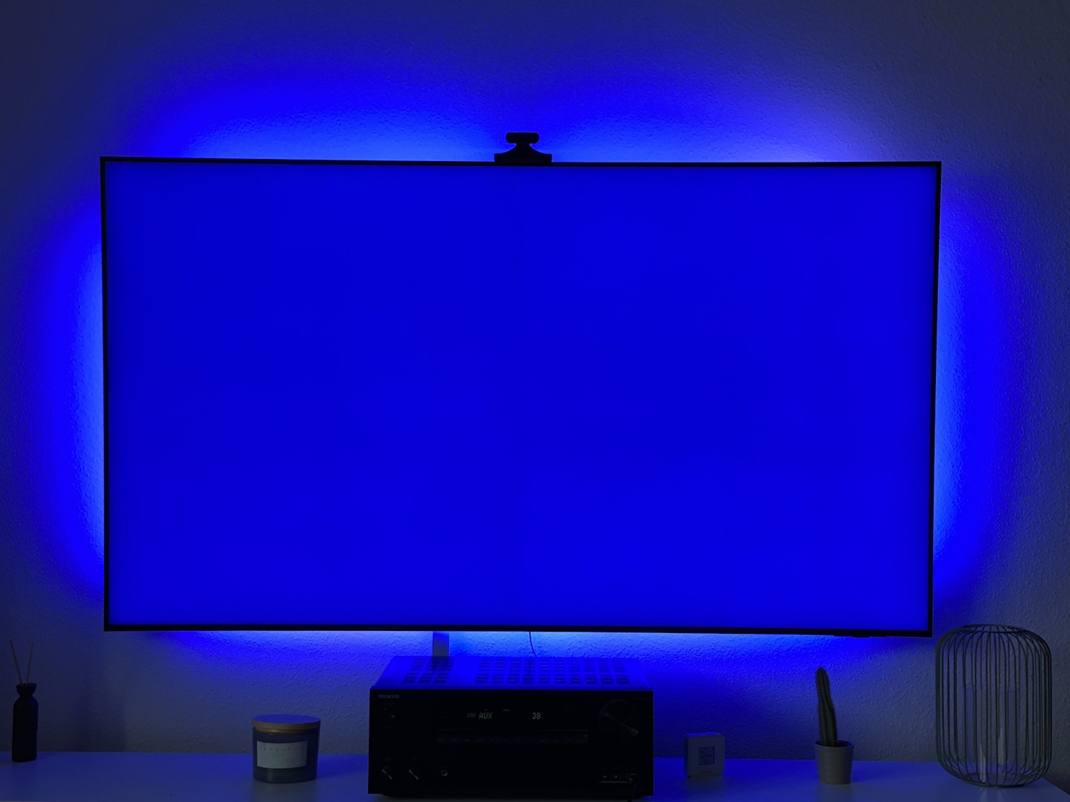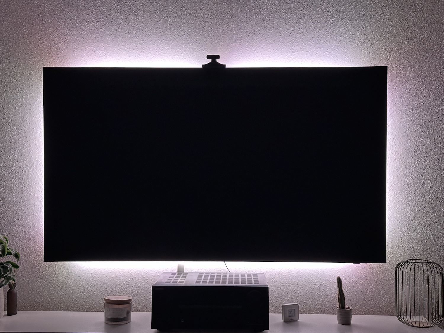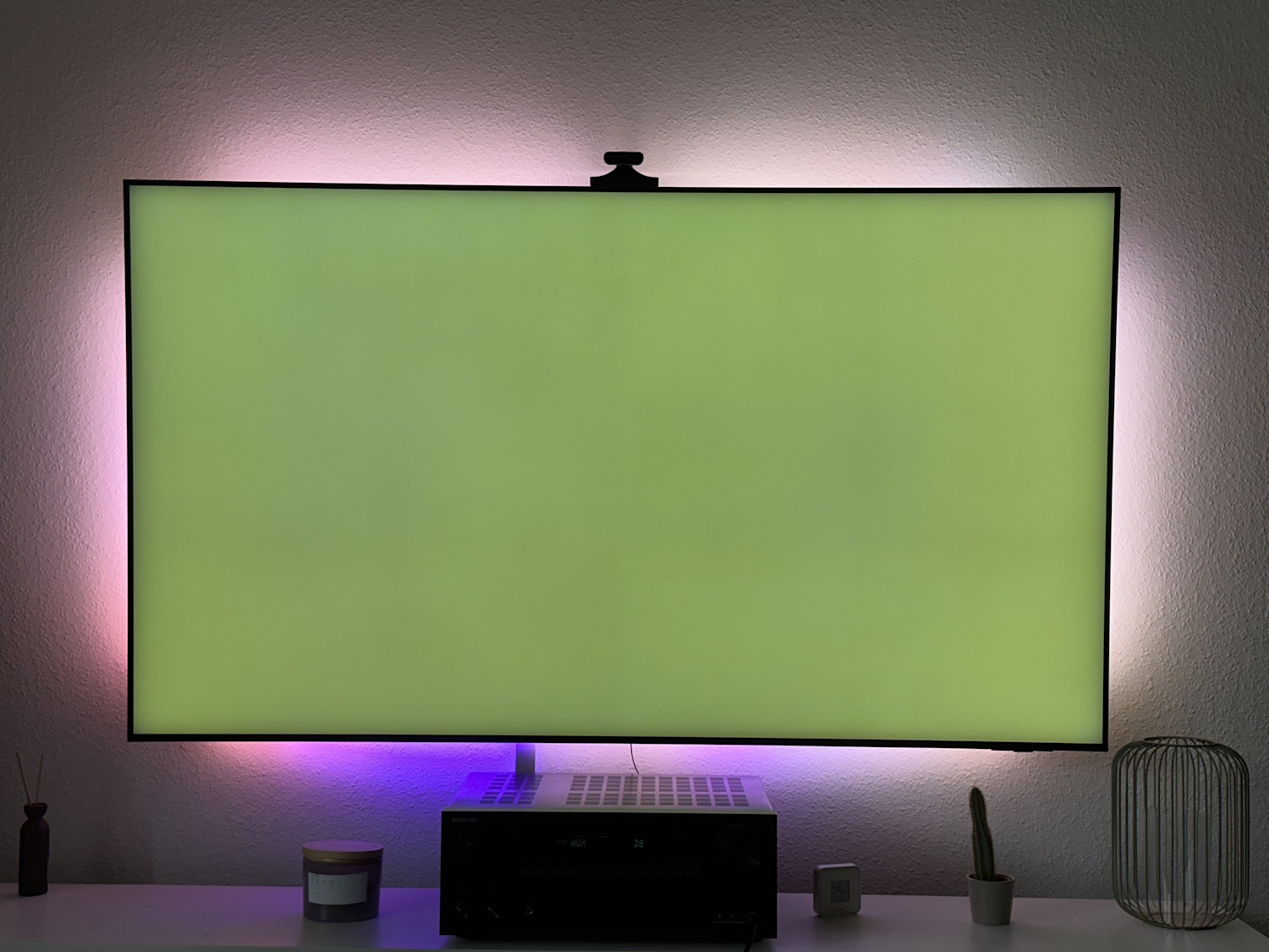 Dabei kann man ca. von 20-30% Reduktion sprechen, die man in der App für die näher am Rand liegenden, horizontalen Streifen einstellen muss, dass sie den gleichen Bereich auf der Wand erleuchten und nicht viel stärker rausstechen, im Vergleich zu den Seitlichen. Ein paar cm längere Verbindungskabel zwischen den LED Ketten würden hier schon reichen, dass egal ob 55″ oder 65″ TV, die jeweiligen LED Streifen ganz außen montiert werden könnten. Dies kann preislich auch kein großer Kostenaufwand sein, da es sich lediglich um normale Leiter handelt. Bei unserem Beispiel TV ist das Gehäuse an allen Stellen gleich dick, viele TVs sind aber gerade im unteren Bereich deutlich tiefer um die gesamte Elektronik unter zu bekommen. Auch hierfür kann die Helligkeitssteuerung der einzelnen Streifen genutzt werden und ein homogenes Lichtbild an der Wand geschaffen werden.