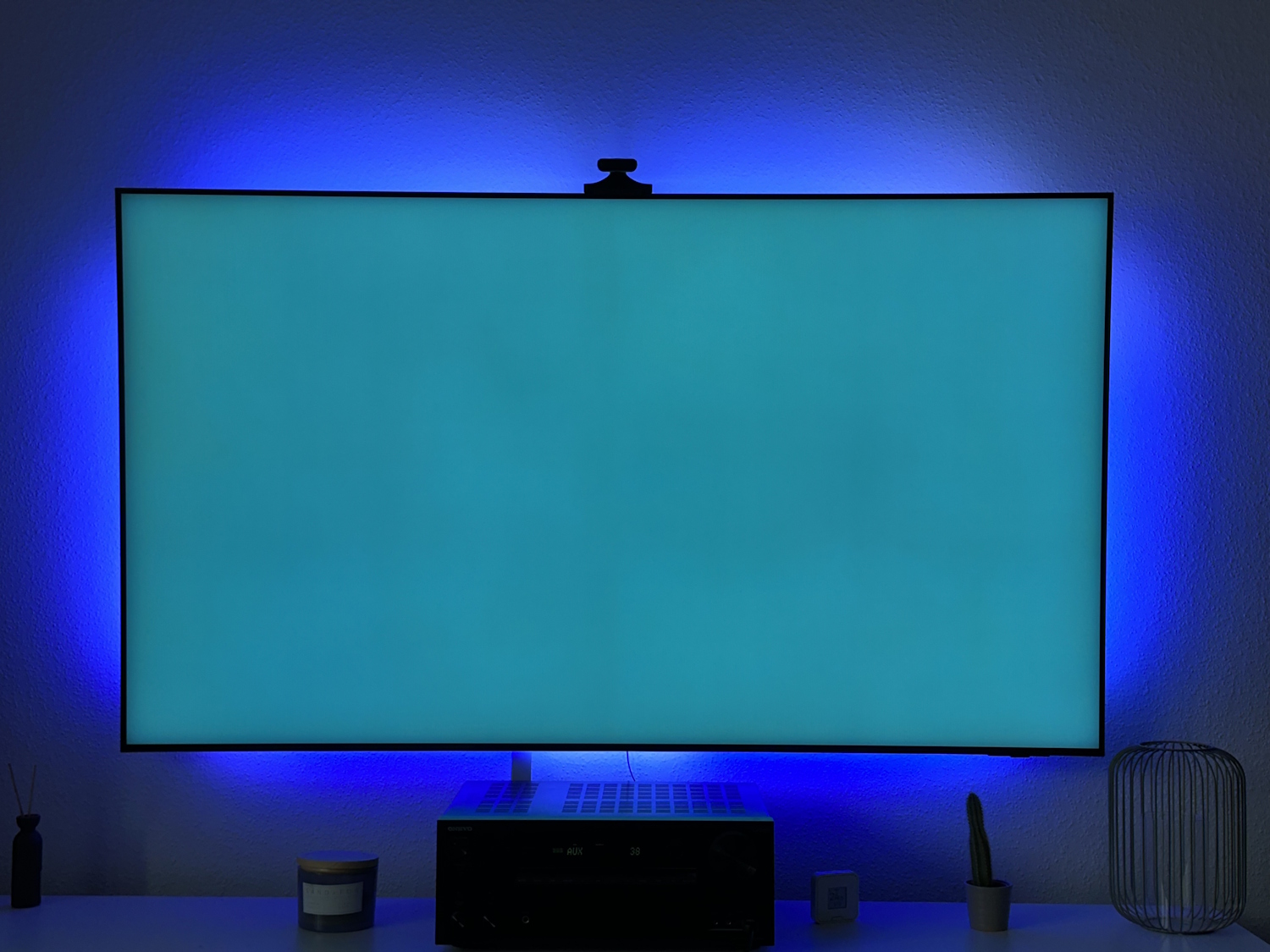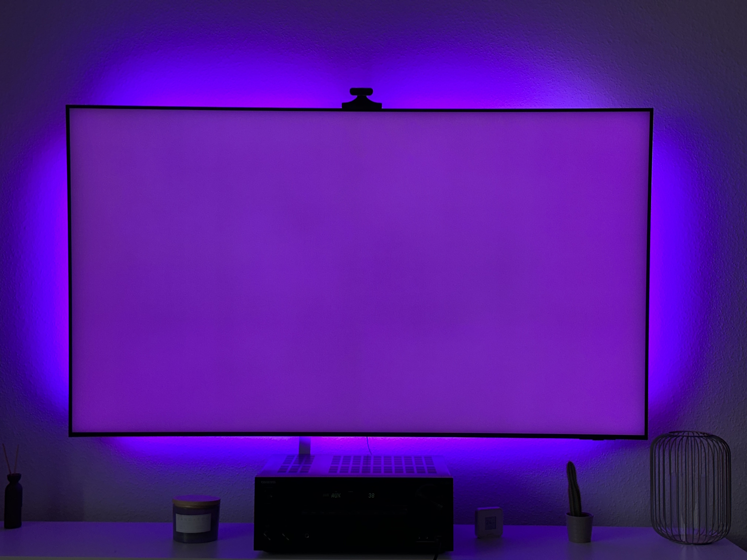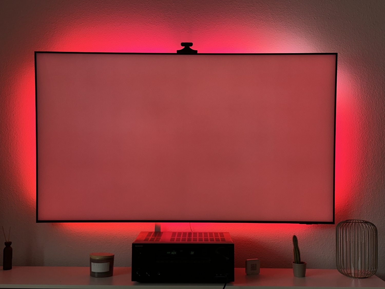 Dabei kann man ca. von 20-30% Reduktion sprechen, die man in der App für die näher am Rand liegenden, horizontalen Streifen einstellen muss, dass sie den gleichen Bereich auf der Wand erleuchten und nicht viel stärker rausstechen, im Vergleich zu den Seitlichen. Ein paar cm längere Verbindungskabel zwischen den LED Ketten würden hier schon reichen, dass egal ob 55″ oder 65″ TV, die jeweiligen LED Streifen ganz außen montiert werden könnten. Dies kann preislich auch kein großer Kostenaufwand sein, da es sich lediglich um normale Leiter handelt. Bei unserem Beispiel TV ist das Gehäuse an allen Stellen gleich dick, viele TVs sind aber gerade im unteren Bereich deutlich tiefer um die gesamte Elektronik unter zu bekommen. Auch hierfür kann die Helligkeitssteuerung der einzelnen Streifen genutzt werden und ein homogenes Lichtbild an der Wand geschaffen werden.