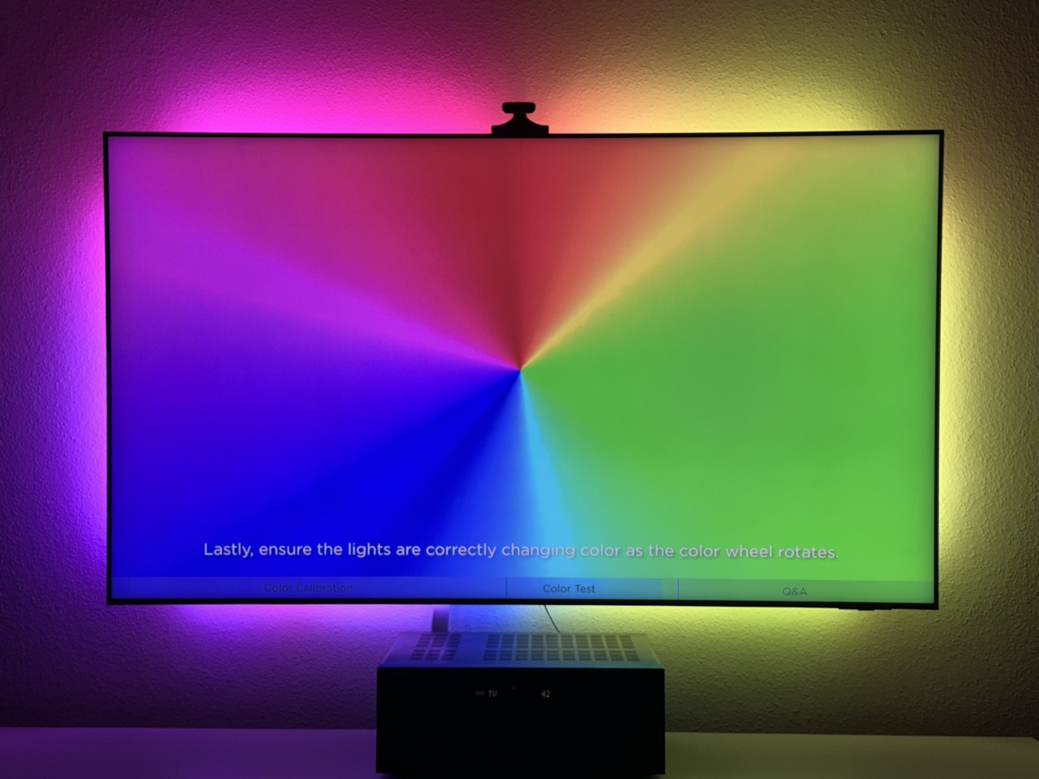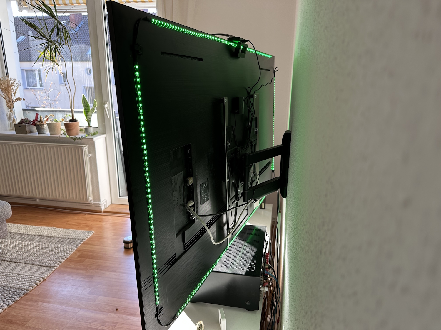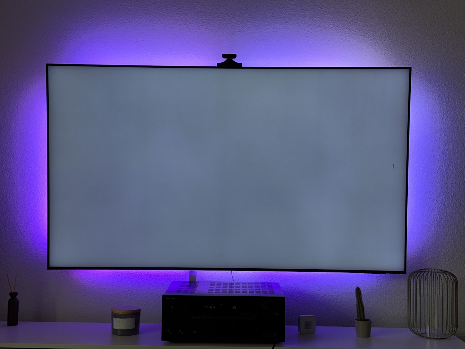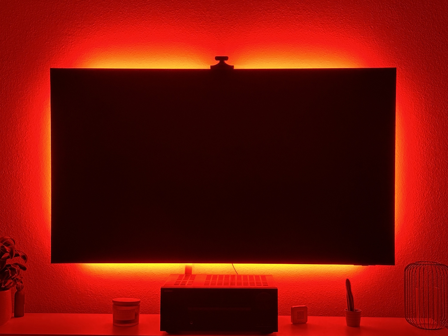 Dabei kann man ca. von 20-30% Reduktion sprechen, die man in der App für die näher am Rand liegenden, horizontalen Streifen einstellen muss, dass sie den gleichen Bereich auf der Wand erleuchten und nicht viel stärker rausstechen, im Vergleich zu den Seitlichen. Ein paar cm längere Verbindungskabel zwischen den LED Ketten würden hier schon reichen, dass egal ob 55″ oder 65″ TV, die jeweiligen LED Streifen ganz außen montiert werden könnten. Dies kann preislich auch kein großer Kostenaufwand sein, da es sich lediglich um normale Leiter handelt. Bei unserem Beispiel TV ist das Gehäuse an allen Stellen gleich dick, viele TVs sind aber gerade im unteren Bereich deutlich tiefer um die gesamte Elektronik unter zu bekommen. Auch hierfür kann die Helligkeitssteuerung der einzelnen Streifen genutzt werden und ein homogenes Lichtbild an der Wand geschaffen werden.