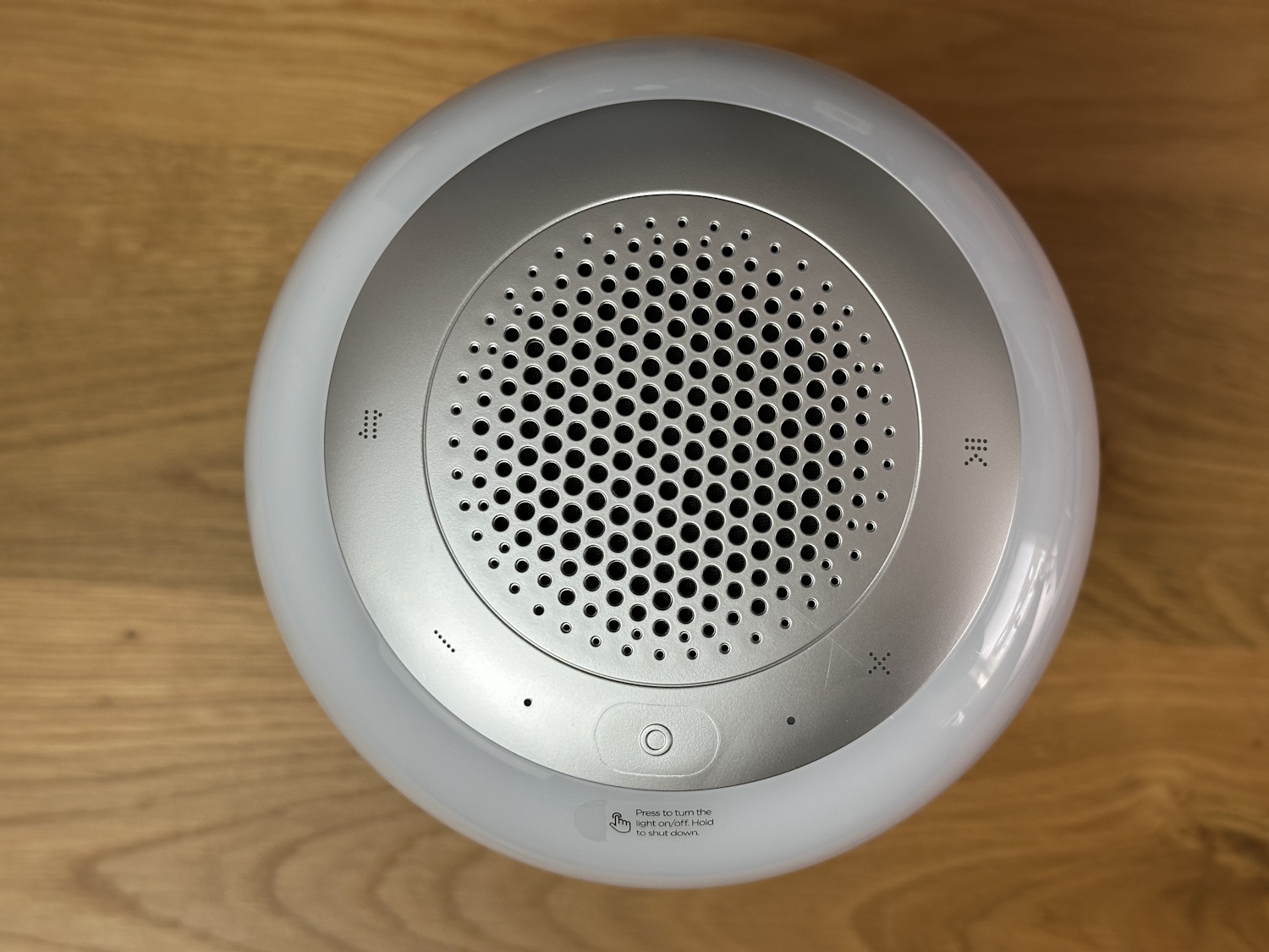 Die Tasten lassen Grundfunktionen wie Licht EIN/AUS, voreingestellte Lichtmodi durchwechseln, lauter/leiser sowie heller und dunkler zu. Der Play Pause Taster schaltet entweder die Hintergrundgeräusche ein und aus oder startet und stoppt die Bluetooth Musikwiedergabe. Je nachdem ob ein Gerät per Bluetooth verbunden ist oder eben nicht. Ein langer Druck startet das Bluetooth pairing. Im per App aktivierten Schlafmodus, dient die gesamte obere Platte als ein riesengroßer Schalter, sodass auch im Dunkeln ein einfaches anschalten des Lichts gegeben ist.