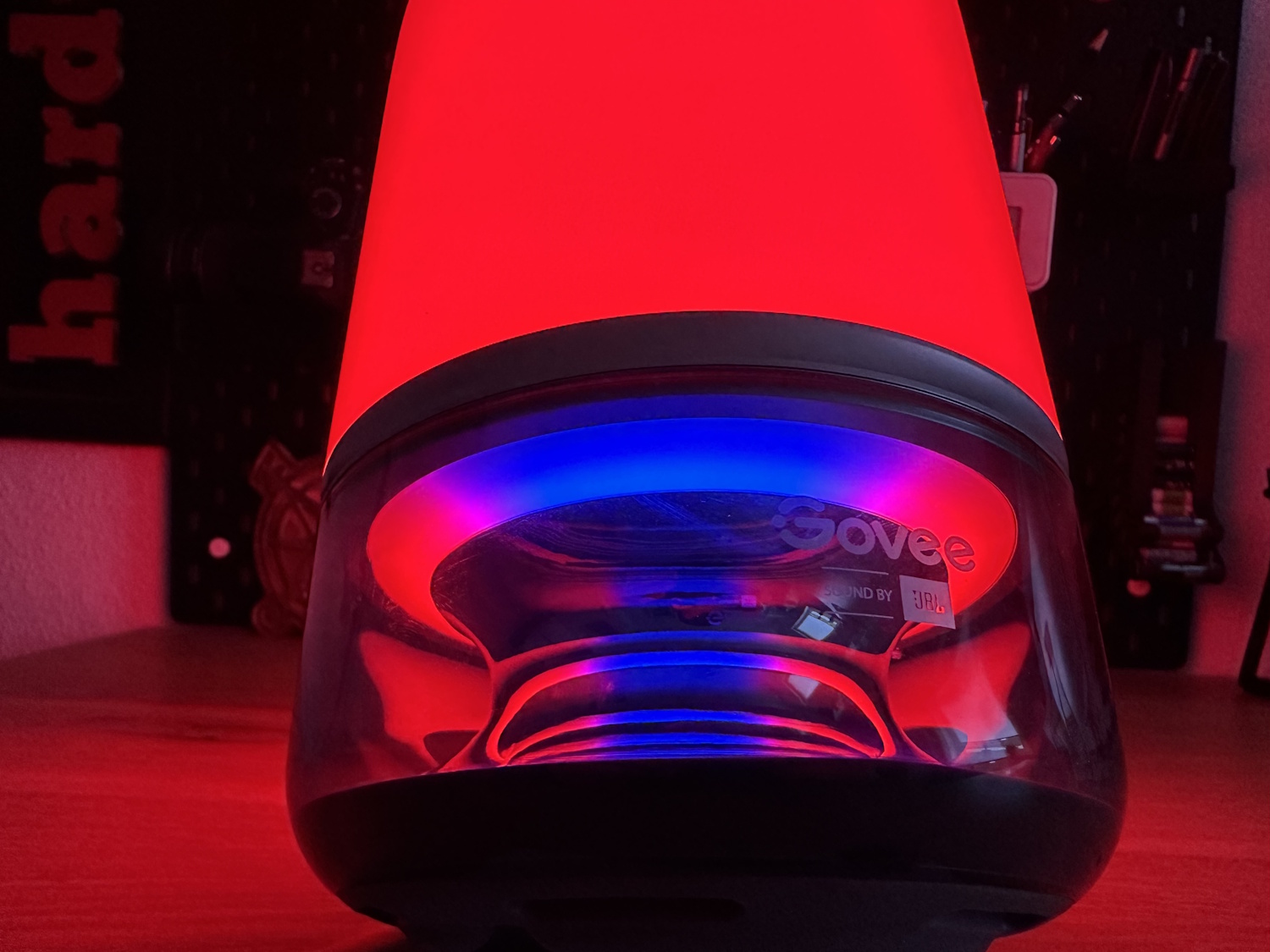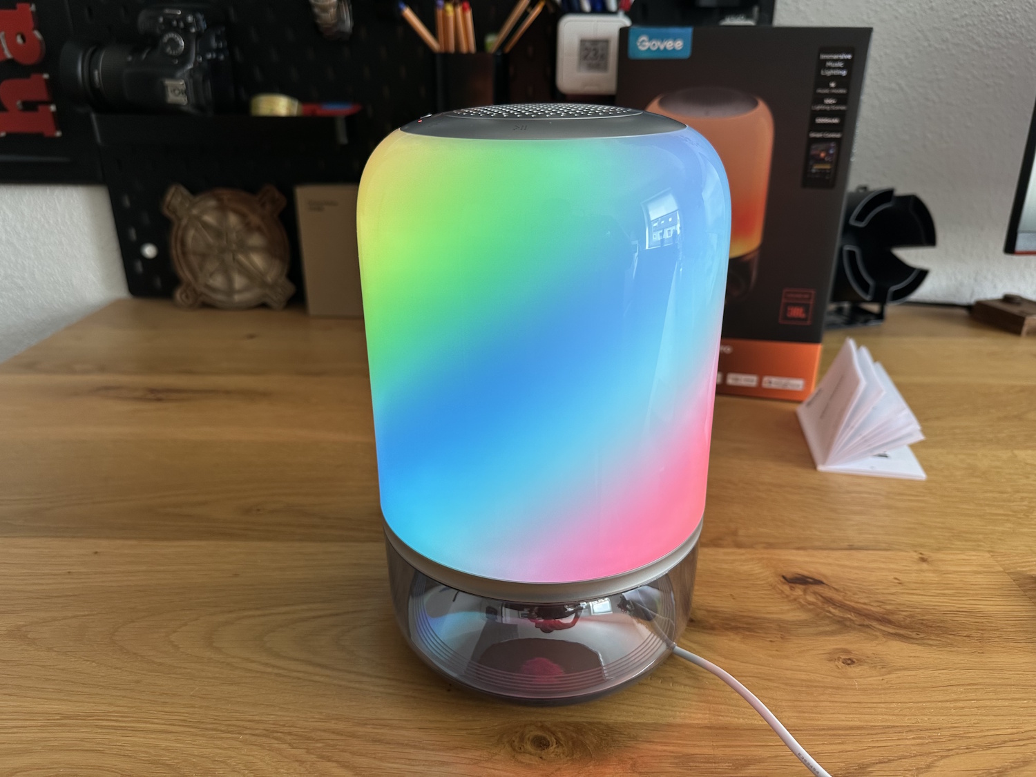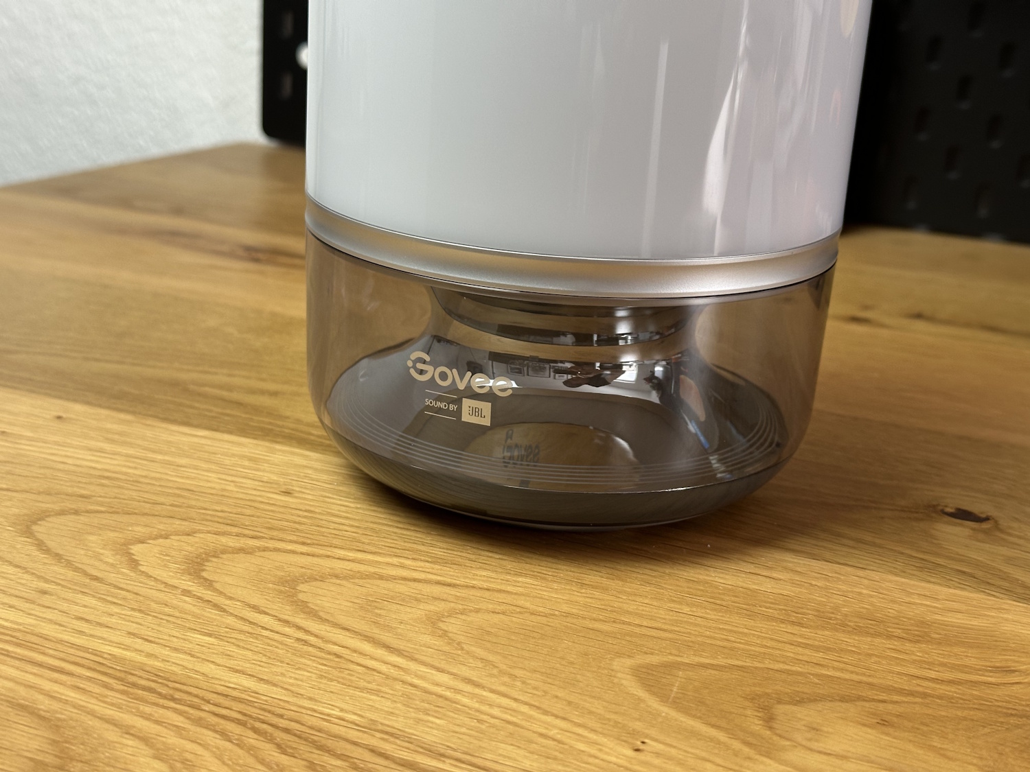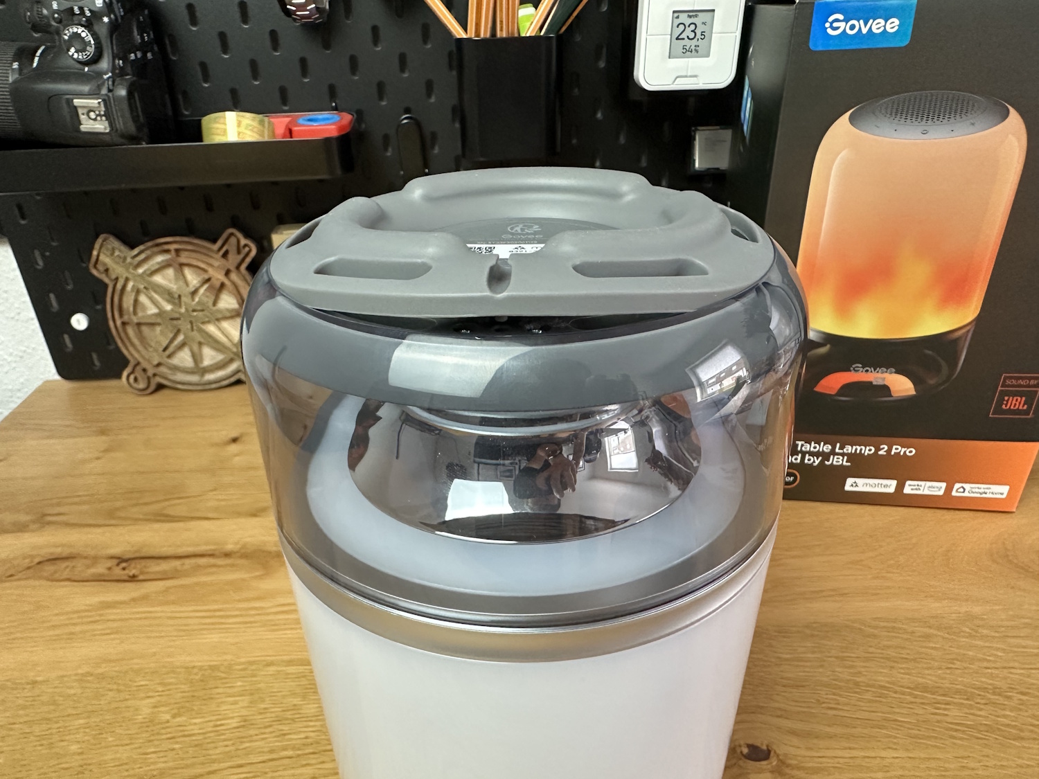 Das Äußere macht einen wertigen Eindruck. Obwohl das gesamte Gehäuse aus Kunststoff gefertigt ist, wirkt es schon fast etwas künstlerisch mit dem durchsichtigen Element im unteren Bereich. Dahinter liegt ein schwarz verchromter Ring, der natürlich die LEDs perfekt spiegelt. Genau hierfür sind neben dem großen Dome, weitere 5 LED Segmente verbaut, die nur für den unteren Bereich zuständig sind. In der App lassen diese sich getrennt mit Farben belegen oder ein und aus schalten.