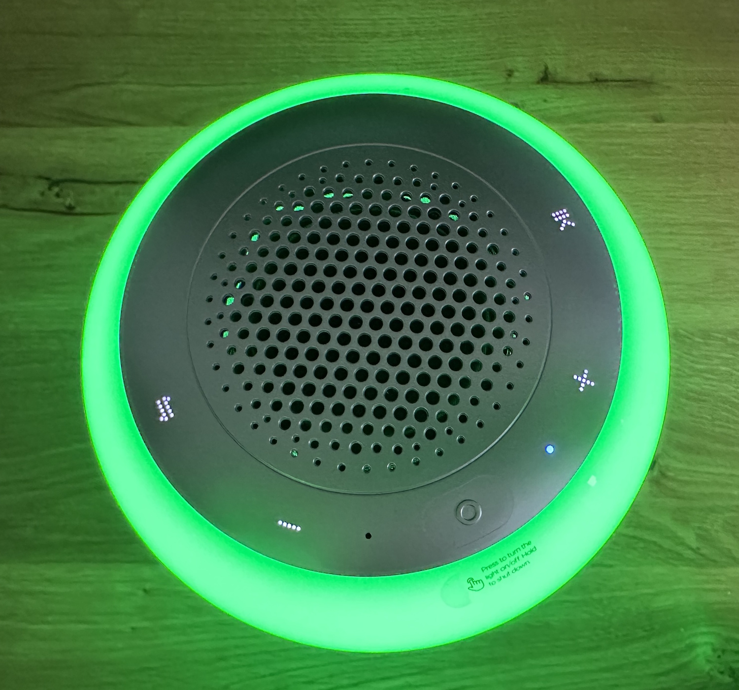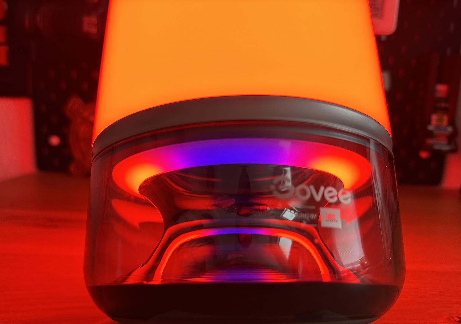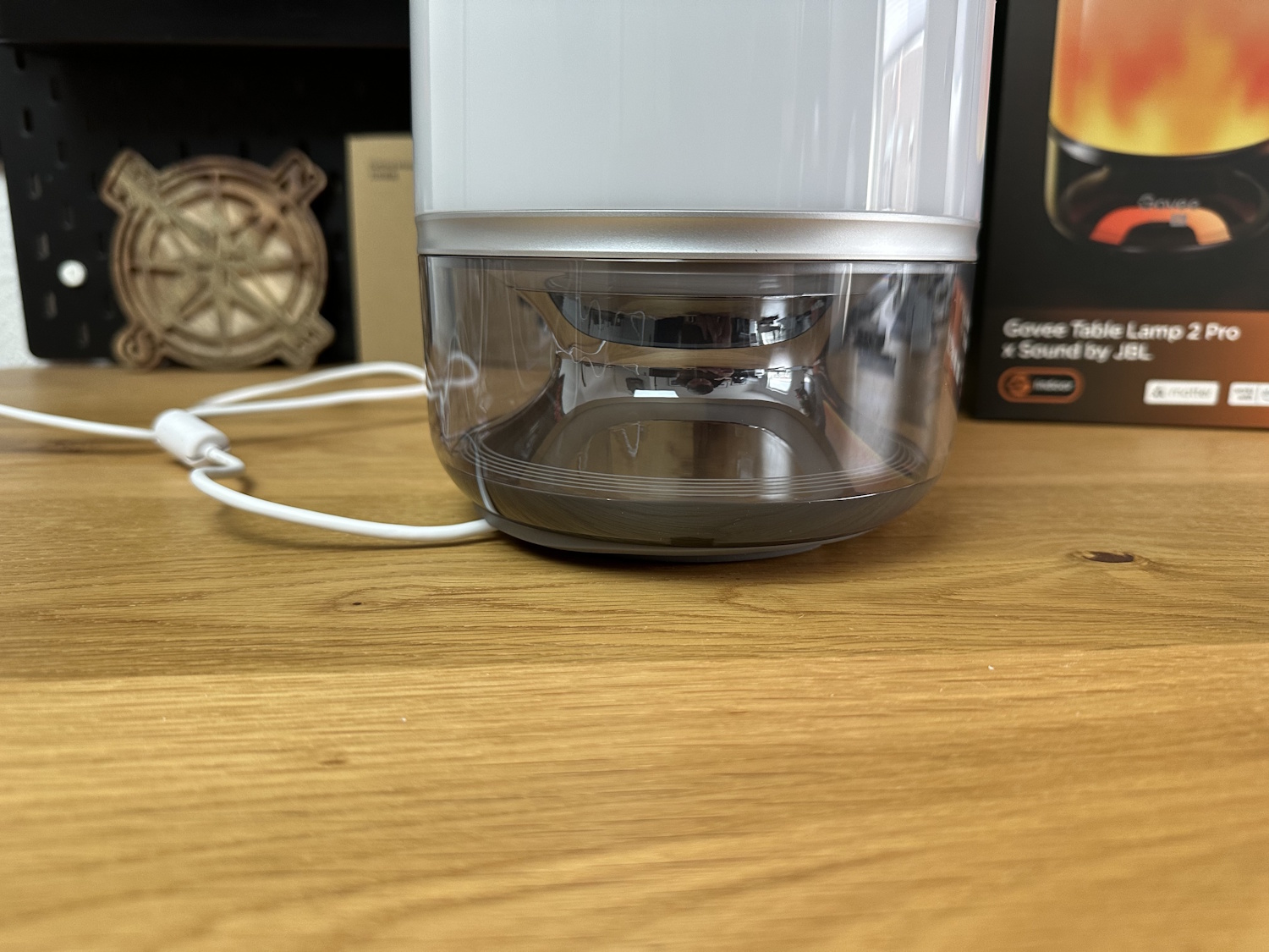 Das Äußere macht einen wertigen Eindruck. Obwohl das gesamte Gehäuse aus Kunststoff gefertigt ist, wirkt es schon fast etwas künstlerisch mit dem durchsichtigen Element im unteren Bereich. Dahinter liegt ein schwarz verchromter Ring, der natürlich die LEDs perfekt spiegelt. Genau hierfür sind neben dem großen Dome, weitere 5 LED Segmente verbaut, die nur für den unteren Bereich zuständig sind. In der App lassen diese sich getrennt mit Farben belegen oder ein und aus schalten.