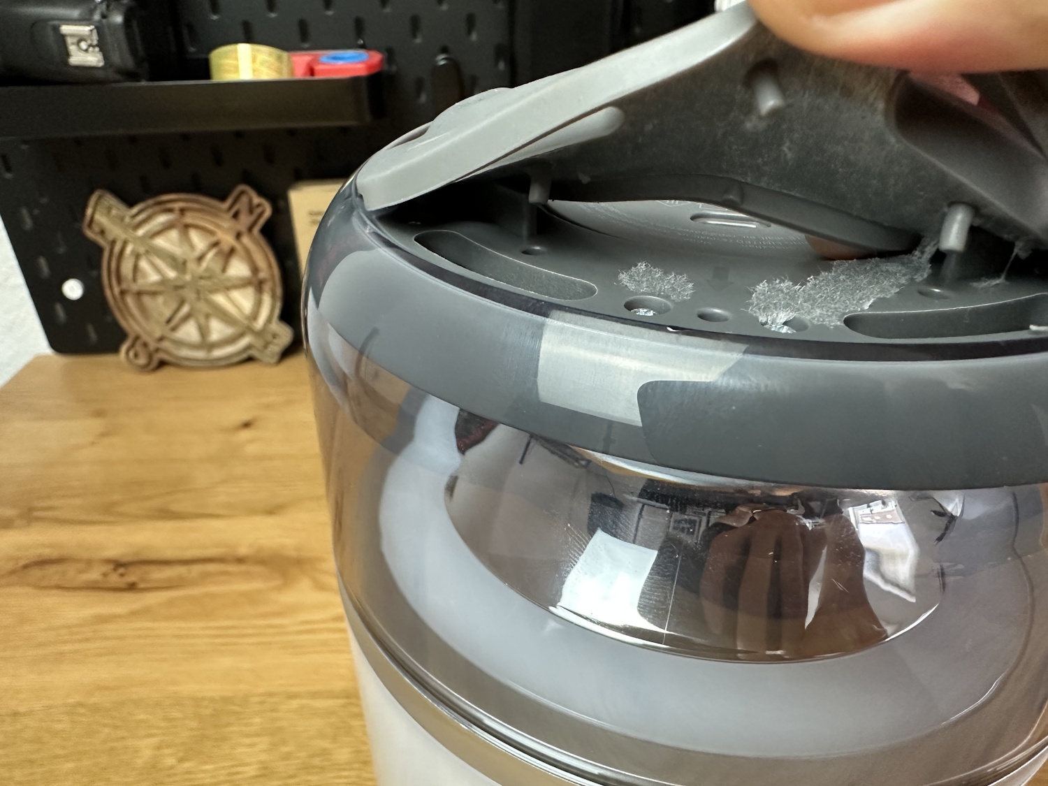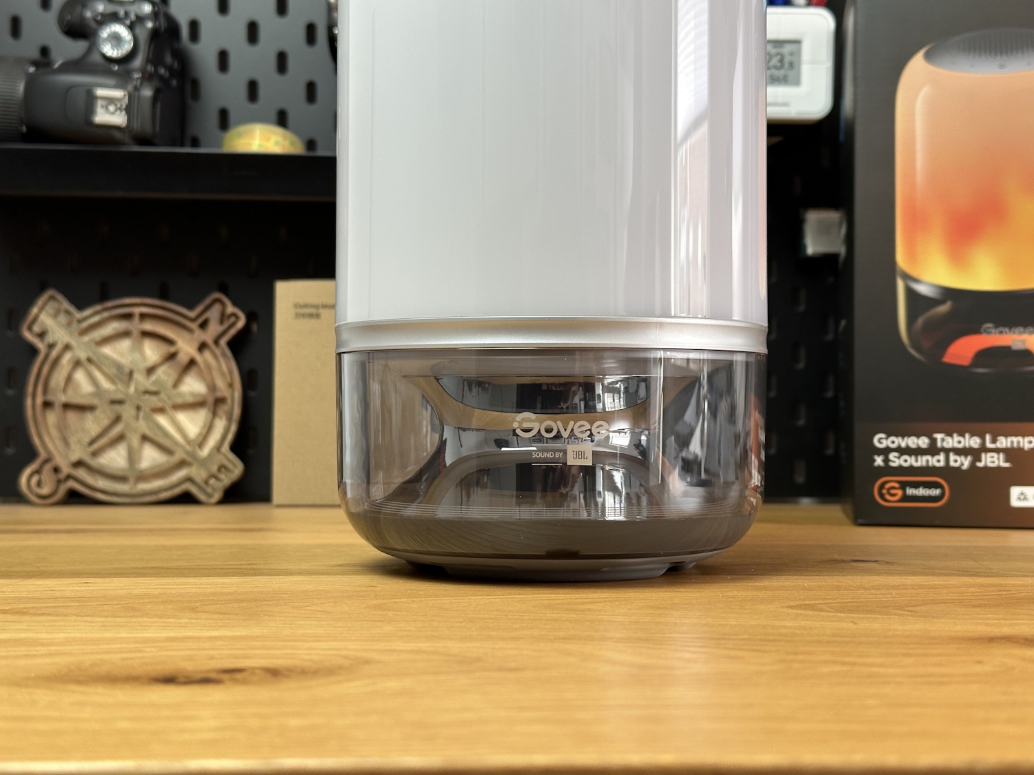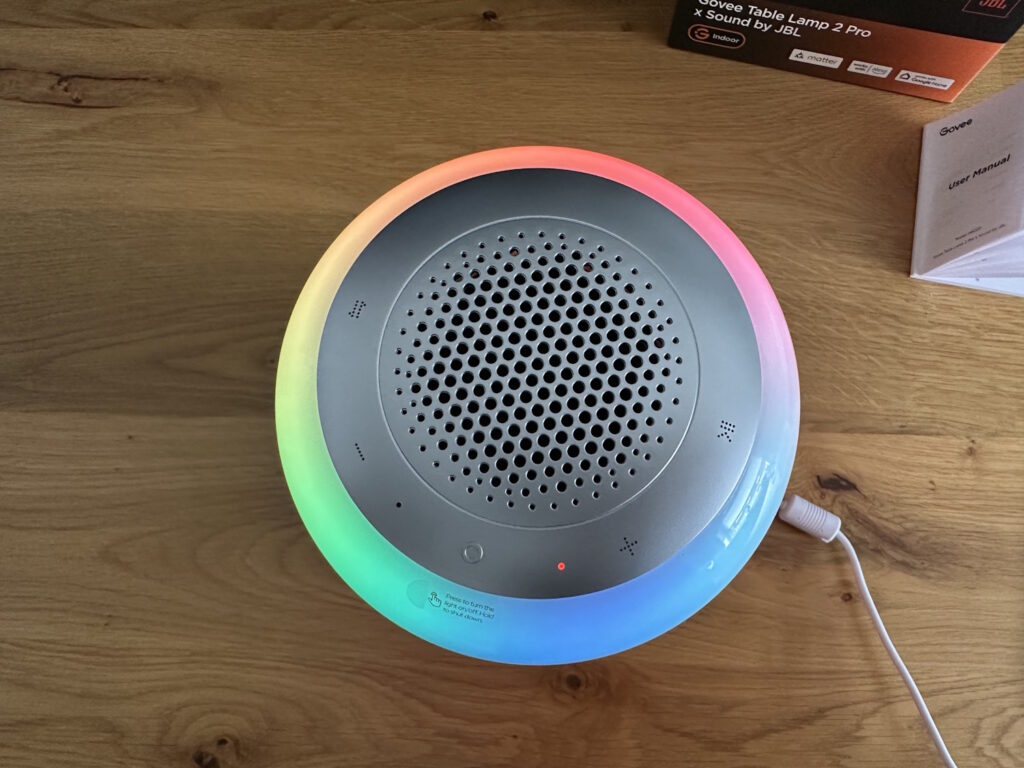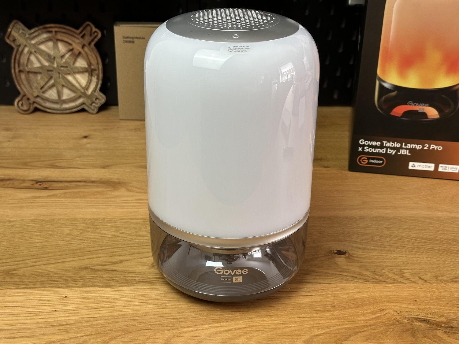 Das Äußere macht einen wertigen Eindruck. Obwohl das gesamte Gehäuse aus Kunststoff gefertigt ist, wirkt es schon fast etwas künstlerisch mit dem durchsichtigen Element im unteren Bereich. Dahinter liegt ein schwarz verchromter Ring, der natürlich die LEDs perfekt spiegelt. Genau hierfür sind neben dem großen Dome, weitere 5 LED Segmente verbaut, die nur für den unteren Bereich zuständig sind. In der App lassen diese sich getrennt mit Farben belegen oder ein und aus schalten.