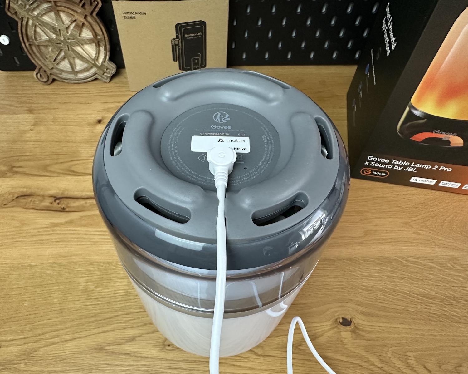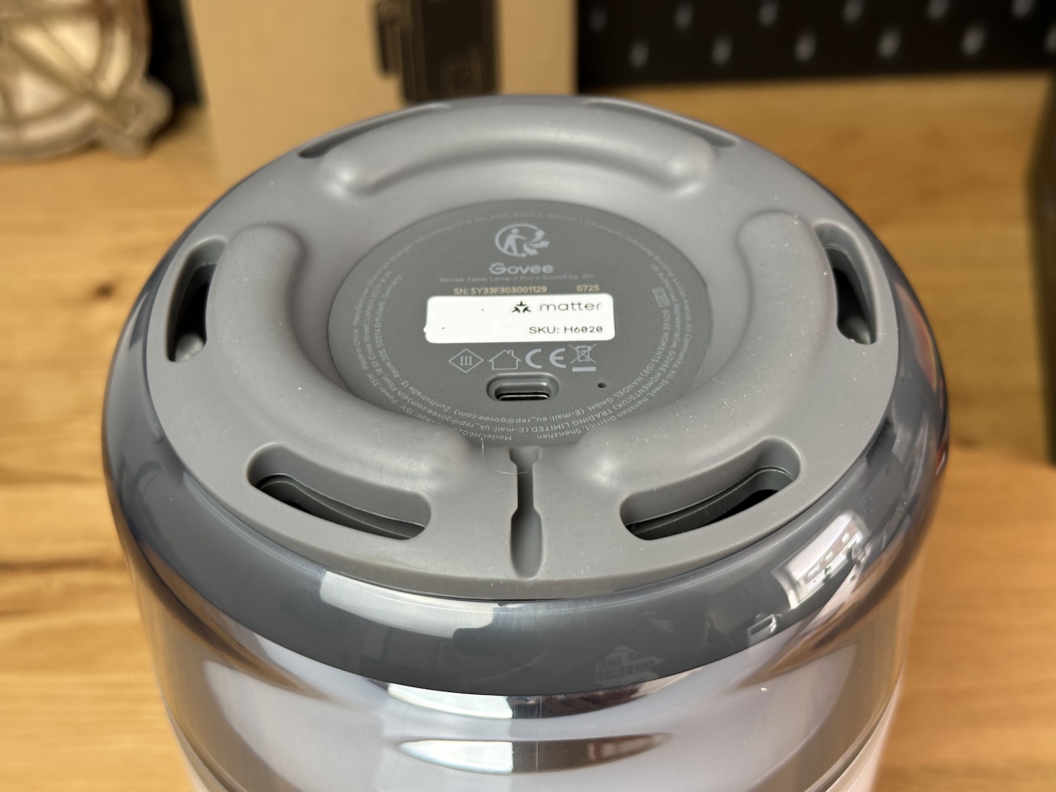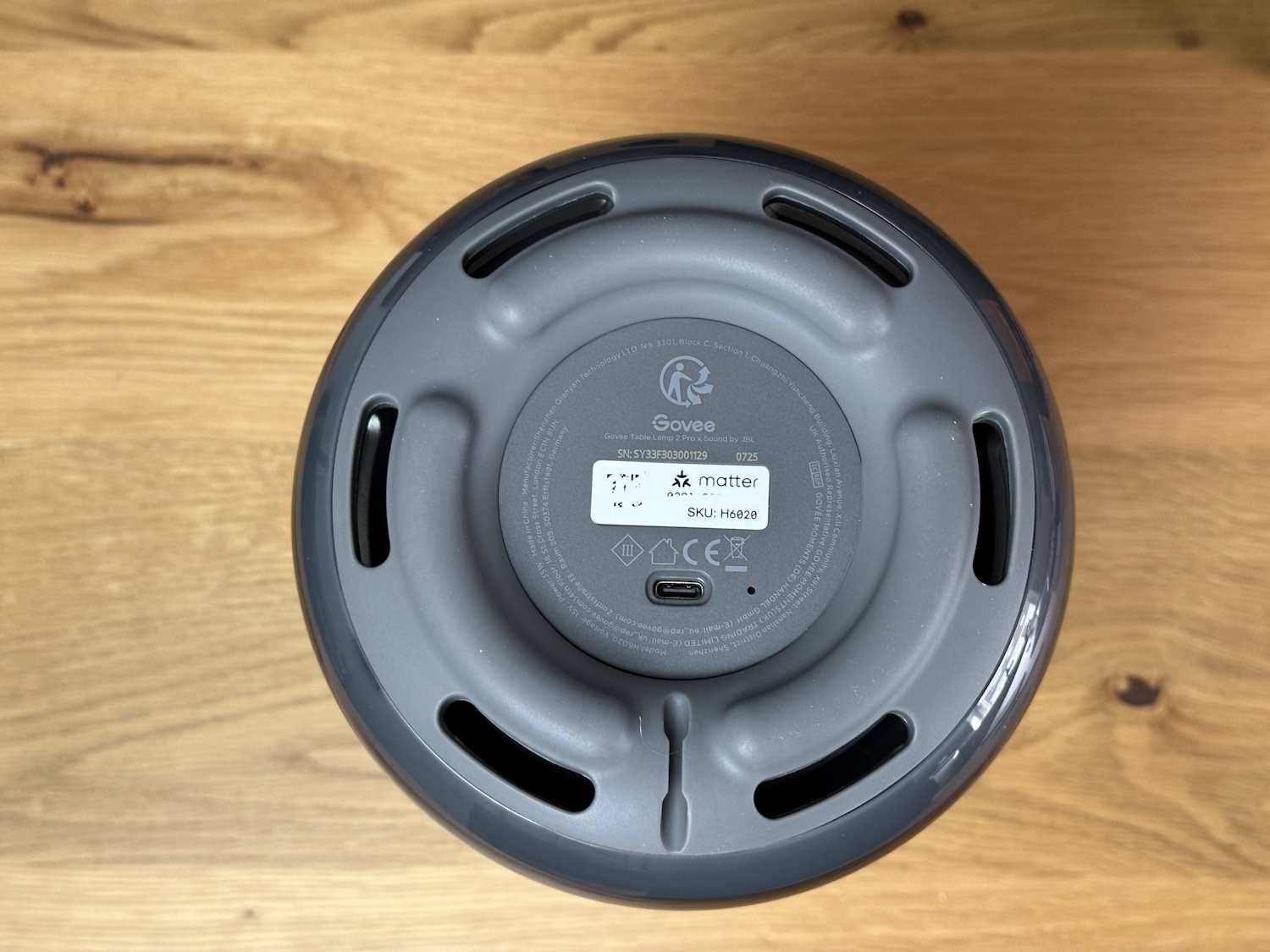 Die Unterseite kommt mit dicken Gummifüßen, hier befindet sich auch inmitten der USB C Ladeanschluss. Für die Matter-Verbindung lässt sich an der Stelle auch der QR Code bzw. Installationscode finden. Für das USB Kabel ist ein kleiner Kanal vorgesehen. Der Kleber an dieser Stelle war bei unserem Modell aber etwas schwach. Beim zweiten Abziehen des USB C Kabels hat sich an dieser Stelle die Gummimatte gelöst – doppelseitiges Klebeband hat geholfen.