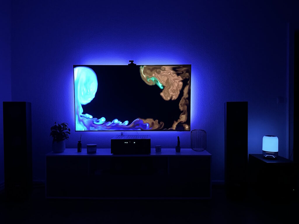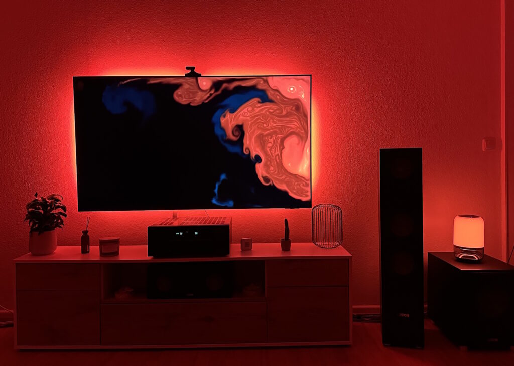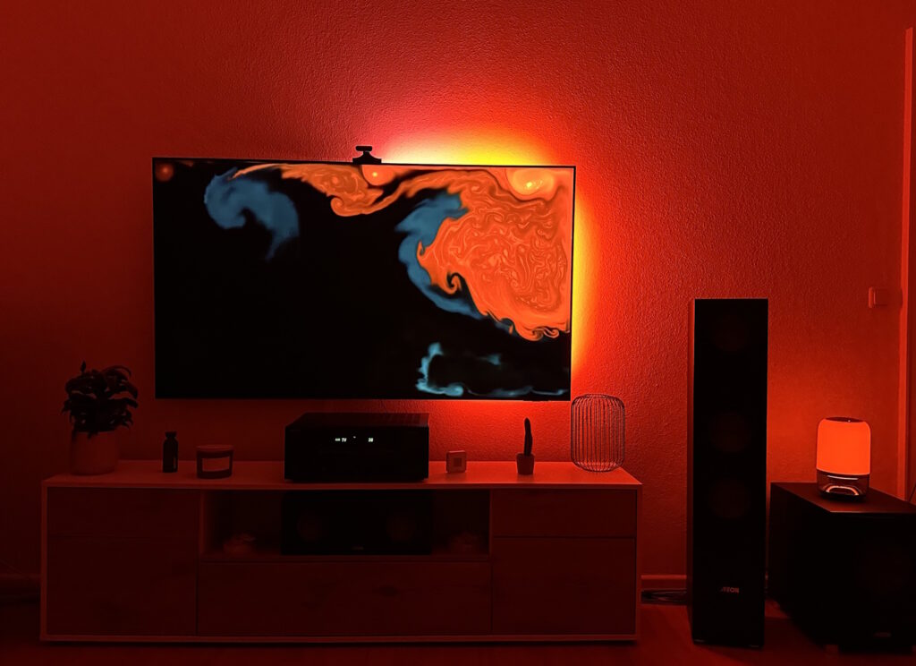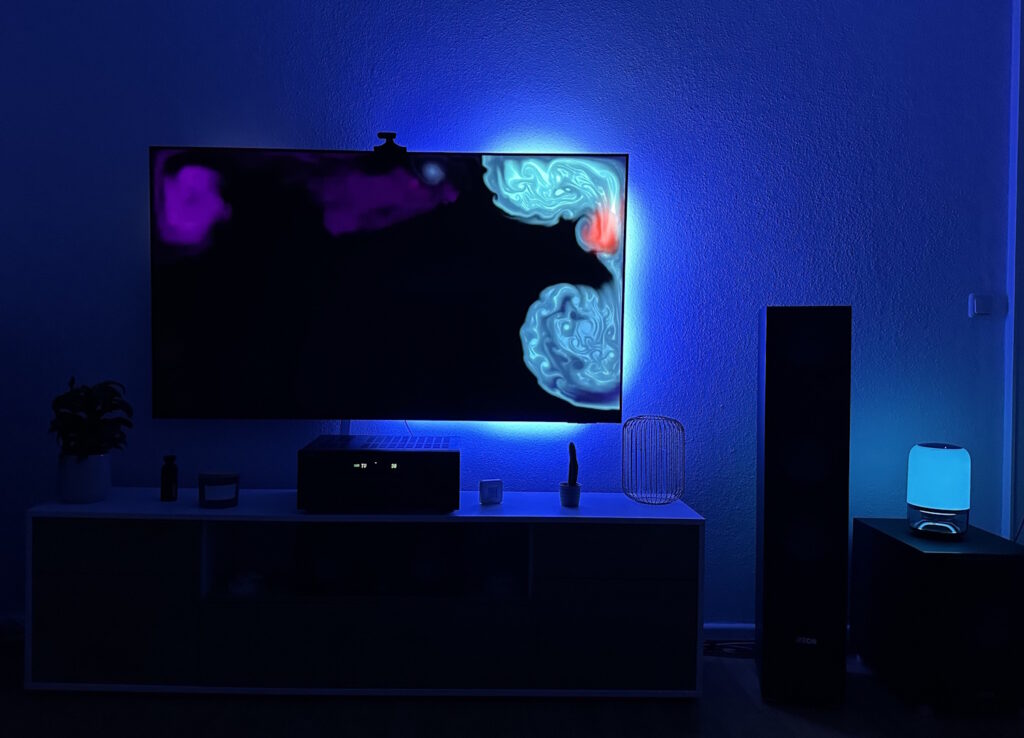 Die ersten beiden Bilder zeigen den gesamten Modus, in der App „Alle“ genannte, alle LEDs sind im Einsatz und zeigen eine gesamtheitliche Farbe, die beiden anderen Bilder zeigen den „Teil“ Modus, der auch entsprechende Bereiche schwarz lässt und somit etwas differenzierter Farben wiedergibt. In dem Beispiel ist das TV Backlight der Master und gibt die Farbe vor, die Tischlampe folgt. Die Latenz ist minimal, sodass quasi gleichzeitig die Farbe entsprechenden angepasst wird. 20 mögliche Positionen gibt die Govee App her. Das Beispiel befindet sich in der vorherigen Galerie, damit sollten die meisten Bereiche, in denen man weitere Hintergrundbeleuchtung aufstellen kann, abgedeckt sein.