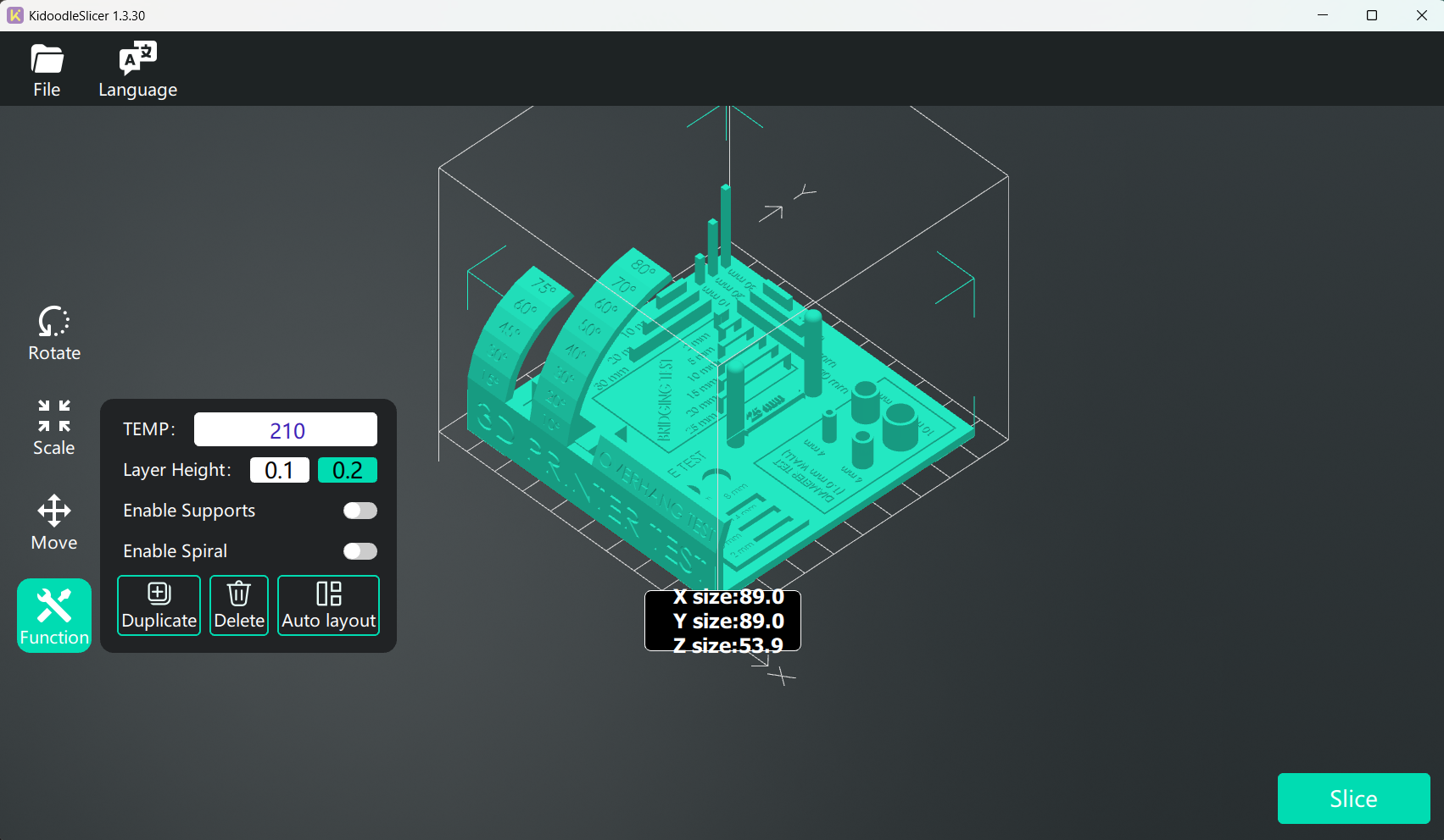 Der Kidoodle Slicer bietet einfache Anpassungen wie drehen, bewegen, skalieren und simple Druckeinstellungen wie die Temperatur und Layerhöhe 0,1 oder 0,2. Neben dem Aktivieren von Supportstruktur und dem automatischen Ausrichten des Bauteils sowie des Kopieren von Bauteilen besteht hauptsächlich die Möglichkeit den gCode zu generieren. Dieser kann mittels USB Stick transferiert werden, auf die WLAN Funktion des Druckers wird kein Zugriff genommen.