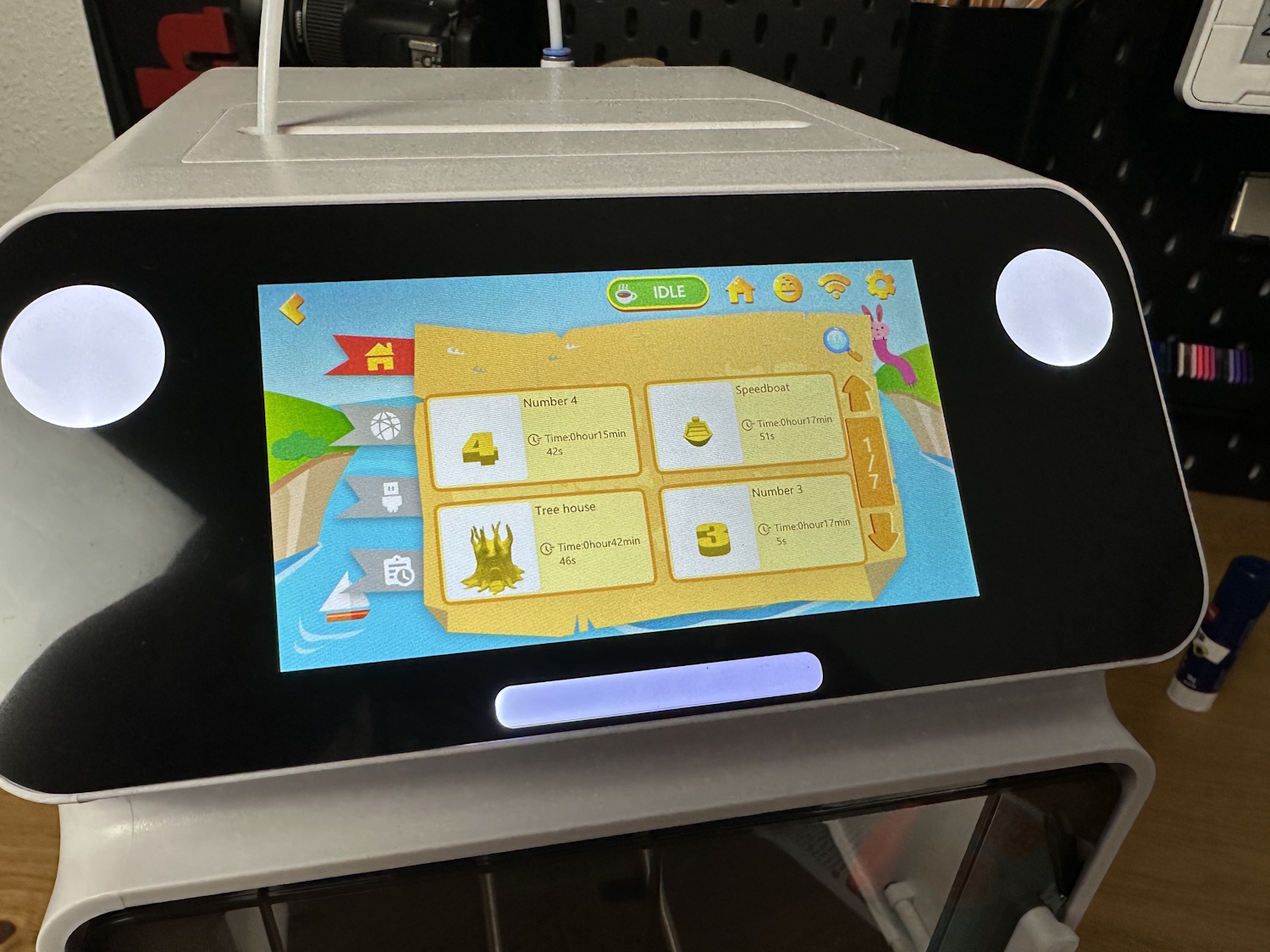 Die Bedienung ist generell sehr Intuitiv, denn wenn einmal das Filament geladen ist und die Grund Z Einstellung vollzogen ist, können die Kids selbstständig alles bedienen. Nach dem Start braucht es nämlich nur noch 3 Tastendrucke und der PrintyGo legt los. Bei den kurierten Modellen sind manchmal aber auch Modelle mit Spitzen dabei, die vielleicht nicht so ganz kindergerecht sind – z.B. das Baumhaus, was wir als ersten Testdruck zeigen.