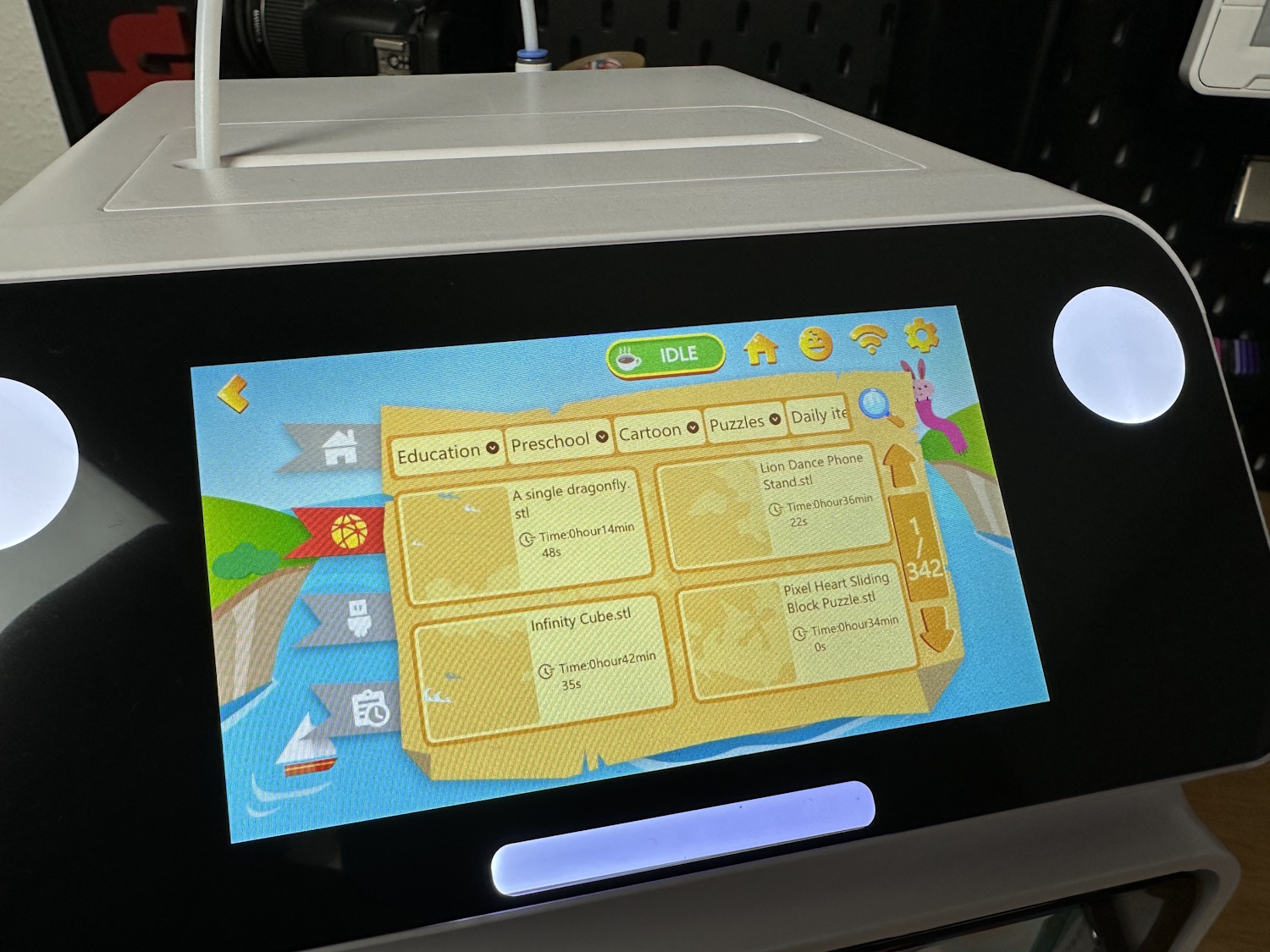 Die Hauptsteuerung geschieht aber eigentlich am Drucker direkt. Das Hauptmenü bietet den Absprung in die Modellbibliothek oder einem Zufallsdruck. Die vier Logos oben rechts stehen für Kontaktdaten zum Support, aktivieren bzw. deaktivieren vom Kindermodus, Netzwerkeinstellungen und allgemeine Einstellungen.