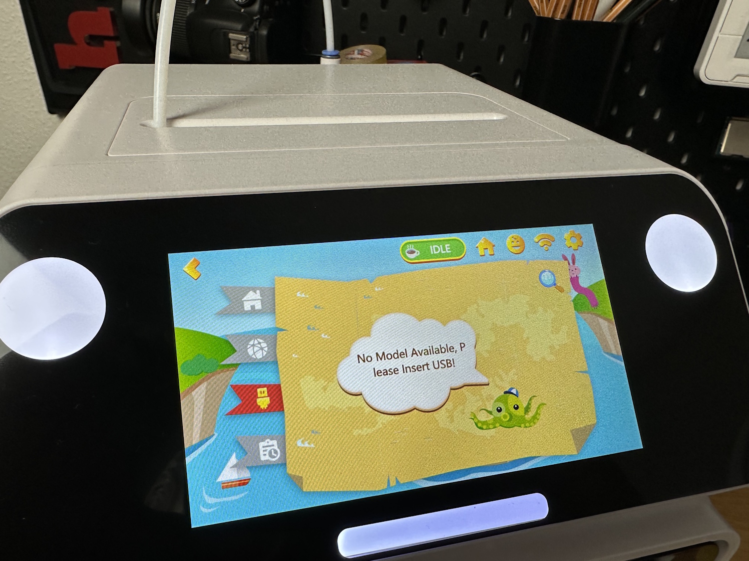 Weiter geht es mit dem USB Stick, denn über UltiMaker CURA oder den Kidoodle Slicer lassen sich auch Modelle selbst slicen und per USB Stick am Drucker drucken. So haben wir z.B. den Autodesk Testdruck drucken können. Bisschen komisch ist dabei die zwingende Formatierung des USB Sticks mit einem Ordner Namens „kidoodle“ im Hauptverzeichnis, der alle gesliceten Dateien enthält. Ansonsten werden keine druckbaren Dateien gefunden.