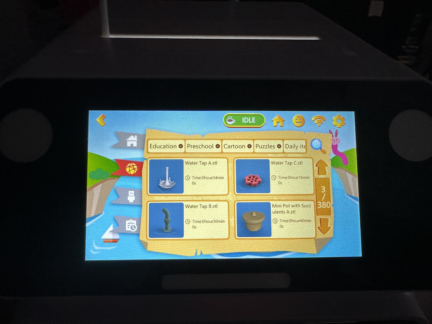 Über „Start Printing“ gelangen wir zur Modellbibliothek. 28 Modelle sind bereits vorgeladen und können direkt mit dem beiliegenden PLA Testmaterial gedruckt werden. Hier der Hinweis, druckt in jedem Fall den großen Spulenhalter. Seite 2 sowie dessen Mutter auf Seite 4. Diese Modelle sind über das Haus Logo zu finden. Der Globus eröffnet die Welt zu den von Kidoodle kurierten Modellen aus dem Internet. Zu beginn des Tests im November waren hier 1368 Modelle verfügbar. Im laufe des Monats kamen nochmals 152 Modelle dazu. Kidoodle erweitert also konstant die Bibliothek von direkt druckbaren Modellen. Teils bestehen diese auch aus mehreren Teilen, die dann aber einzeln aufgeführt und später einfach zusammengesteckt werden. Somit können auch mehrfarbige Drucke möglich gemacht werden. Mehr dazu seht ihr im nächsten Kapitel. Die Mehrfarbigkeit, wie sie bei den Produktbildern gezeigt wird, wird nicht geboten und ist eher etwas für späteres anmalen.