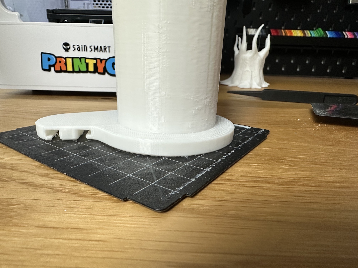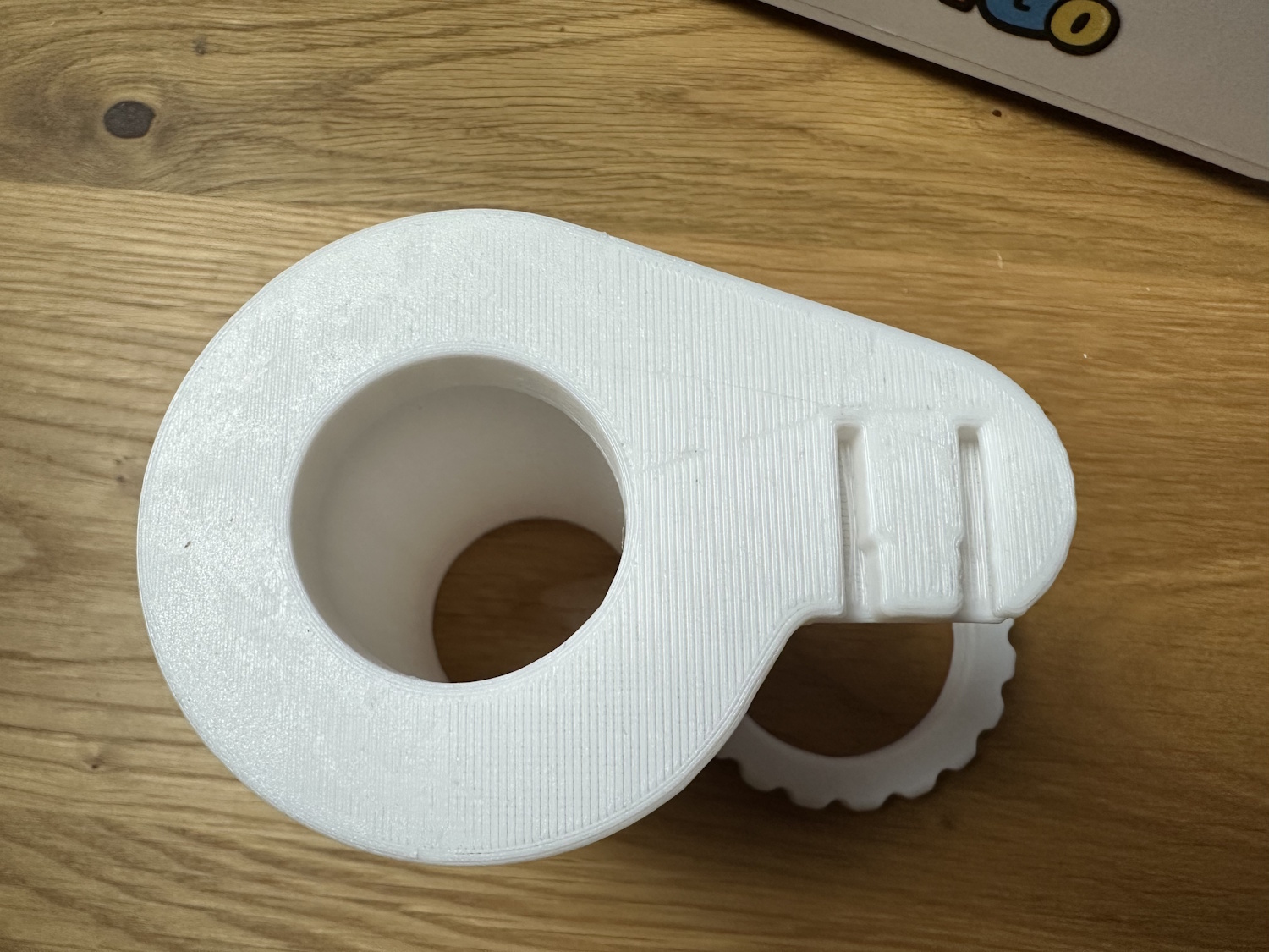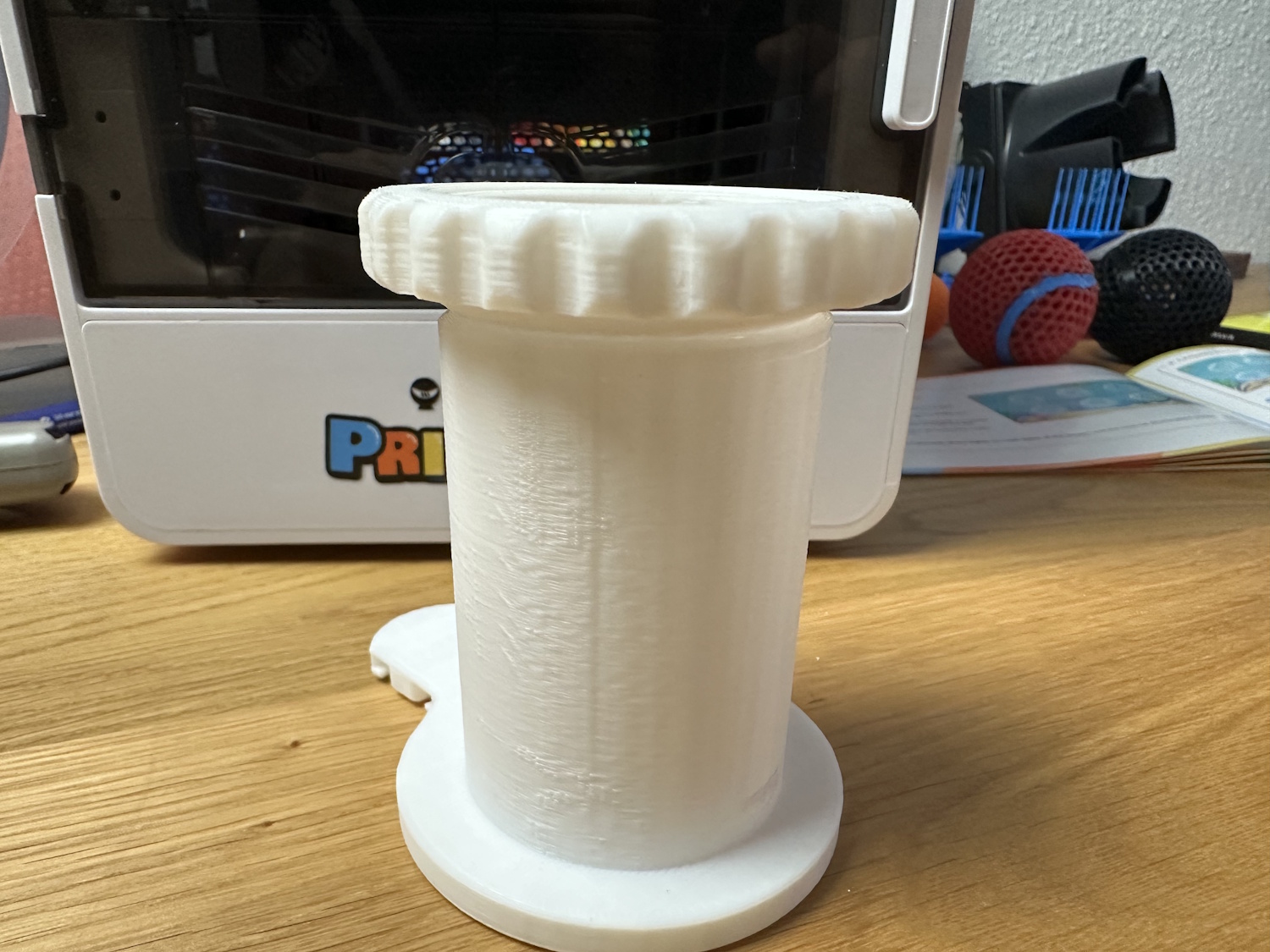 Der bereits erwähnte Spulenhalter für die 1 kg Spulen kam auch sauber heraus. Ebenso wie beim Baumhaus haben sich manche Ecken gelöst und sorgen für keine ebene Grundfläche. Kleine Blobs aus Filament zeigen sich rund herum, ebenso Z-Banding und ghosting. Es lassen sich also Markel auf der Druckoberfläche erkennen, die über die Rundung abwandern, ähnlich eines Schimmerns.