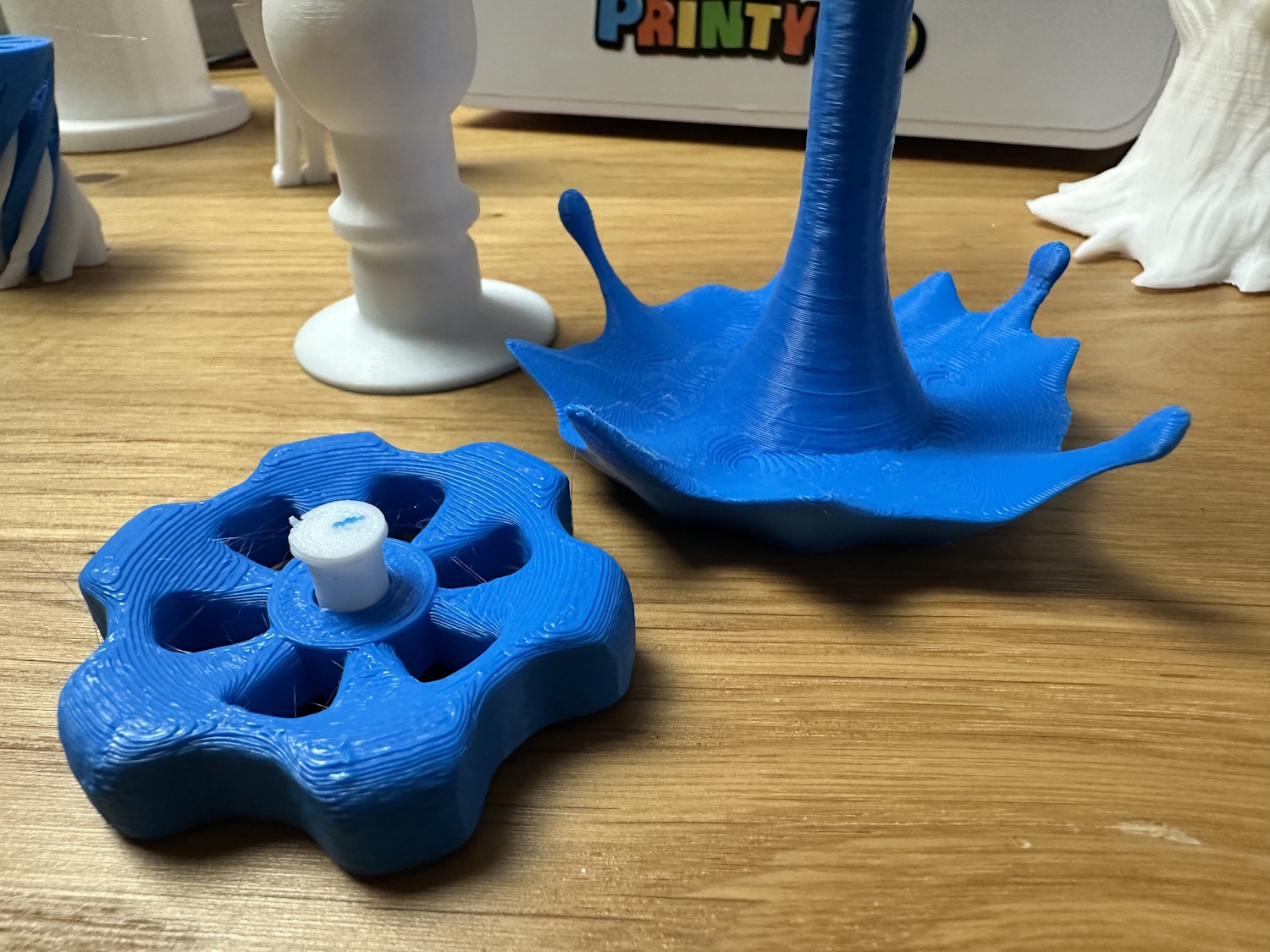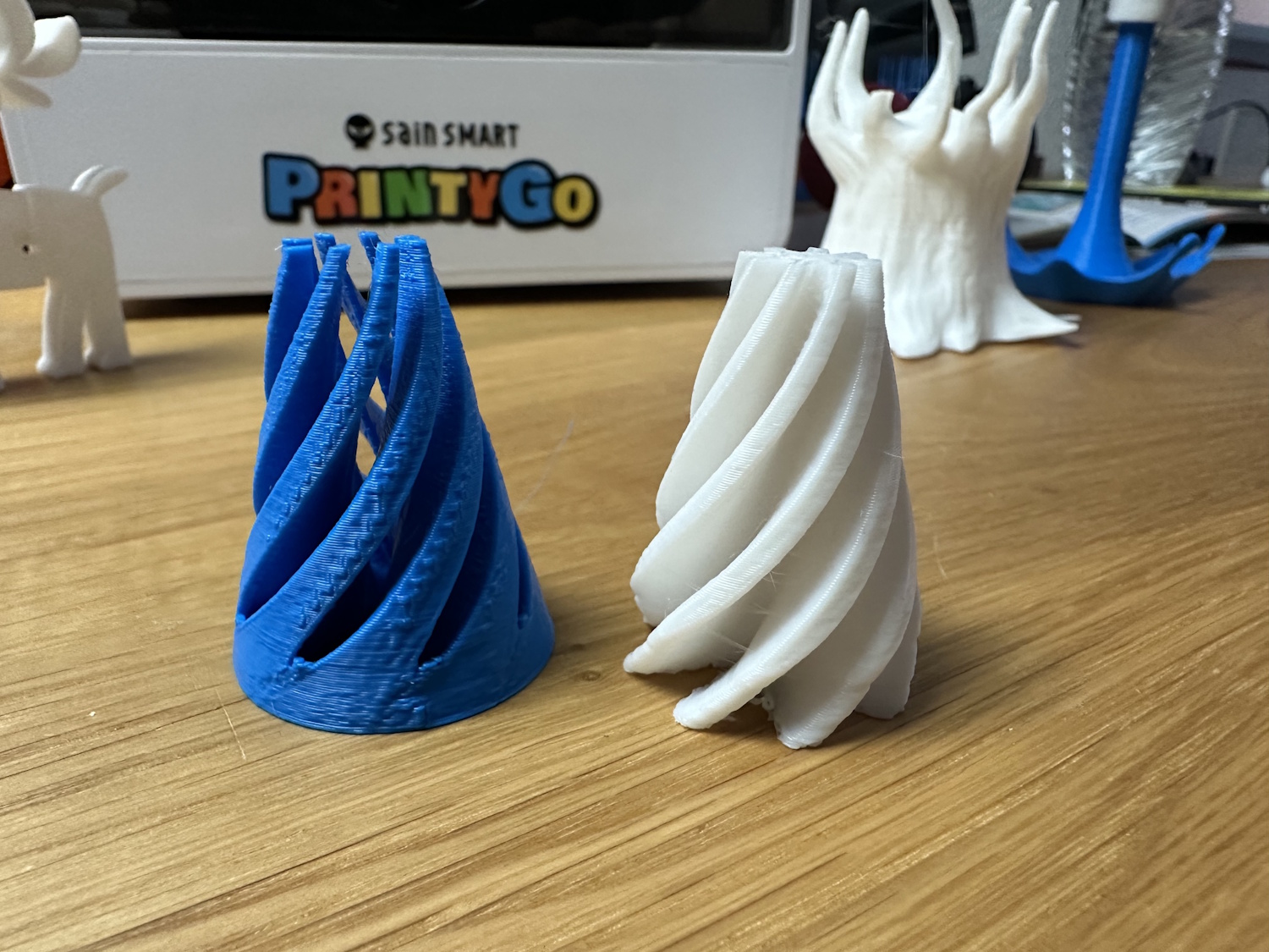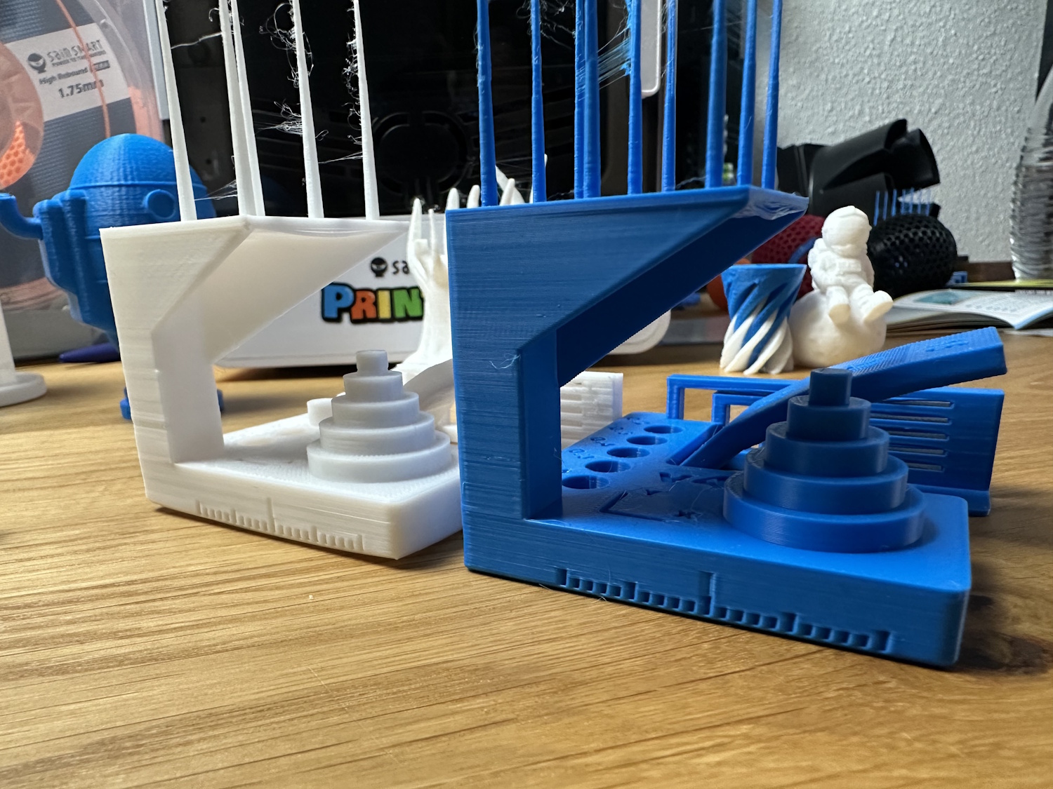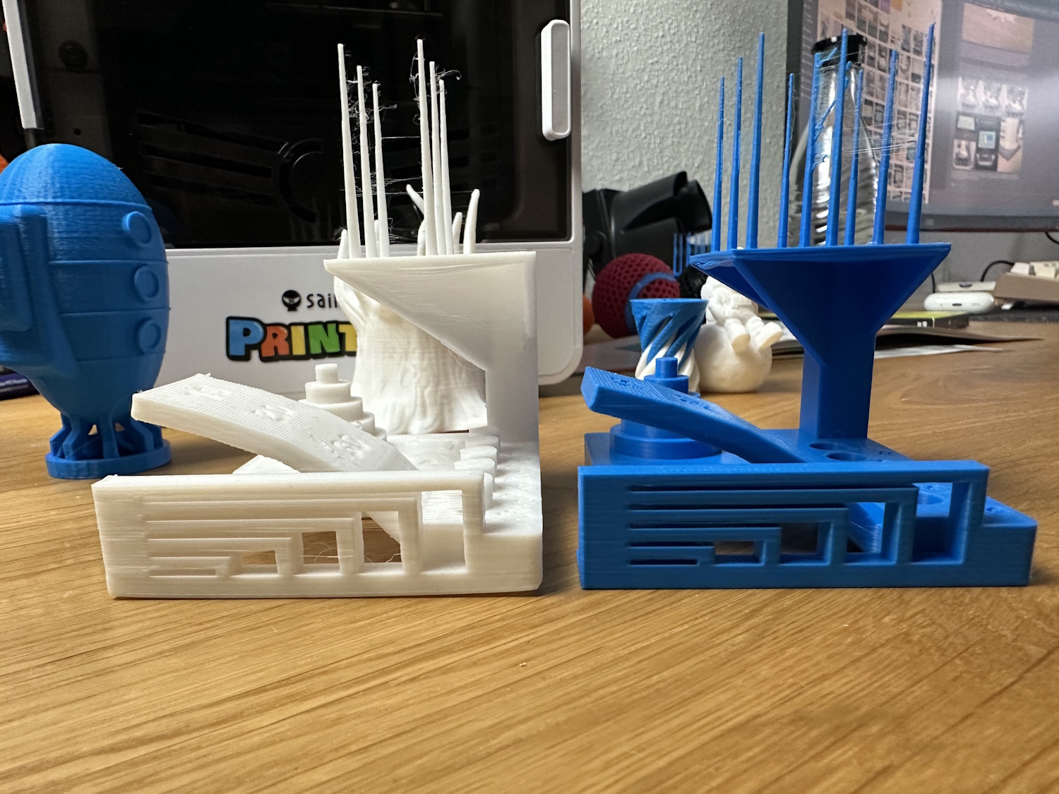 Beim Drucken von Überhängen sieht man auch viele lose Filamentstreifen, die von Kidoodle kurierten Modelle kaschieren dies aber gut, weil sie oft keine Überhänge nötig haben. Stringing hatten beide Drucker oben in den Spitzen, trocknen des Filaments hätte vermutlich eine Verringerung zur Folge.