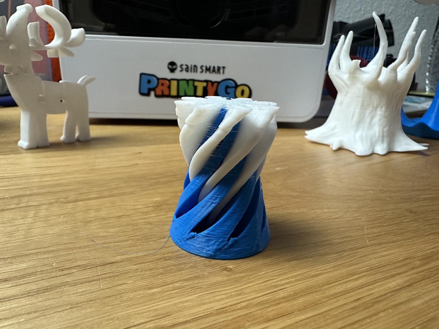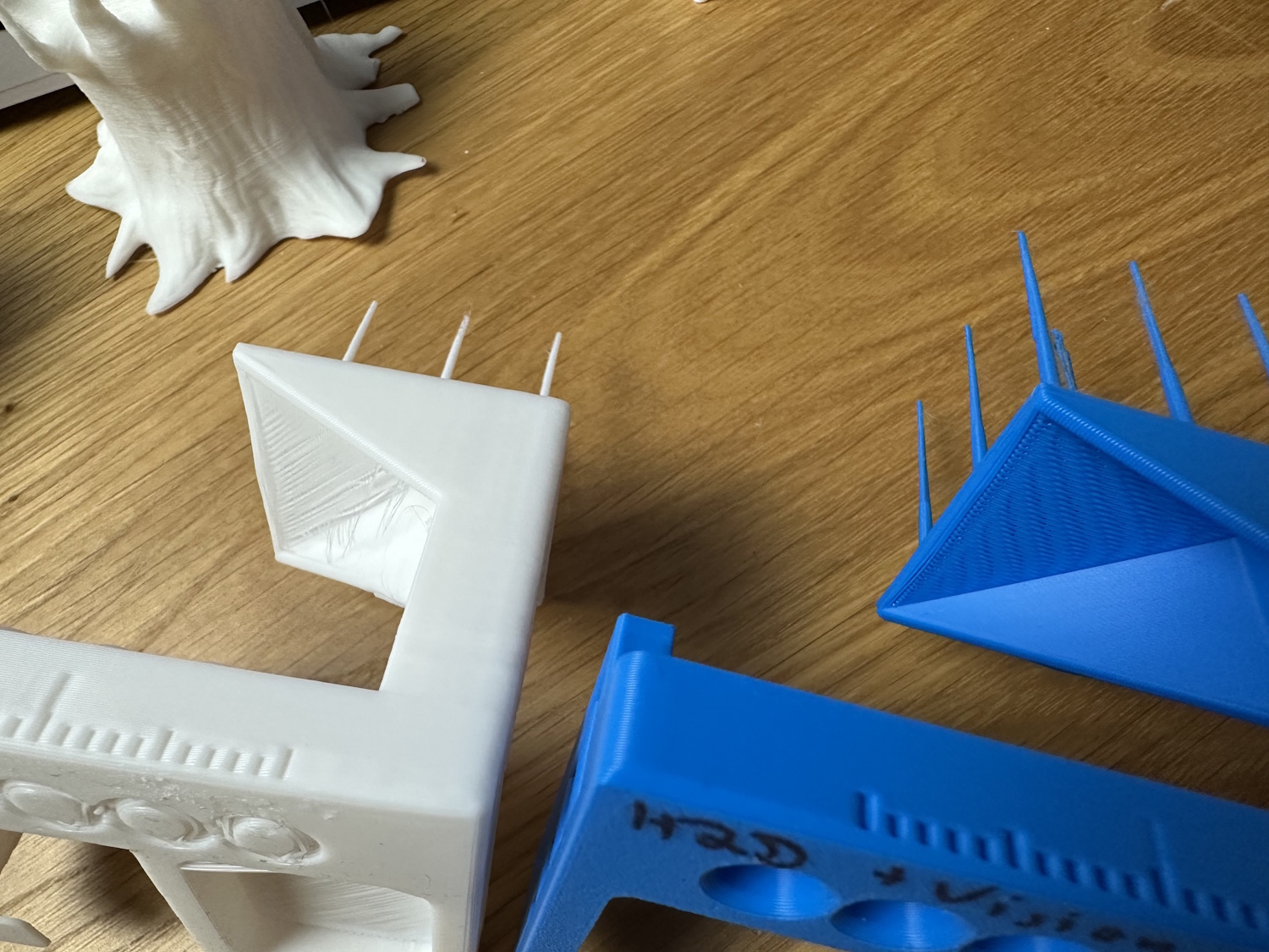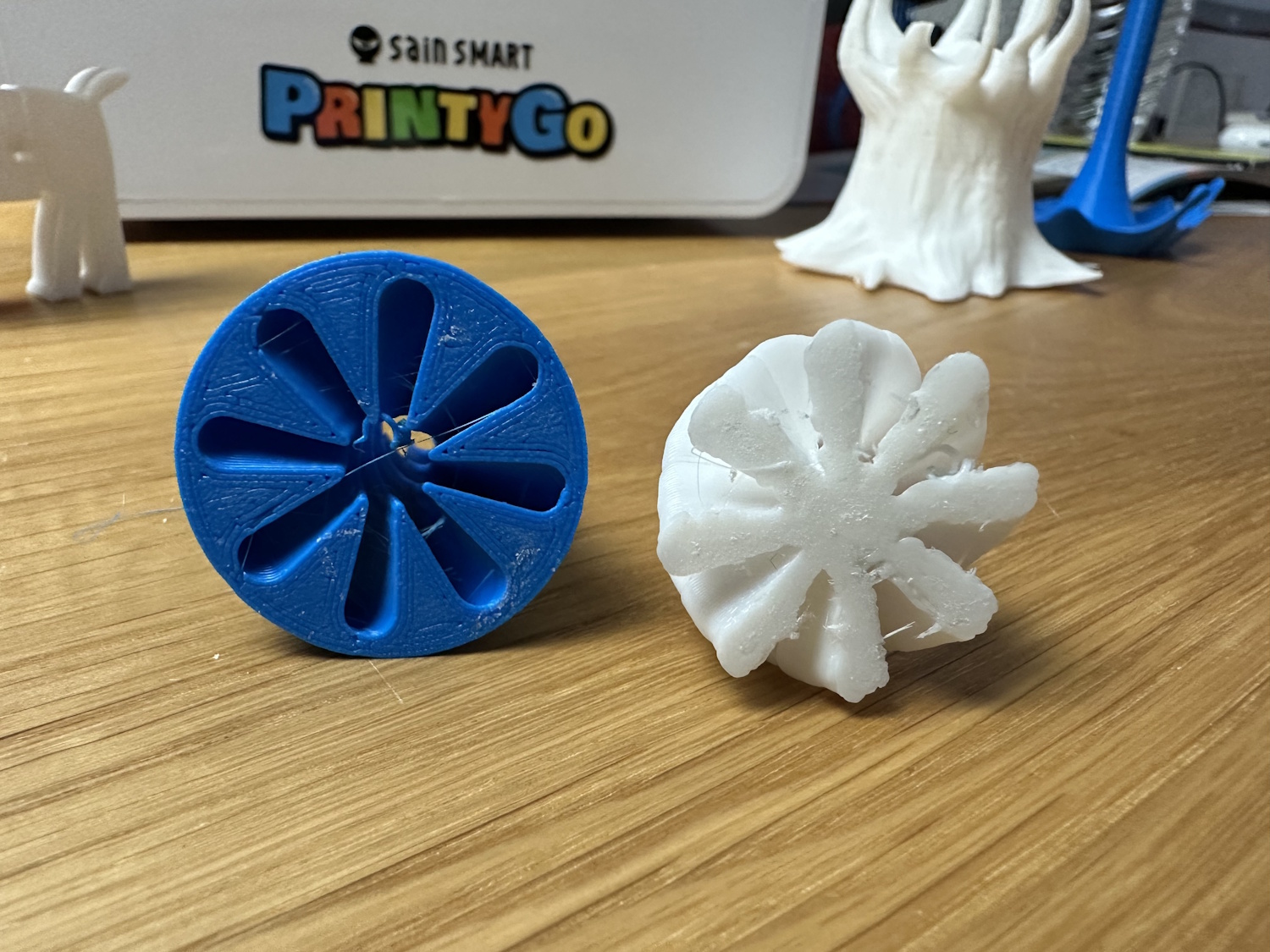 Beim Drucken von Überhängen sieht man auch viele lose Filamentstreifen, die von Kidoodle kurierten Modelle kaschieren dies aber gut, weil sie oft keine Überhänge nötig haben. Stringing hatten beide Drucker oben in den Spitzen, trocknen des Filaments hätte vermutlich eine Verringerung zur Folge.