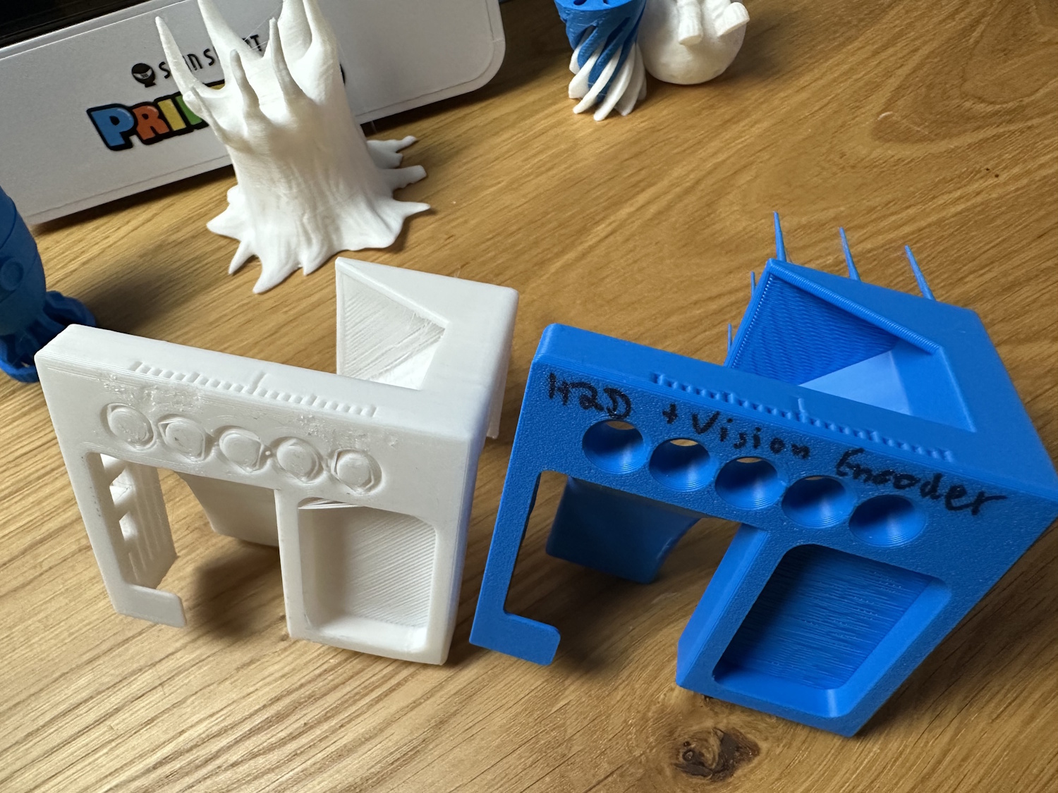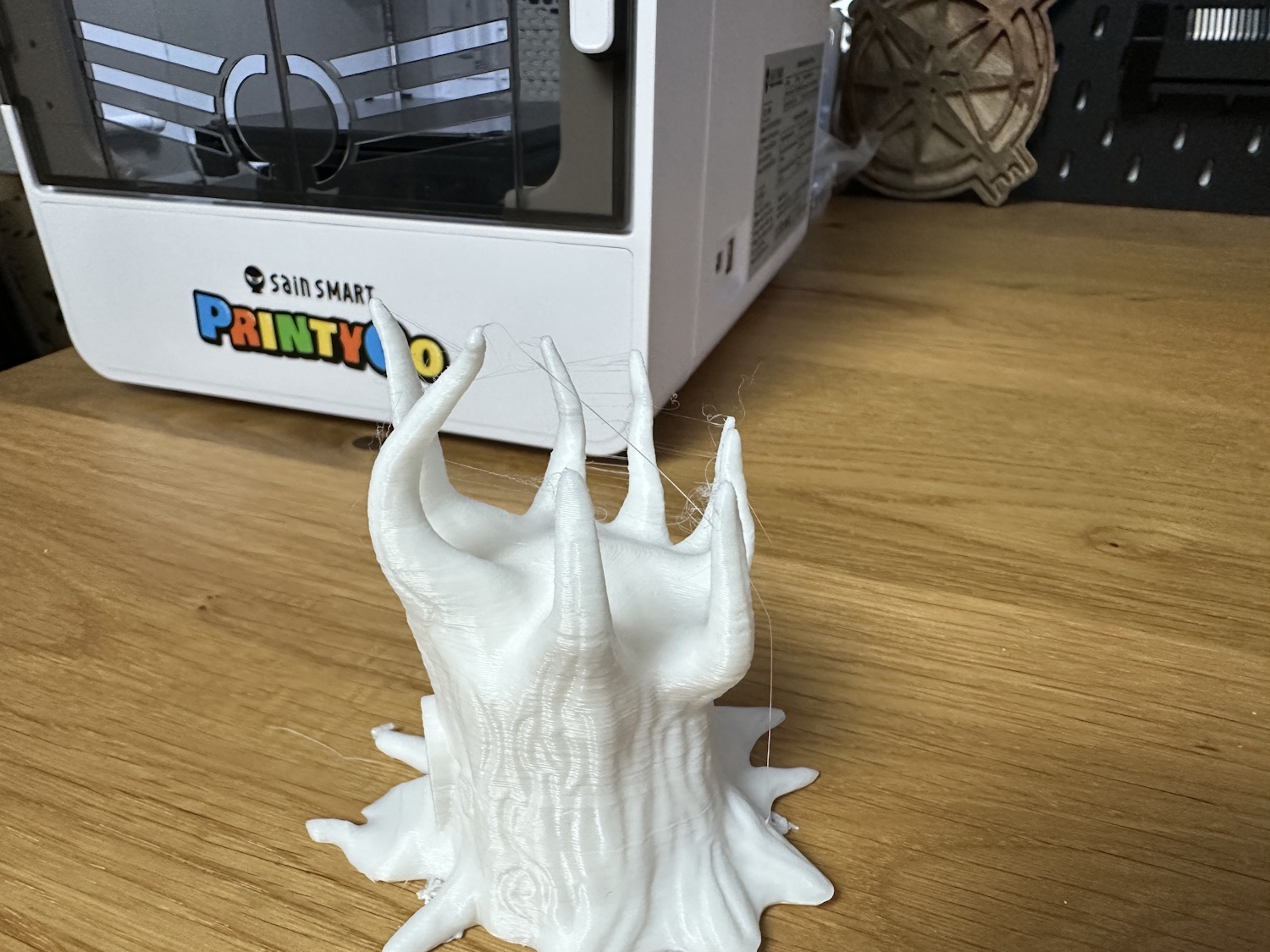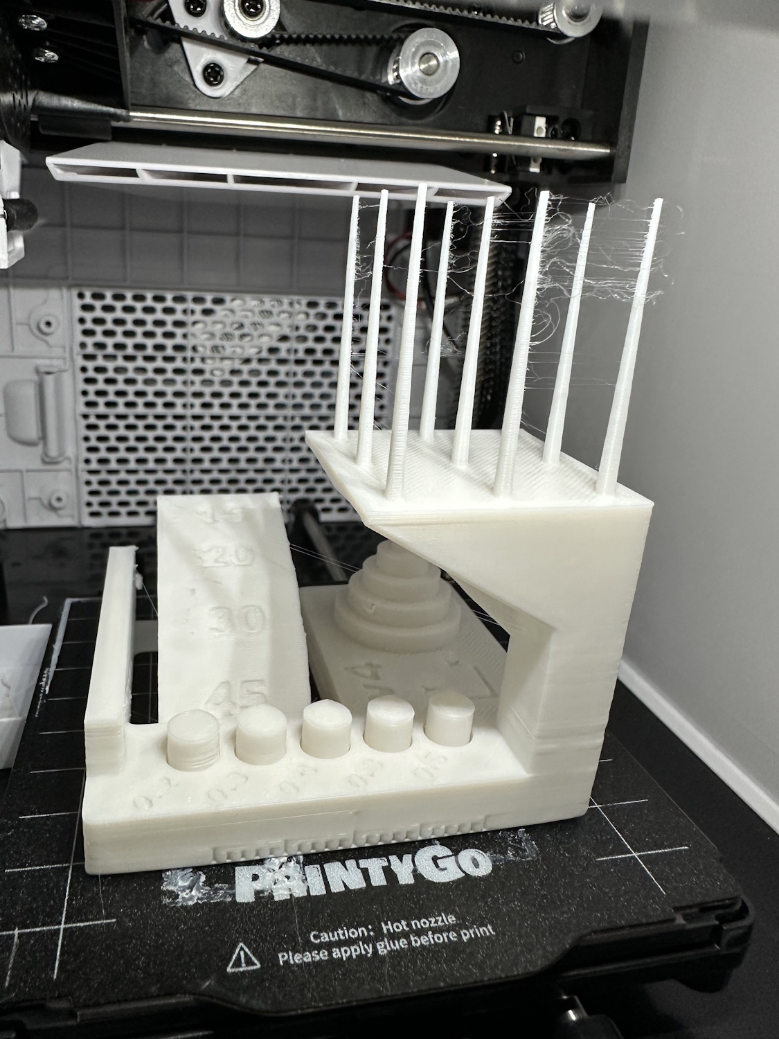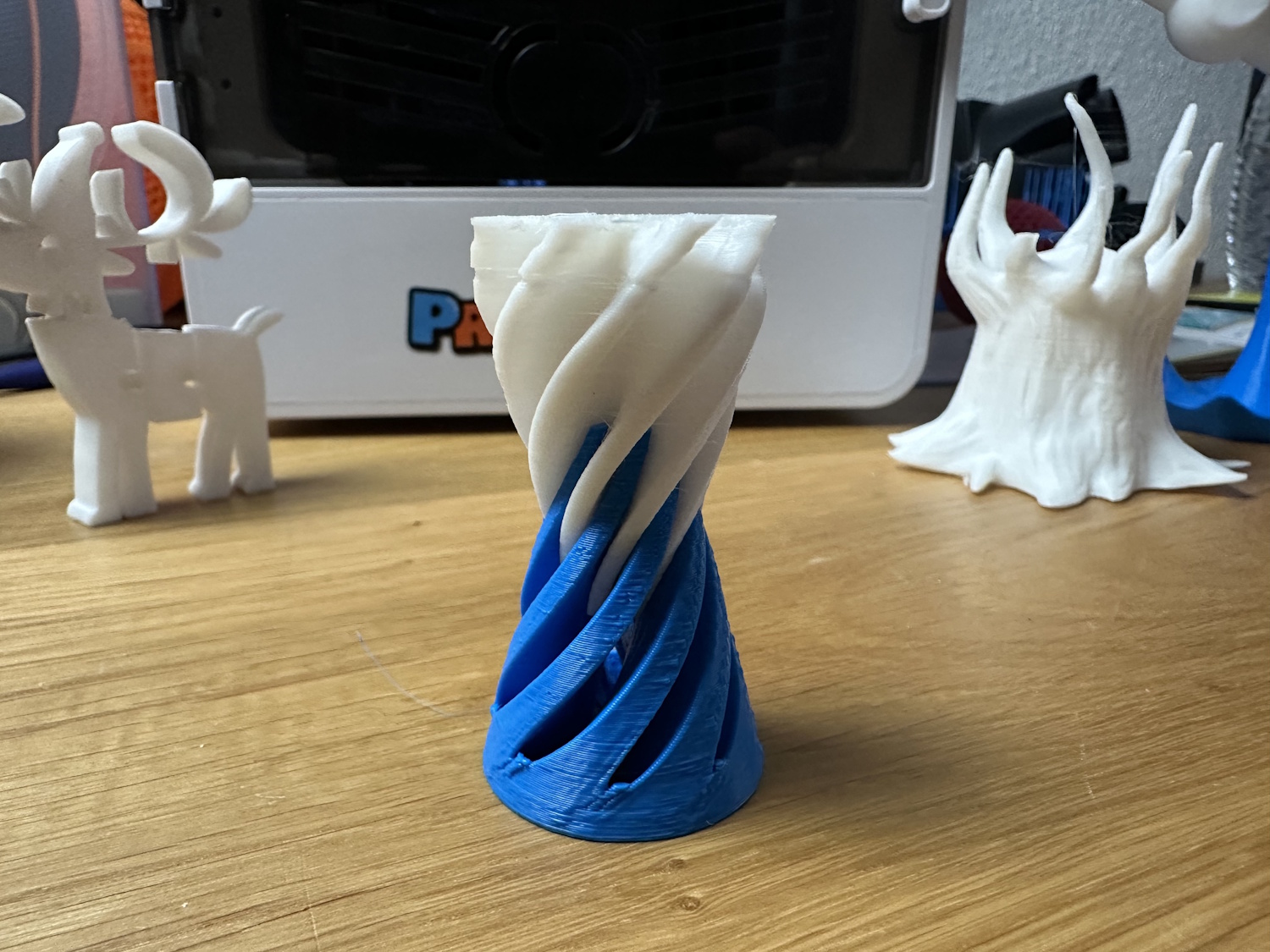 Beim Drucken von Überhängen sieht man auch viele lose Filamentstreifen, die von Kidoodle kurierten Modelle kaschieren dies aber gut, weil sie oft keine Überhänge nötig haben. Stringing hatten beide Drucker oben in den Spitzen, trocknen des Filaments hätte vermutlich eine Verringerung zur Folge.