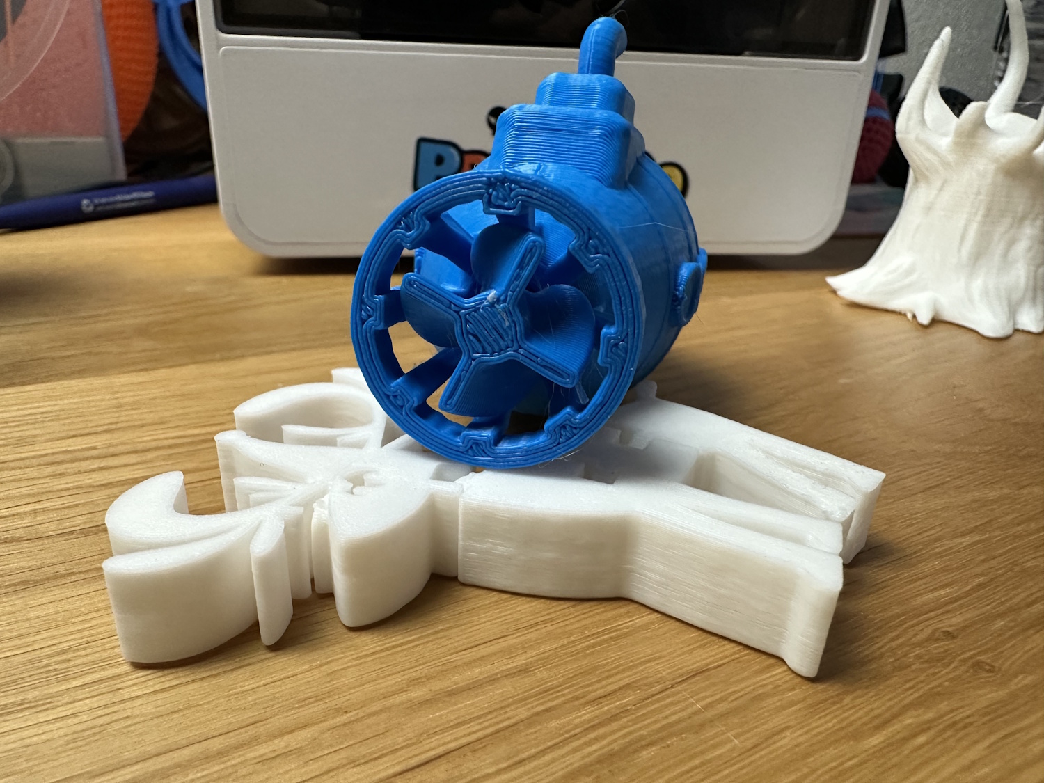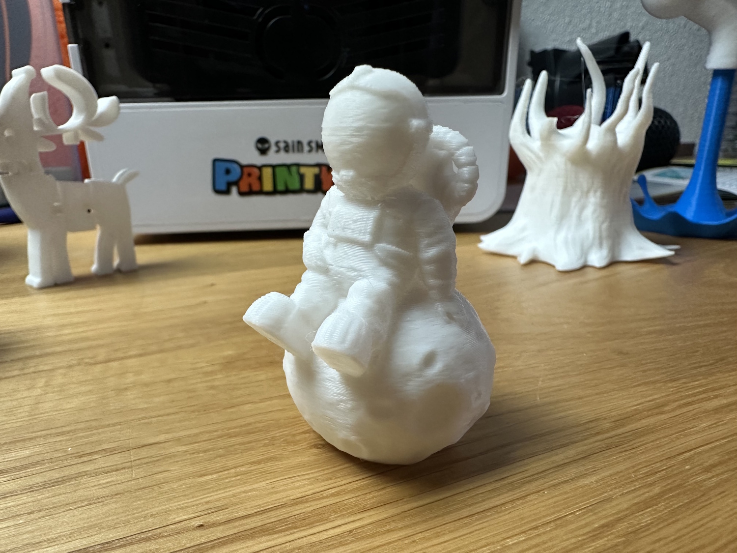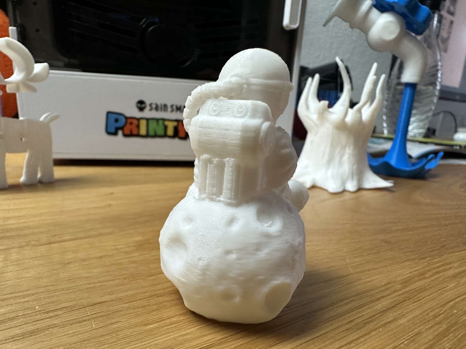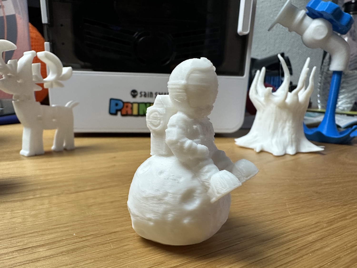 Die Rolle PLA Meta wurde so direkt aus der Packung gedruckt, ohne trocknen und neigte oben bei den Spitzen zu stringing. Die Layer liegen nicht perfekt aufeinander, wodurch ein leichter Versatz auf diversen Höhen zu erkennen ist. Für ein Spielzeug natürlich kein Thema aber es ruft optische Mängel hervor. Das Stringing kann mit einem Feuerzeug leicht entfernt werden, ist dann aber eine Aufgabe für die Eltern. Die Details kommen allerdings sehr schön zur Geltung. Ebenso beim nächsten Modell dem Astronauten auf dem Mond.
