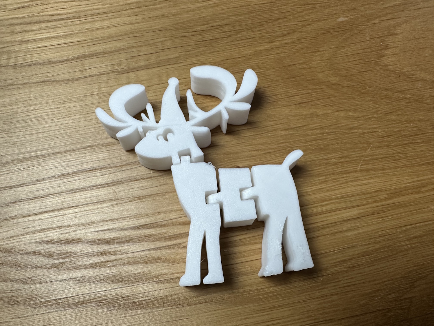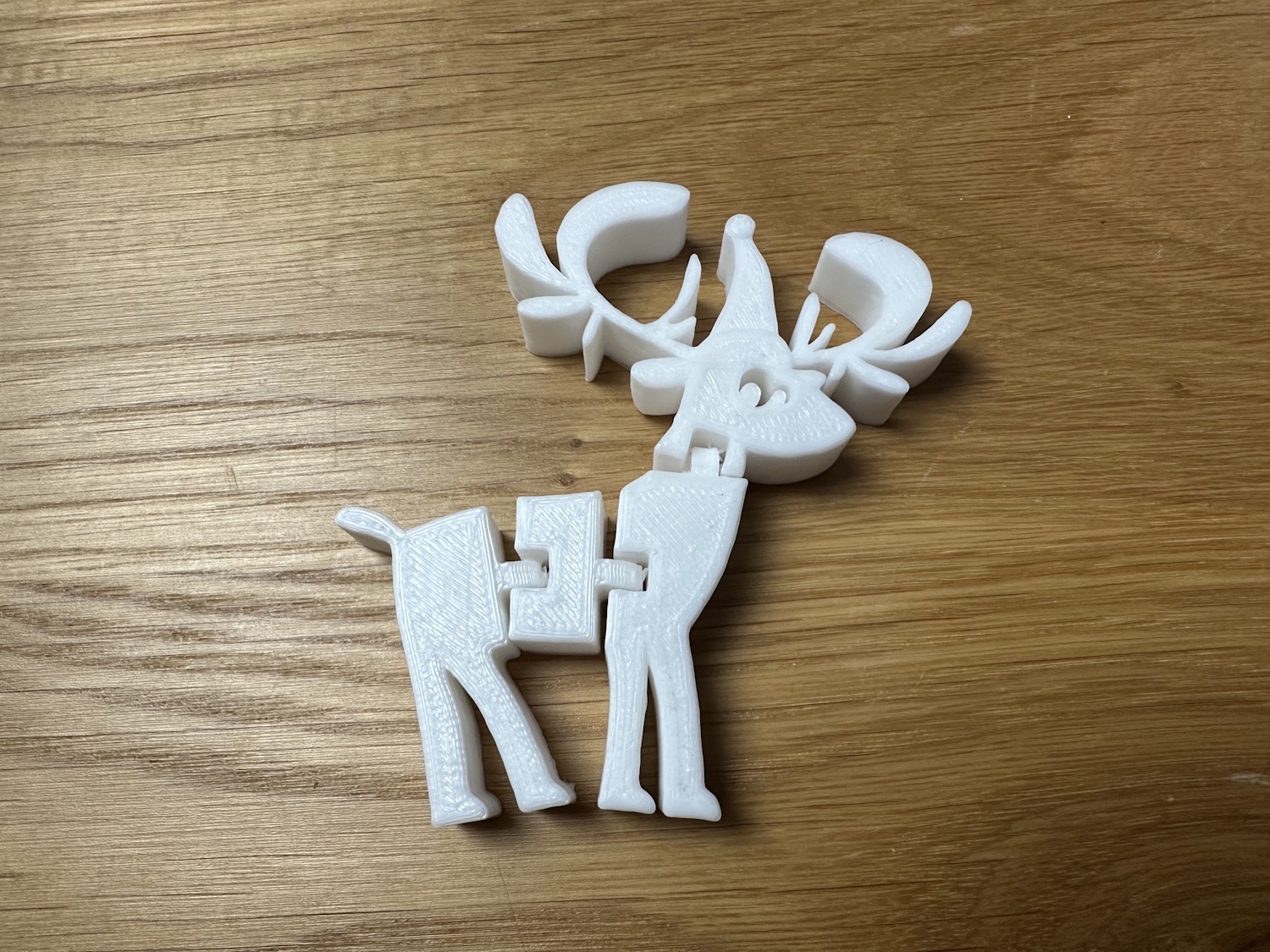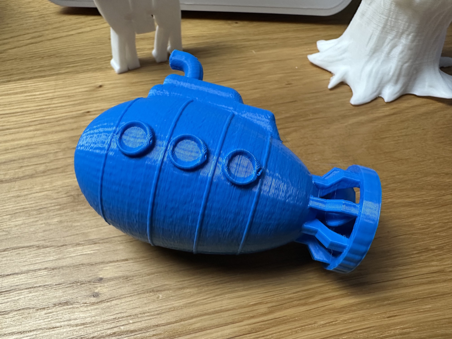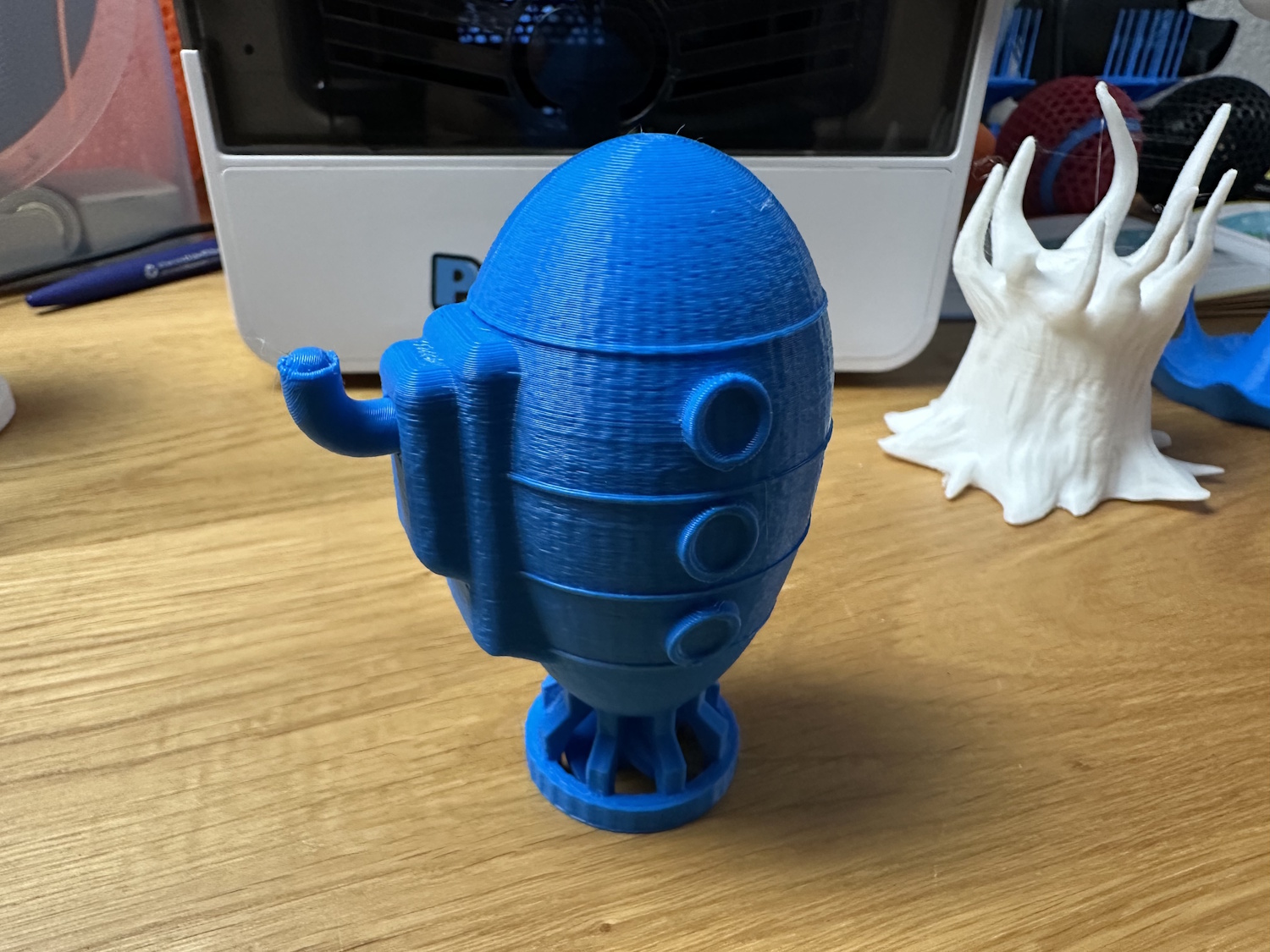 Die Rolle PLA Meta wurde so direkt aus der Packung gedruckt, ohne trocknen und neigte oben bei den Spitzen zu stringing. Die Layer liegen nicht perfekt aufeinander, wodurch ein leichter Versatz auf diversen Höhen zu erkennen ist. Für ein Spielzeug natürlich kein Thema aber es ruft optische Mängel hervor. Das Stringing kann mit einem Feuerzeug leicht entfernt werden, ist dann aber eine Aufgabe für die Eltern. Die Details kommen allerdings sehr schön zur Geltung. Ebenso beim nächsten Modell dem Astronauten auf dem Mond.