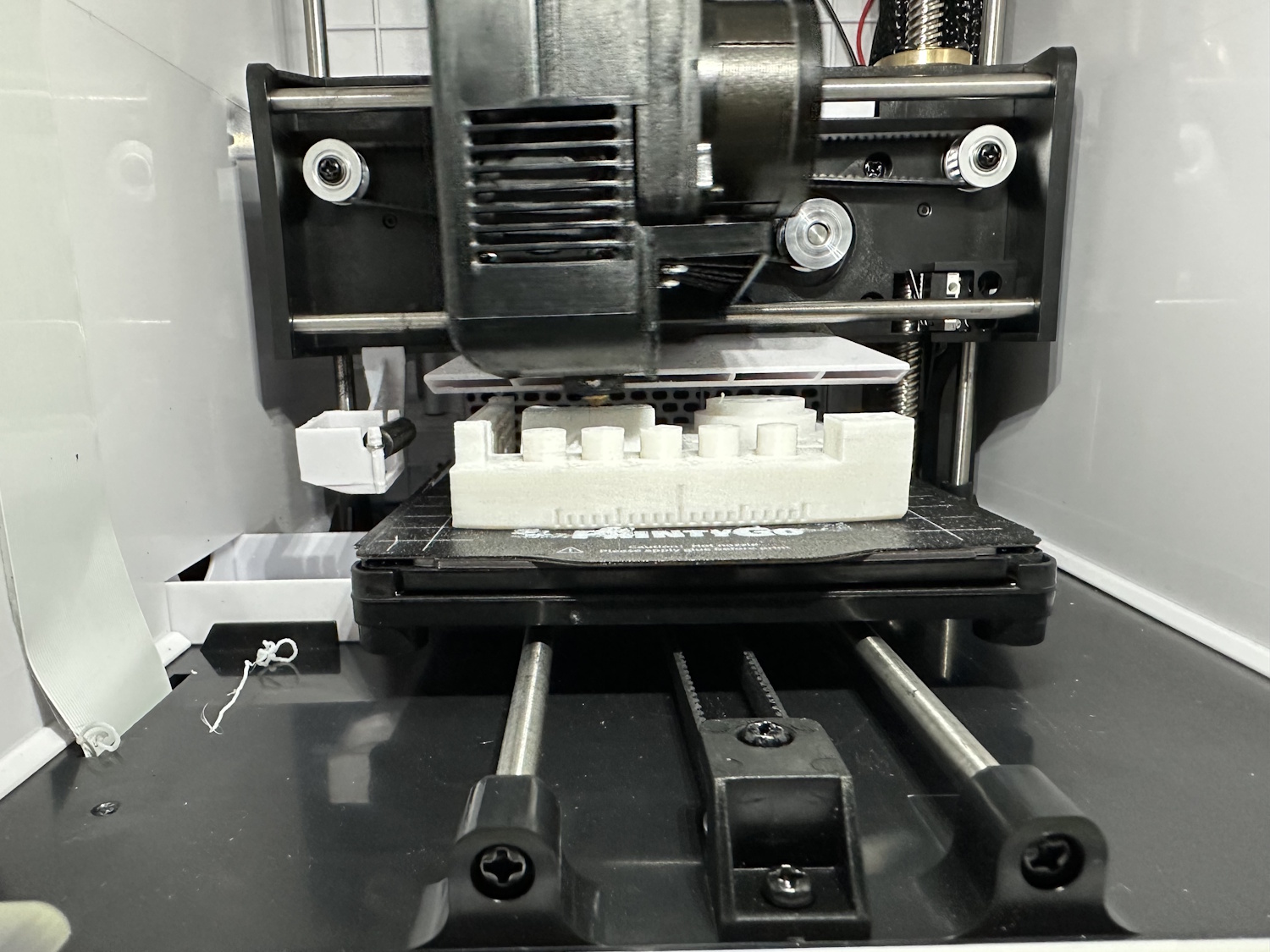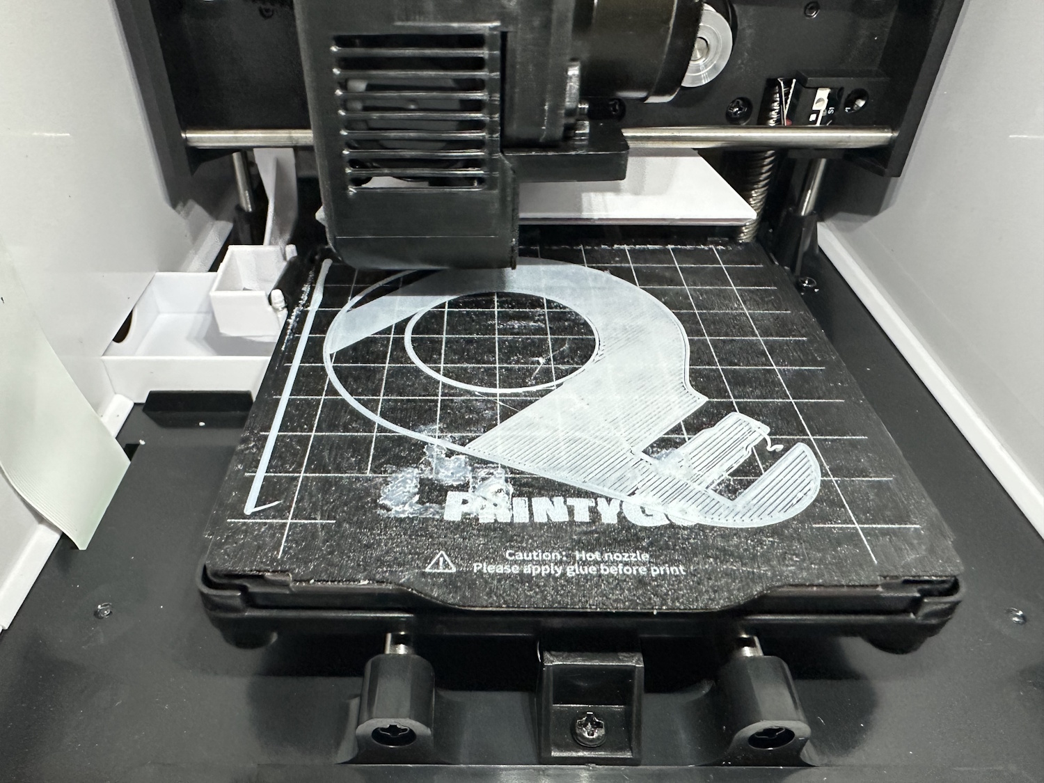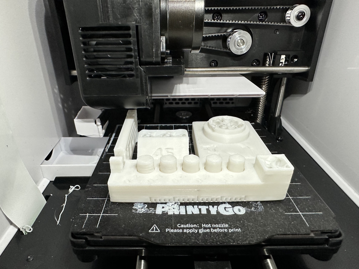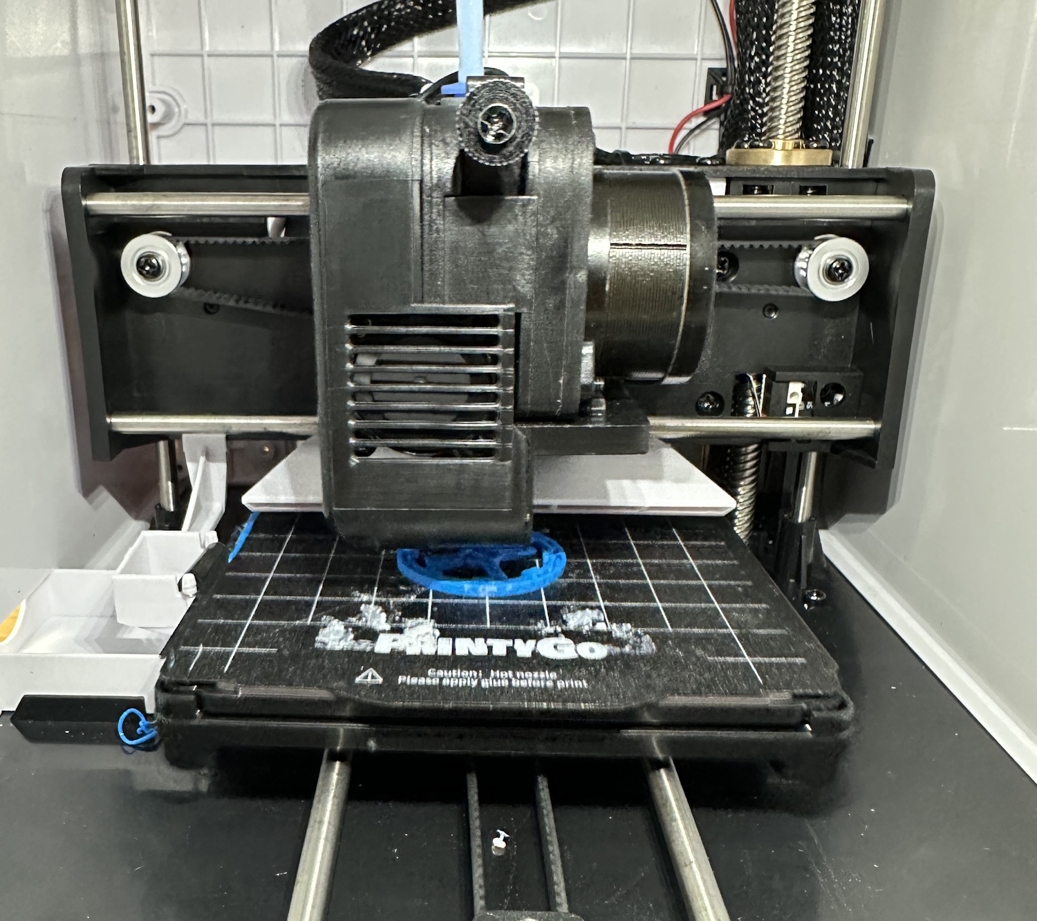 Nach dem Einschalten des PrintyGo´s braucht es nur wenige Klicks um eines der vorgefertigten Modelle zu drucken. Es müssen keinerlei Einstellungen vollzogen werden, lediglich das Druckbett sollte sauber und korrekt eingelegt sein. Es besteht aus biegsamen Federstahl mit einer aufgerauhten Oberfläche, wie man es gängigerweise von anderen 3D Druckern kennt. Im hinteren Bereich sorgen die Ecken für die korrekte Orientierung, die Platte selbst hält magnetisch auf dem Bett.