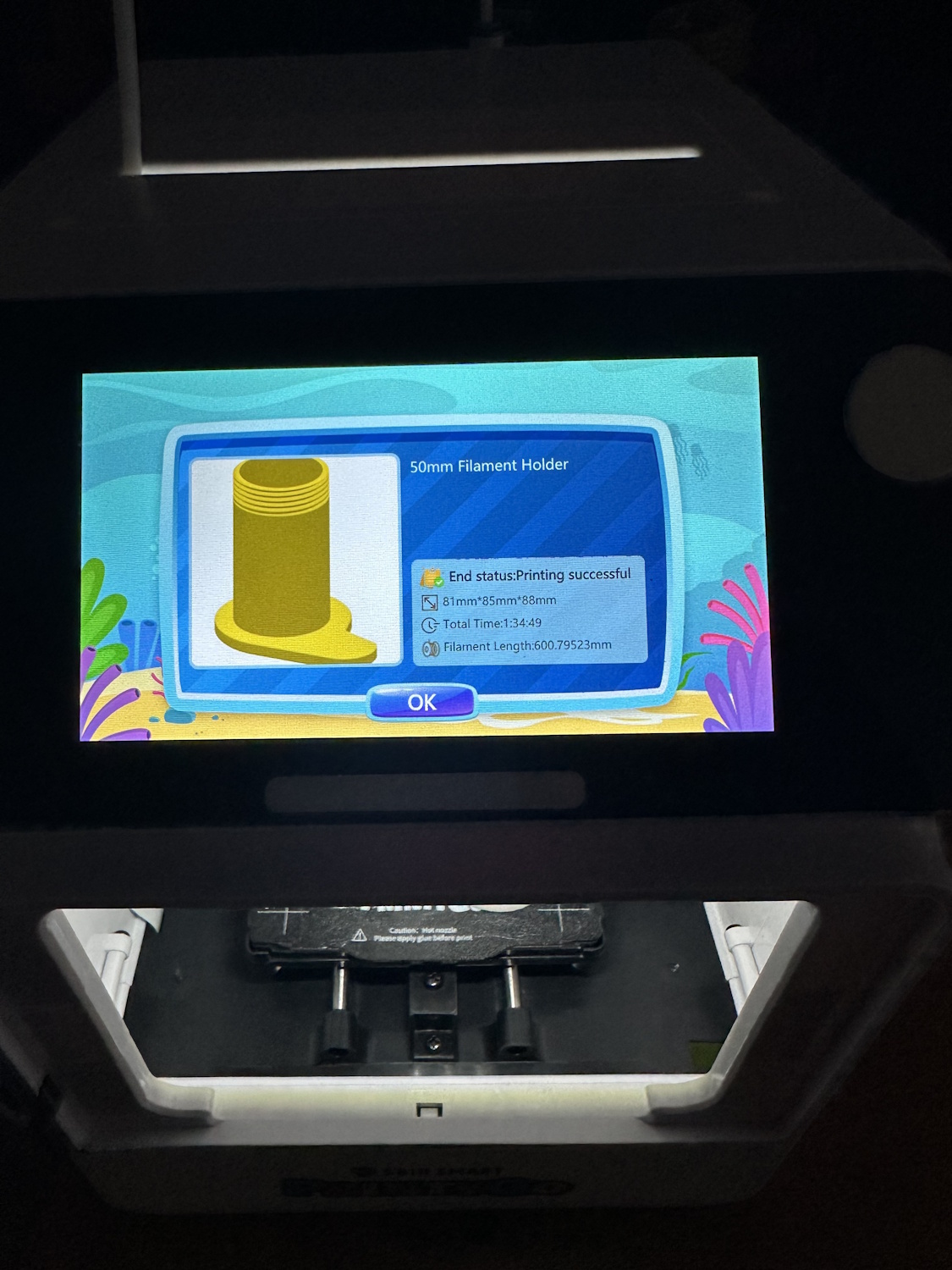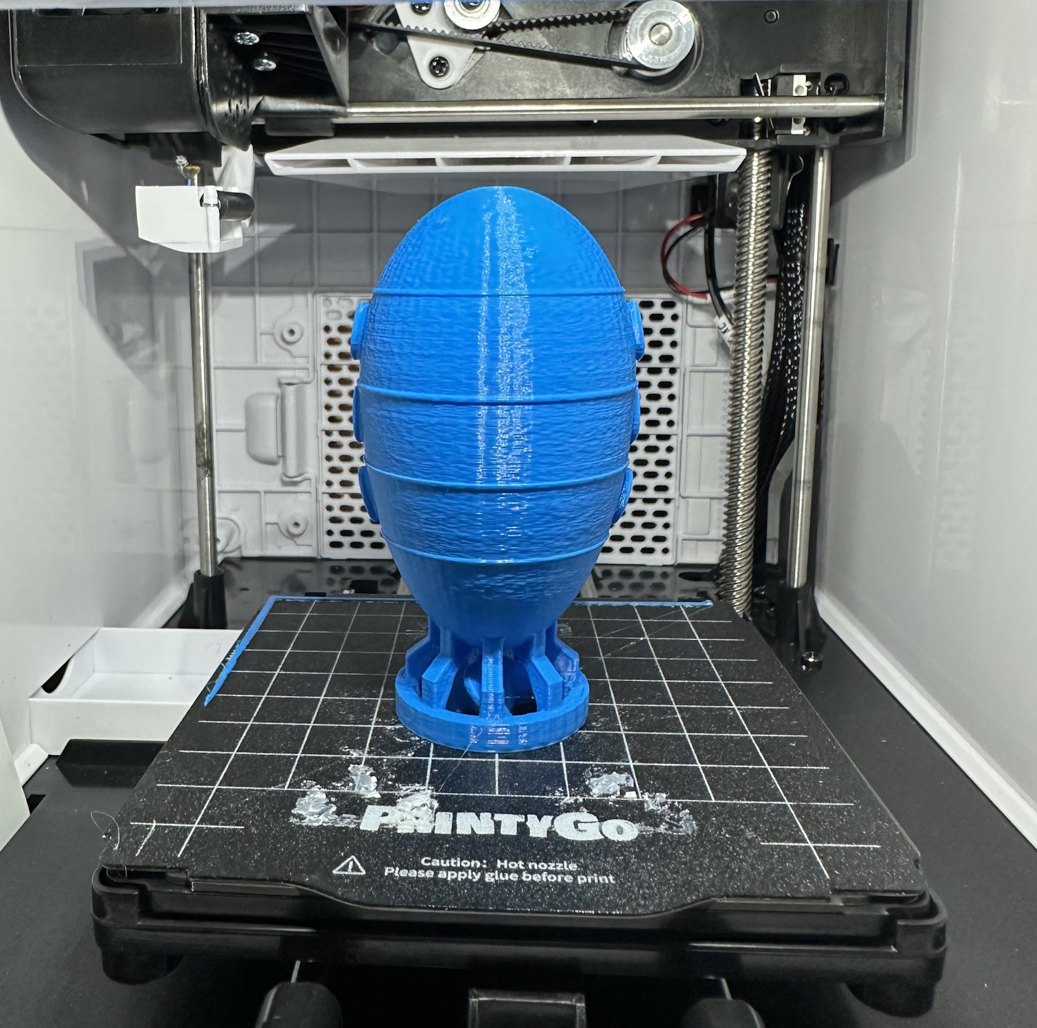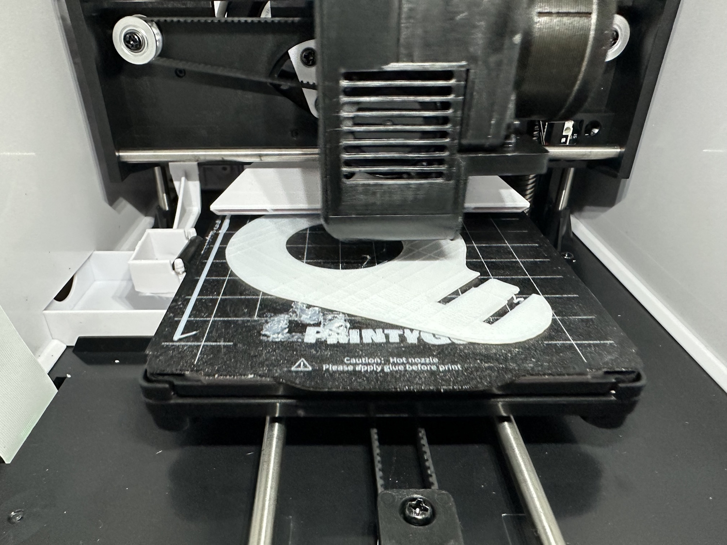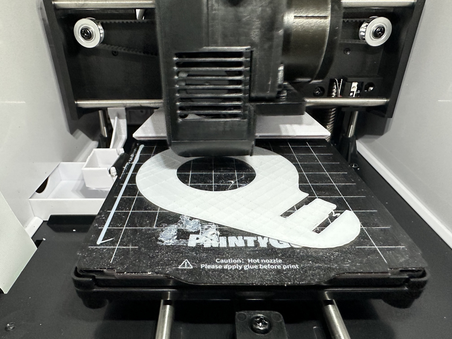 Nach dem Einschalten des PrintyGo´s braucht es nur wenige Klicks um eines der vorgefertigten Modelle zu drucken. Es müssen keinerlei Einstellungen vollzogen werden, lediglich das Druckbett sollte sauber und korrekt eingelegt sein. Es besteht aus biegsamen Federstahl mit einer aufgerauhten Oberfläche, wie man es gängigerweise von anderen 3D Druckern kennt. Im hinteren Bereich sorgen die Ecken für die korrekte Orientierung, die Platte selbst hält magnetisch auf dem Bett.