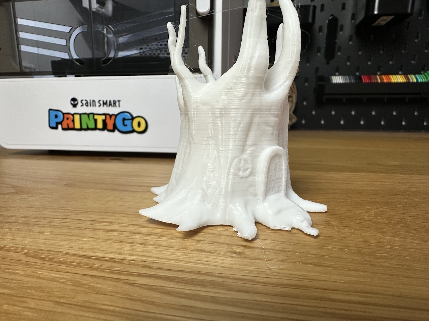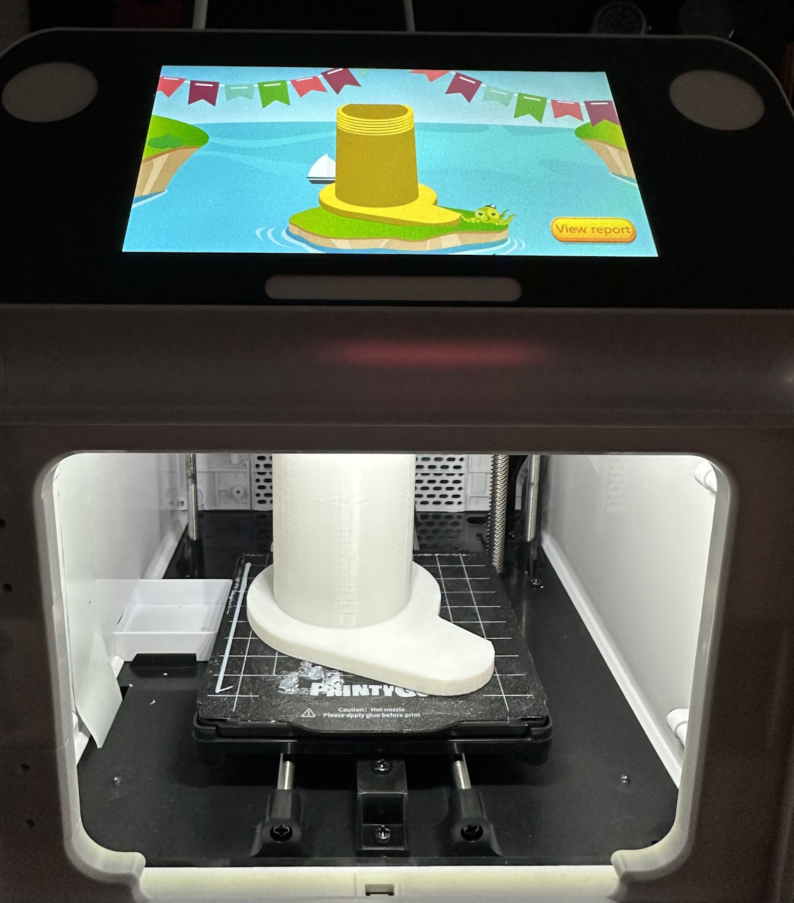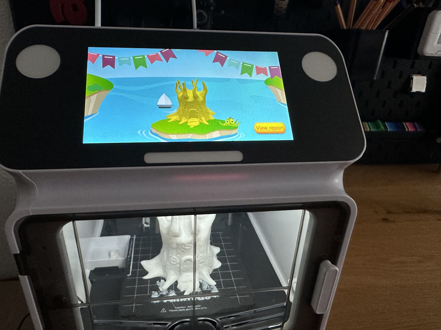 Das Bett ist bei dem PrintyGo nicht beheizt, was dafür sorgen kann, dass sich bei größeren Modellen, durchs abkühlen und damit zusammenziehen des Materials, die Ecken vom Bett abheben. Bei unserem Baumhaus ist auch genau dies passiert. Der Klebstift kann hier helfen, ganz vermeiden lässt sich das Verhalten bei einem unbeheizten Bett allerdings nie.