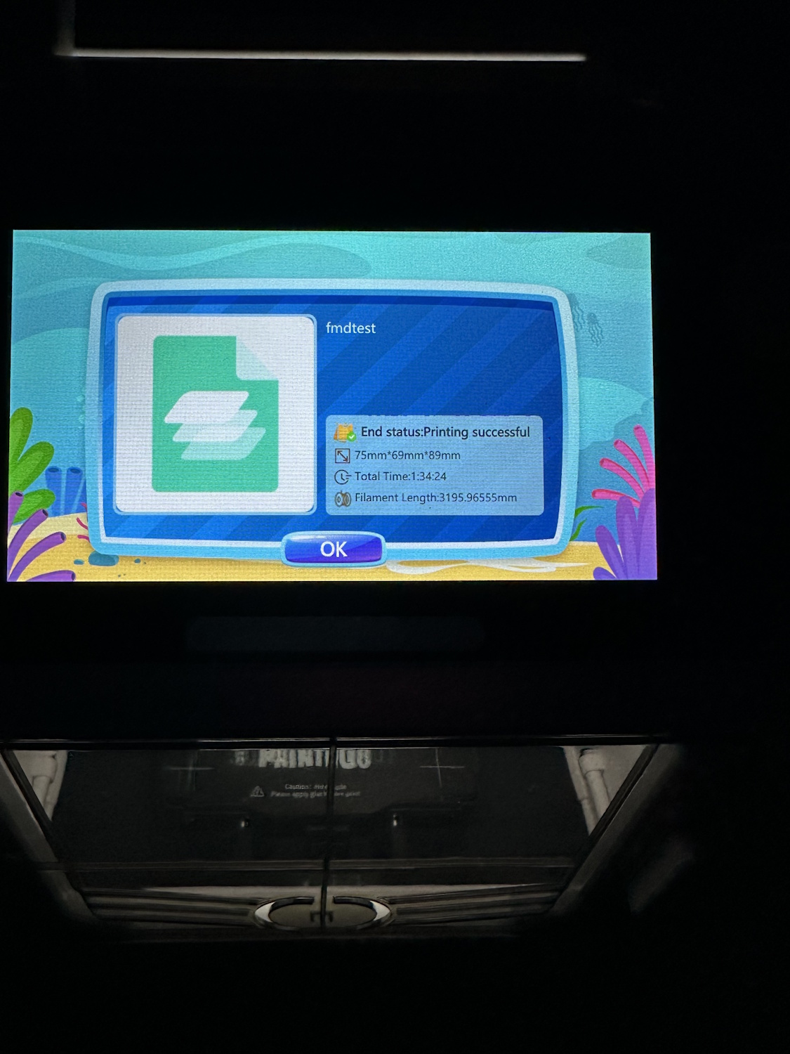 Gedruckt im Speed Modus, also theoretisch bis zu 600 mm/min und tatsächlich ist der Drucker sehr flink. Falls einem die dafür nötige Kühlung zu laut sein sollte, kann auch einmal den Blitz im Druckmenü klicken und es wird im leisen Druckbetrieb fortgesetzt. Dementsprechend aber natürlich deutlich langsamer. Der erste Layer wird so z.B. auch im Blitzmodus mit ca. 10% der Geschwindigkeit und ohne Kühlung gedruckt um die Betthaftung zu verbessern. Ab dem 2. Layer wird denn ordentlich aufgedreht. Ich würde behaupten, dass der PrintyGo dann sogar lauter als mein Bambu Lab H2D ist. Die Darstellung ist cool animiert, so zeigt der Drucker zu jeder Zeit den aktuellen Status mit dem zu druckenden Modell an. Bereits gedruckt wird gelb dargestellt, eine Linie zeigt den aktuellen Layer und darüber ist alles in weiß dargestellt.