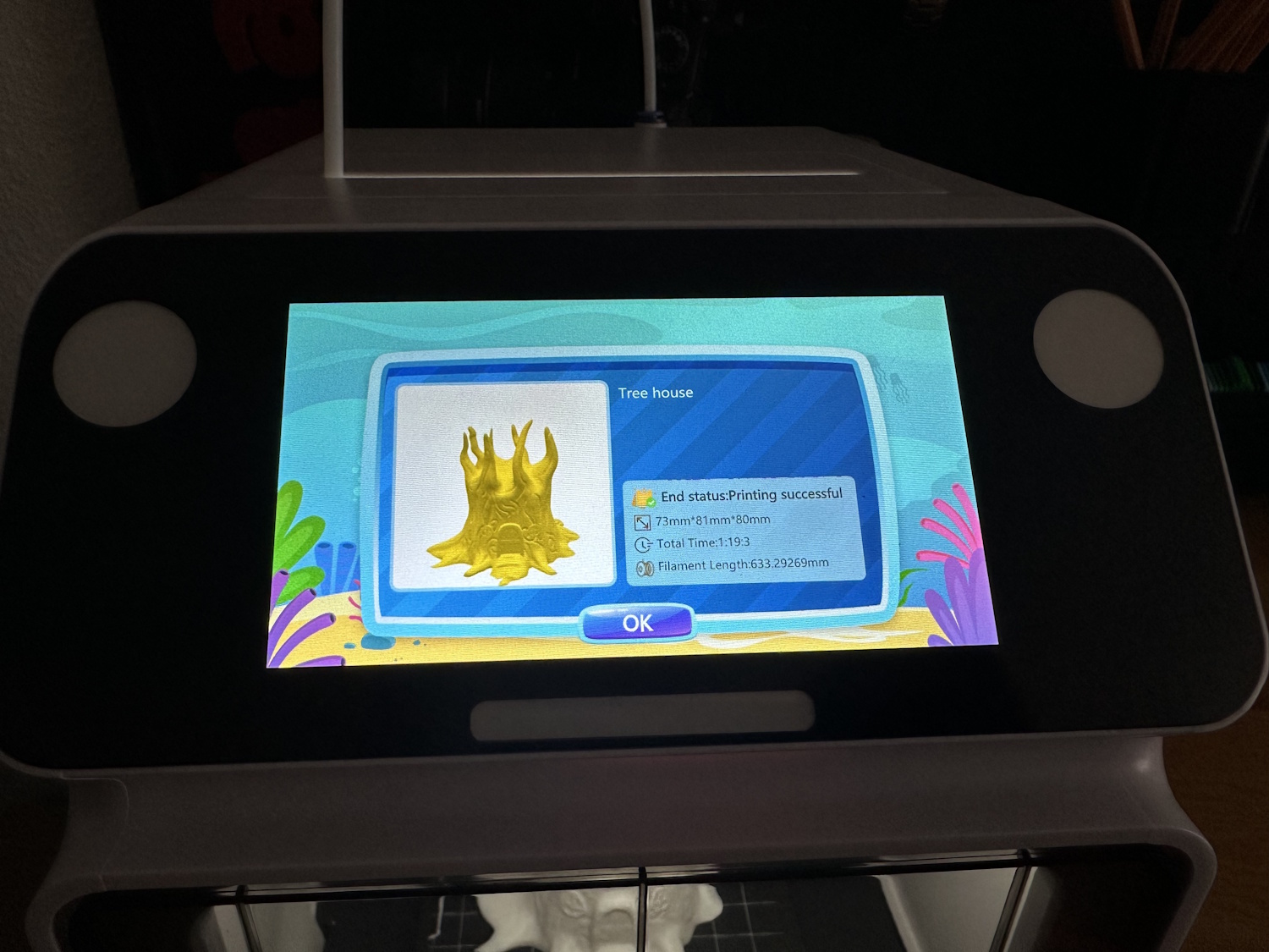 Schon geht es los. In der Übersicht fehlt noch die Filamentmenge oder Meterangabe, das man grob abschätzen kann, ob der Spulenrest ausreichen würde, aber man findet die Zeitangabe, die man ganz gut verdoppeln kann. Das gezeigte Baumhaus sollte 42 min dauern und brauchte am Ende 1 std 20 min.