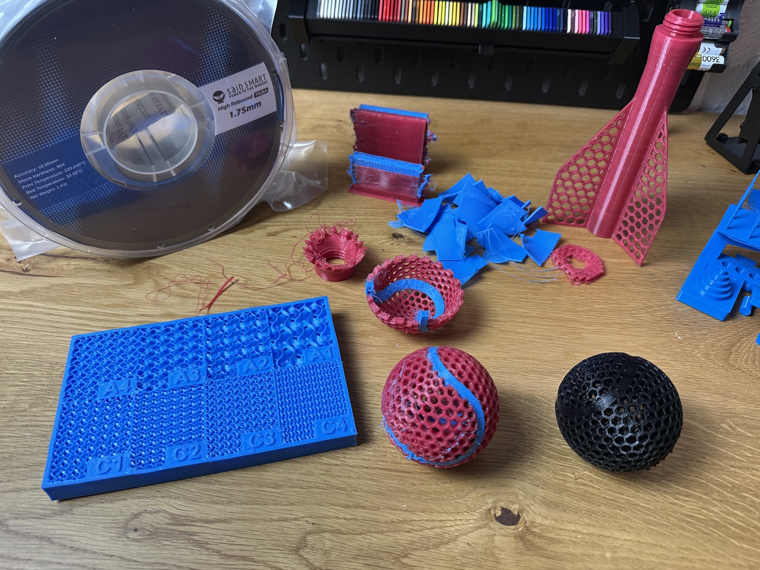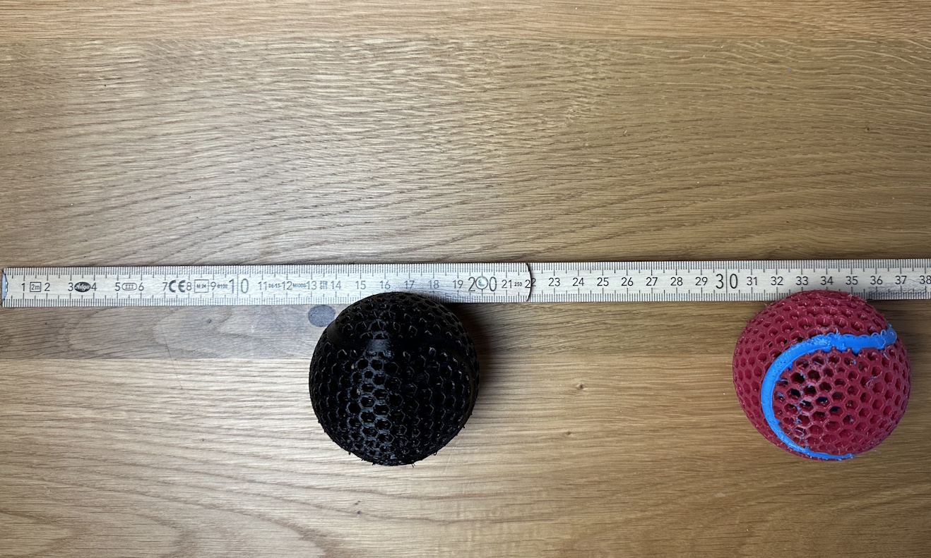 Wir haben verschiedenste Bälle gedruckt, unter anderem auch Tennisbälle. PEBA bounct dabei deutlich mehr als TPU. Aus 50 cm Fallhöhe springt der PEBA Ball wieder zurück auf 30 cm nach dem ersten Aufkommen und der TPU Ball nur auf 13 cm. PEBA springt hierdurch auch mehr als doppelt so oft, bis der Ball zum erliegen kommt.