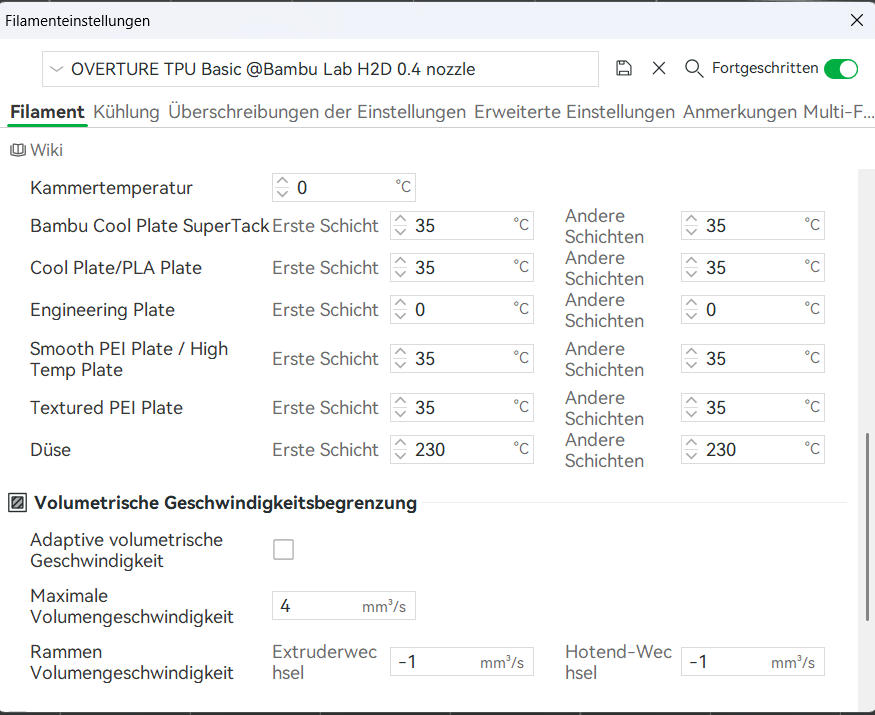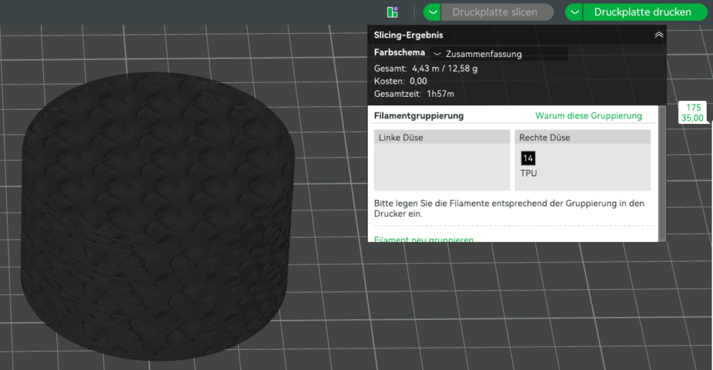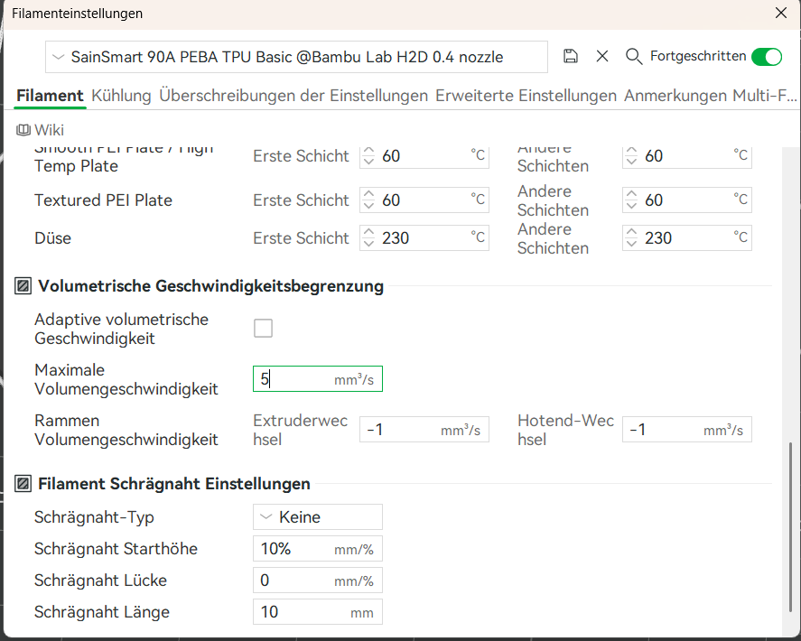 Bei der Druckgeschwindigkeit geht SainSmart im eigenen Printprofil sehr sachte heran und gibt nur 5 mm³/s an, wobei auf der Produktseite 7,2 mm³/s angegeben ist. Um eine annähernd doppelte Druckgeschwindigkeit zu erreichen, muss die Fließrate auch deutlich über der von TPU liegen – OVERTURE gibt ihr TPU mit 4 mm³/s an. Im Screenshot erkennt man das die Düsentemperaturen gleich sind, sich die Betttemperatur bei PEBA allerdings auf 60 °C erhöht (TPU 35 °C).