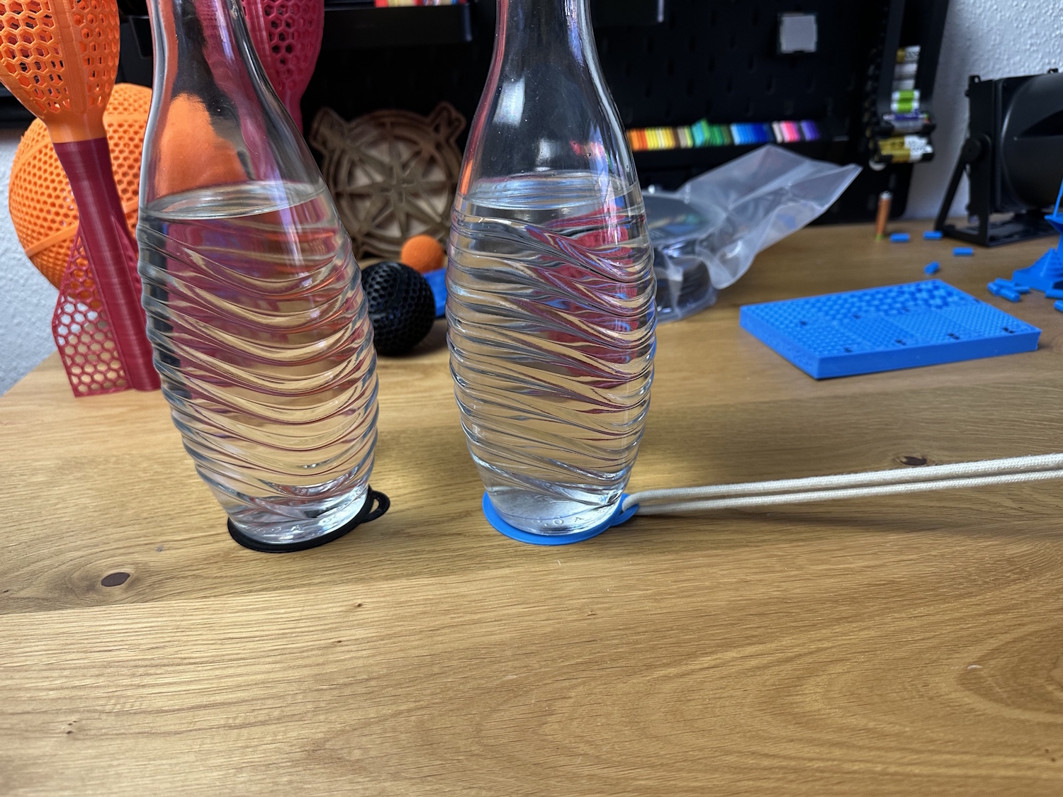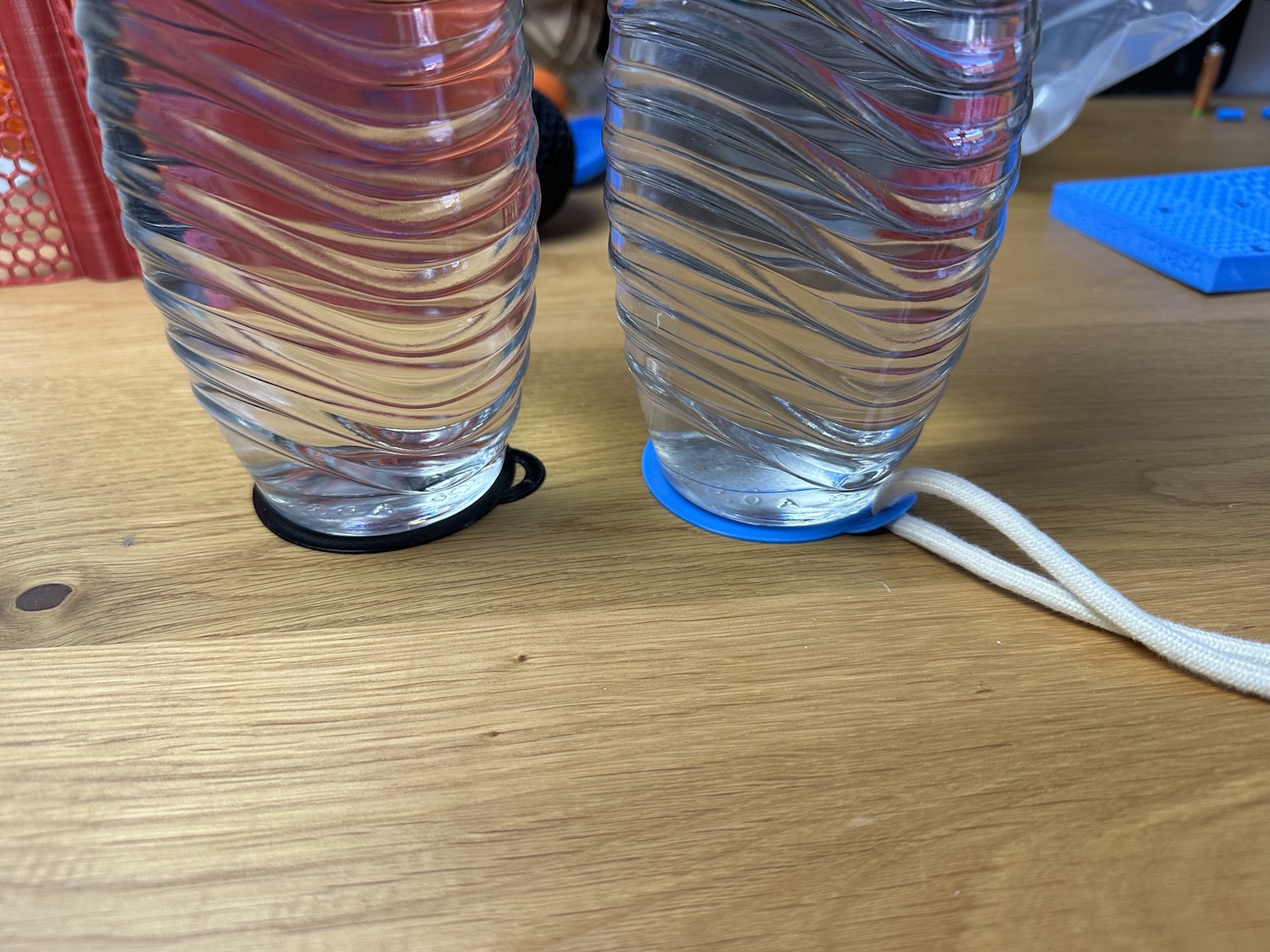 Für den Vergleich des Reibwerts zwischen TPU und PEBA haben wir zwei Scheiben gedruckt, welche mit einem 1,2 kg Gewicht beschwert sind. Nach dem Überwinden des Losbrechmoments haben wir mittels Zugwaage gemessen, wie viel Gewicht nötig ist, um die Scheibe zu ziehen.