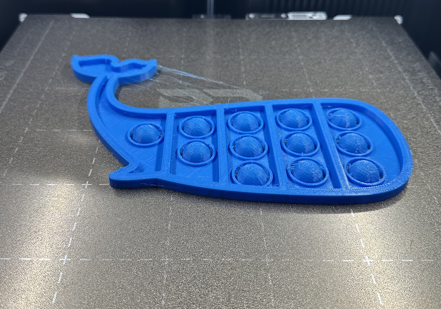 Für die nervösen Finger gabs bei Makerworld dieses Pop Fidget. Die Hügel lassen sich hin und her ploppen und geben ein Geräusch wie Knisterfolie von sich. Prinzipiell auch mit TPU möglich, aber dank PEBA war der doch relativ große Druck schnell in die Realität umgesetzt. Funktioniert wunderbar. Das leichte Stringing war schnell mittels Flamme entfernt.