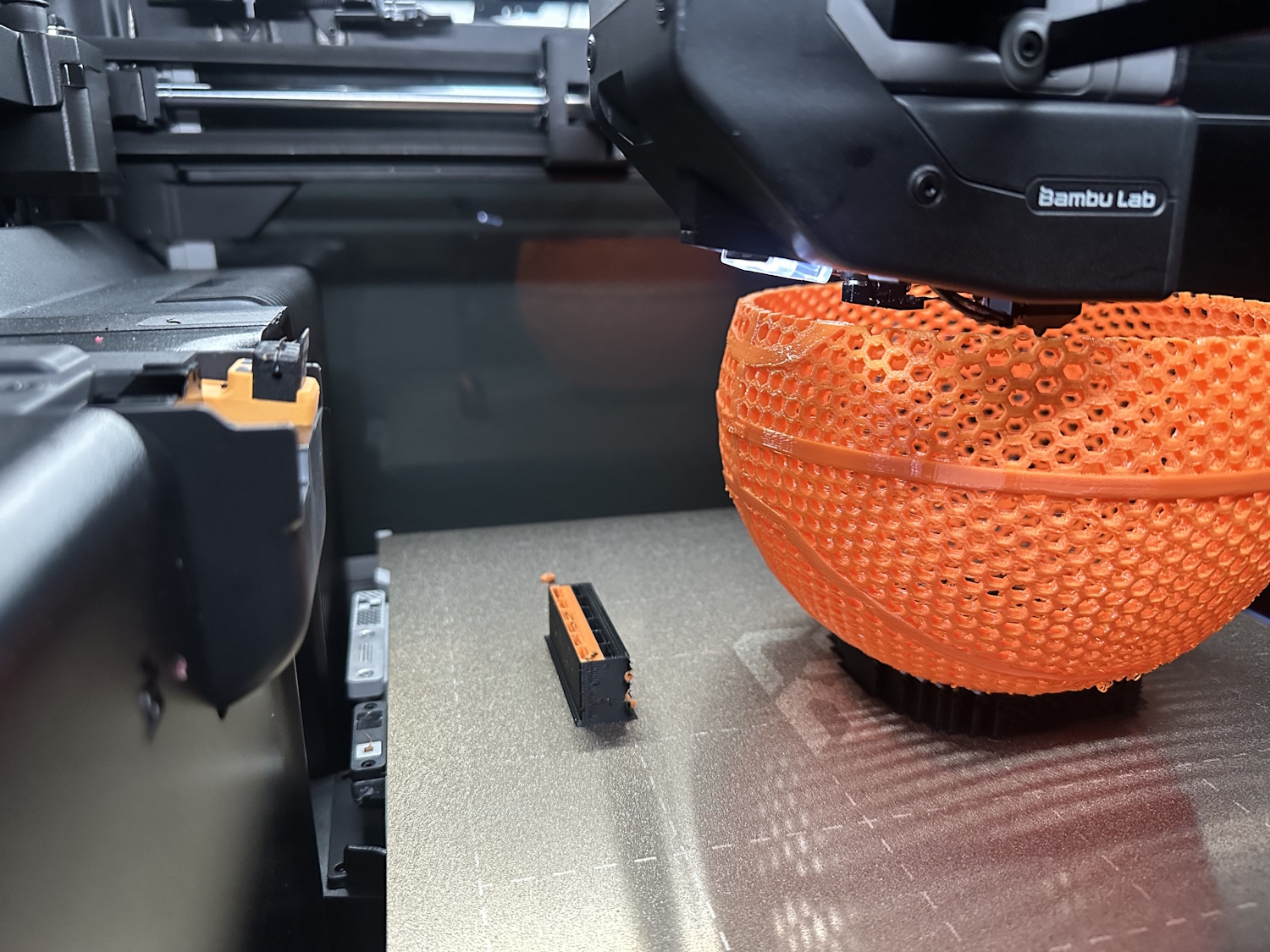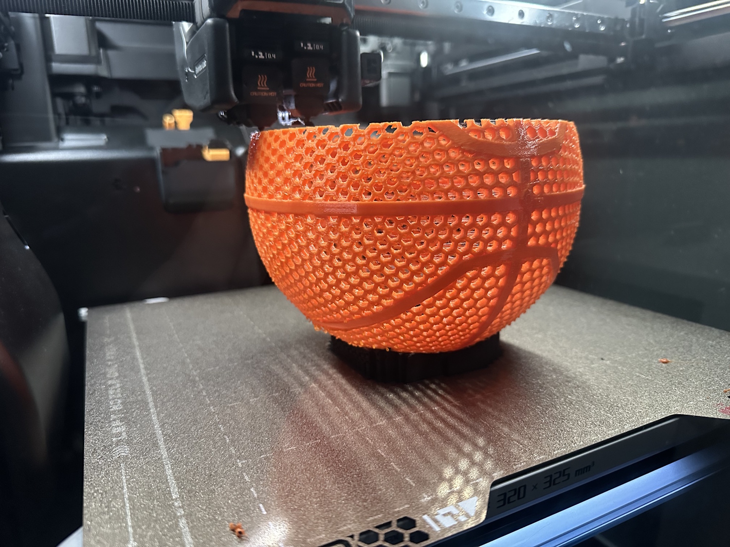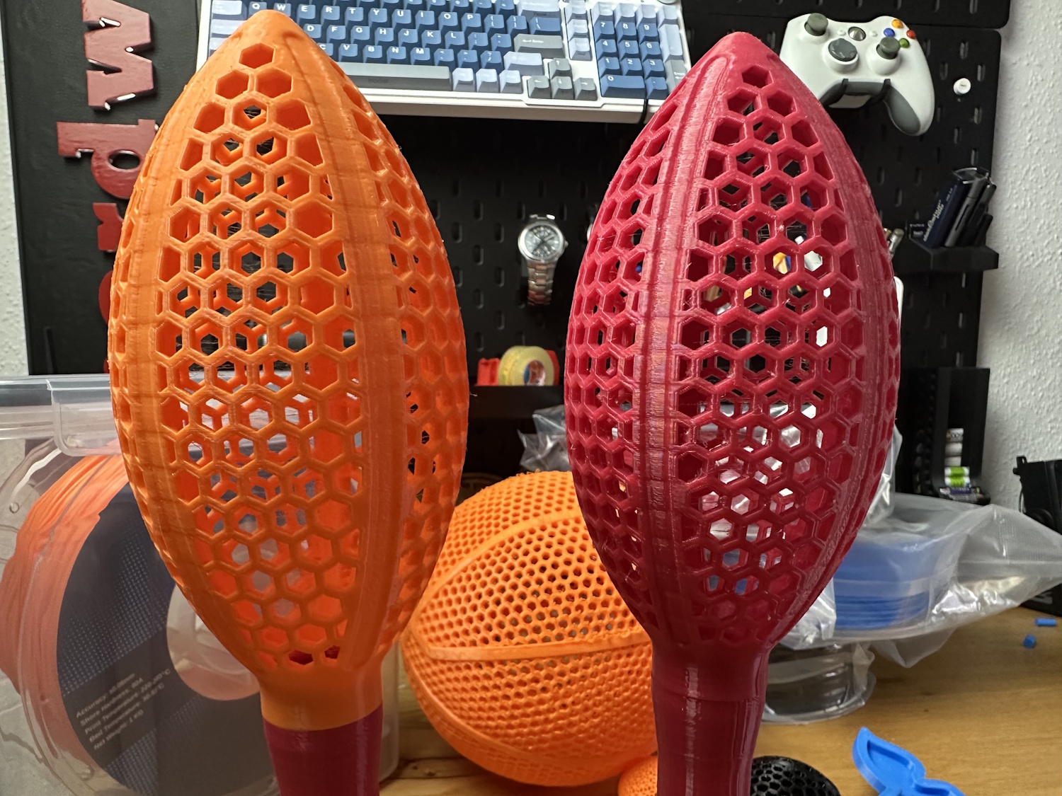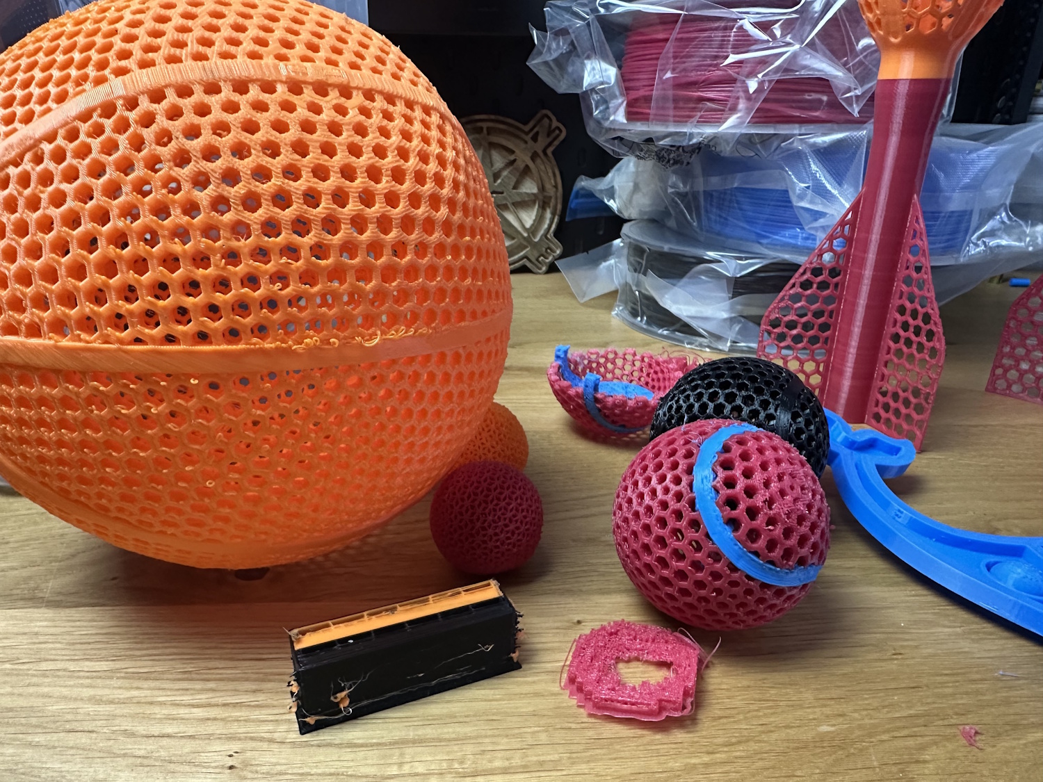 Der Basketball war mit der längste Druck. Die Qualität ist bis auf die Filamenttropfen auf den unteren Überhängen sehr gut geworden. Leider sind die Parameter für eine richtige Nutzung des Basketballs nicht perfekt gewesen. Beim Werfen verformt er sich leider mehr in sich selbst und absorbiert beim Zurückspringen zu viel Energie dabei. Kurzum er springt nicht sehr gut – schade, aber immerhin sieht er gut aus.