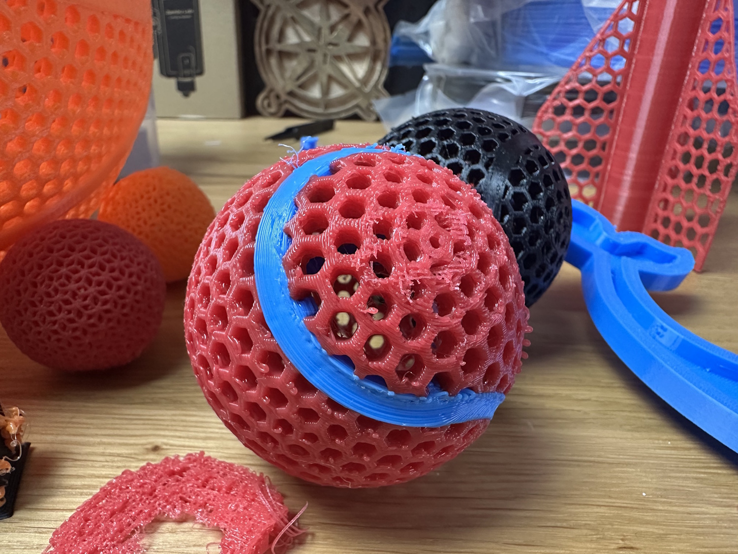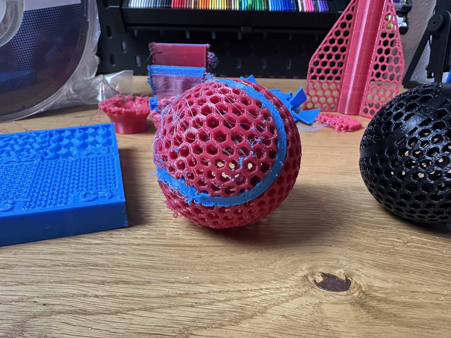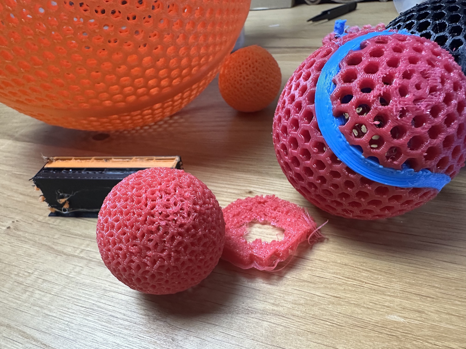 Wir haben auch einige Modelle gedruckt, die man vorzugsweise mit flexiblem Material drucken kann. Gerade bei den Bällen und Wurfgegenständen ist PEBA mit dem erhöhten Rücksprungwert perfekt.