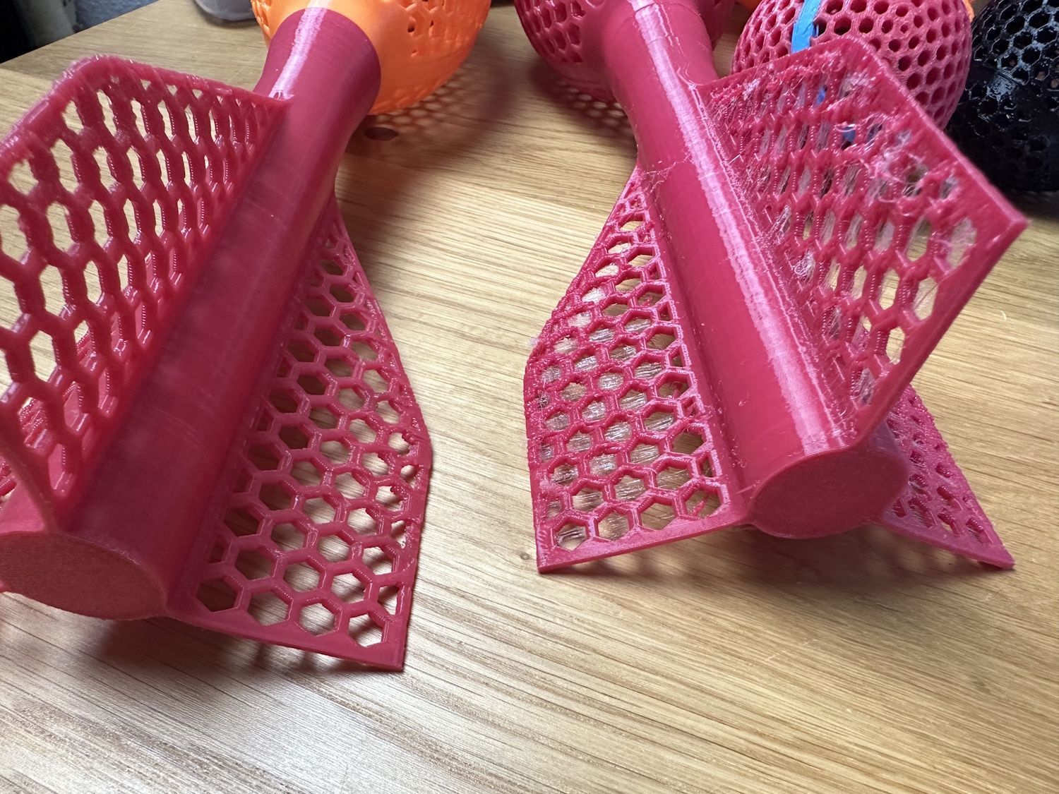 Diese Wurfrakete kennt man vielleicht von verschiedenen Spielzeugmarken in ähnlichem Design. Perfekt für PEBA, da sie bei Einschlag wild umher bounct. Leider hätte ich da vorher mehr Zeit ins Kommentare-Lesen investieren sollen – denn sie fliegt schrecklich. Der Schwerpunkt ist zu weit mittig, sodass sie sich im Flug oft umdreht. Hier muss also deutlich mehr Gewicht in die Spitze, vielleicht gibt es dann nochmal eine Chance für das Modell. Die Bounce Eigenschaften sind trotzdem perfekt und die Rakete ist damit fast unzerstörbar. Im rechten Bild sieht man auch, was passiert, wenn das Material feucht ist. Nach Trocknung und Druck mit dem identischen Profil/Parametern kam das linke Flügelpaar heraus. Kein Stringing und weniger optische Defekte.