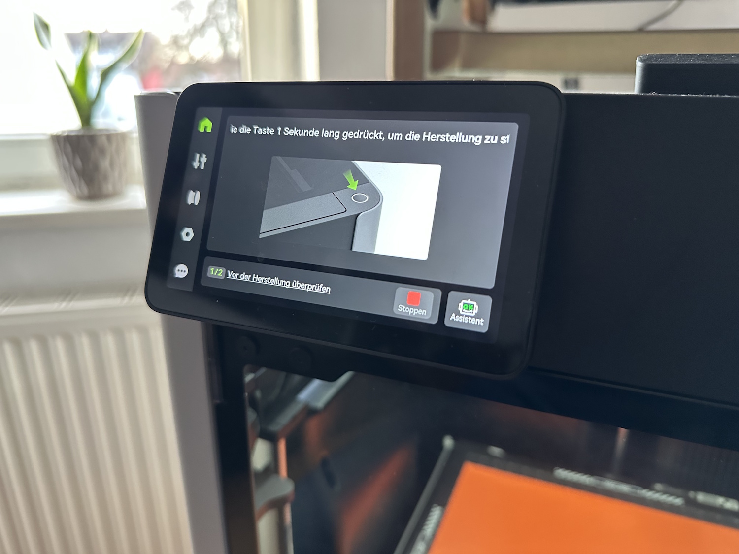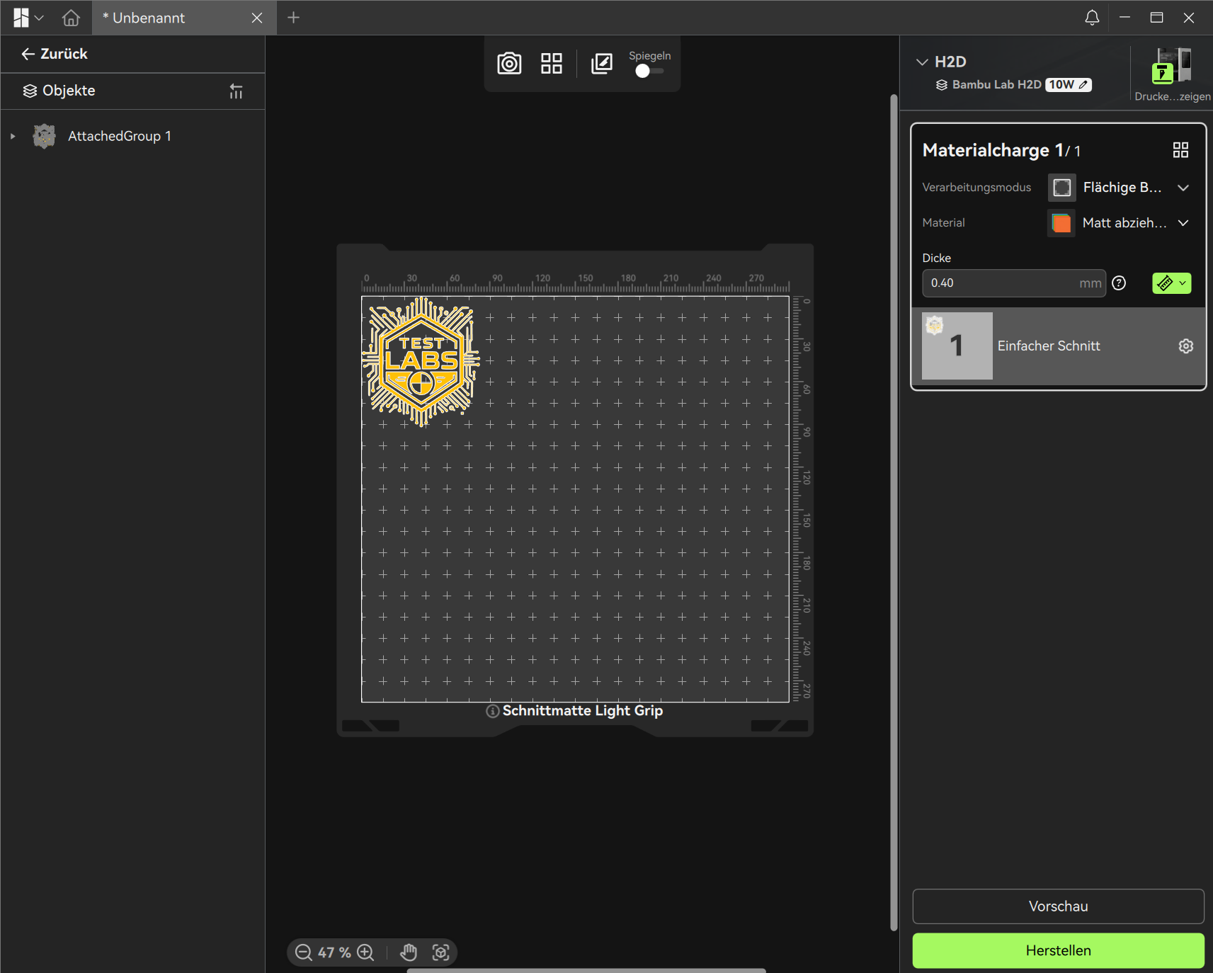 Durch „Herstellen“ wird unser Testprojekt zum H2D gesendet. Für einen erweiterten Schutz, immerhin bewegt sich der H2 nicht besonders langsam und hat jetzt ein Messer in seinen Händen, muss für eine Sekunde der Startknopf gehalten werden – erst jetzt startet das Plotten. Während der Arbeit wird eine Liveview auf dem Display eingespielt.