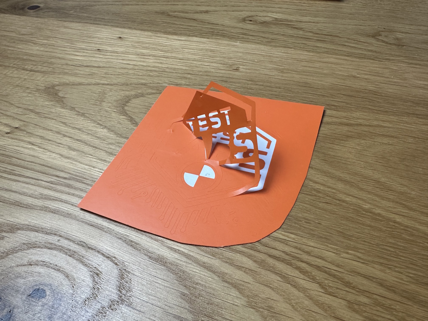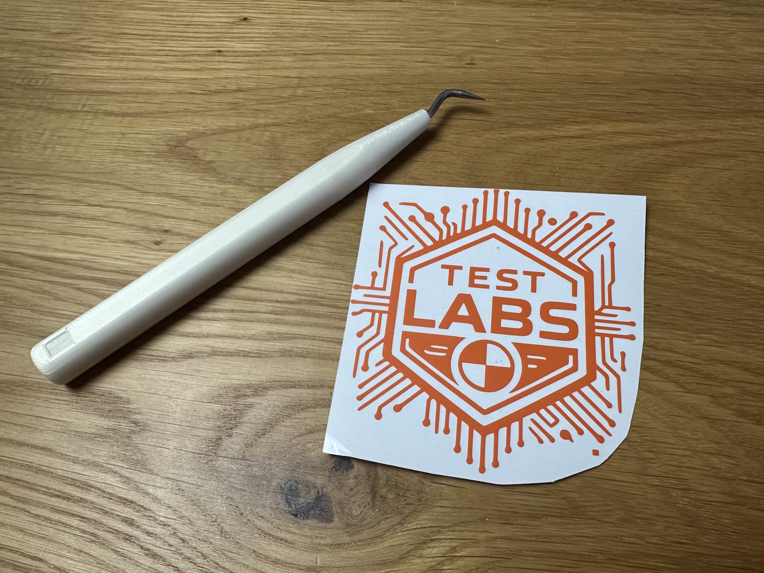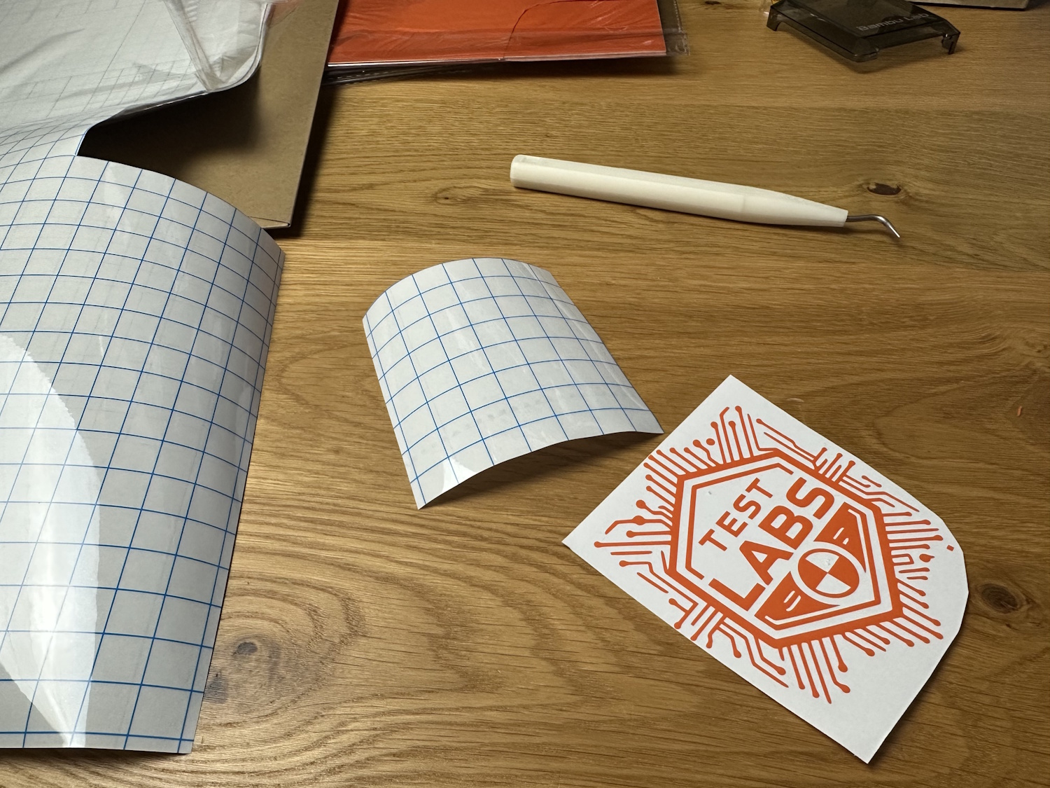 Nachdem wir bereits zuvor den Griff für das Entgitterwerkzeug gedruckt haben, entfernen wir damit jetzt die überschüssige Vinylfolie. Im Idealfall waren die Einstellungen z.B. der Druck des Messers seitens Bambu Lab so gewählt, dass das Obermaterial zu 100% durchschnitten, die Trägerfolie aber nur maximal angekratzt ist. Nur so lassen sich die Einzelteile gut entfernen.