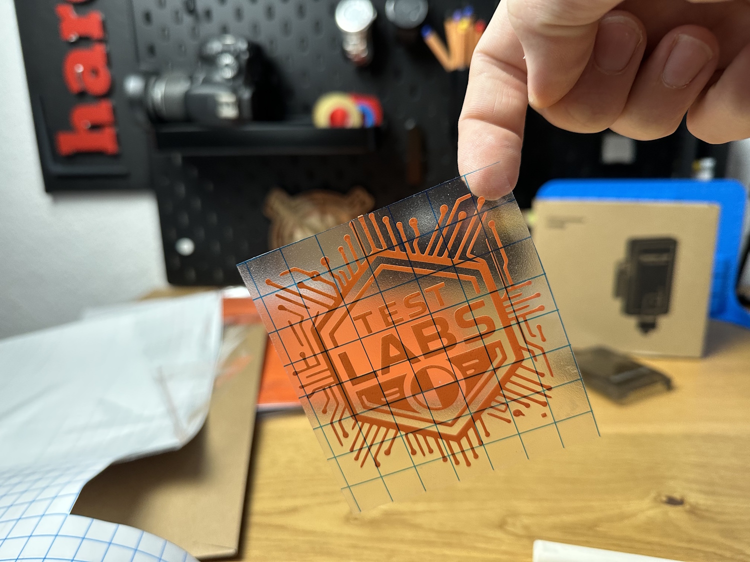 Mittels der klaren Transferfolie wird unser Aufkleber von der Trägerfolie entfernt und kann an unserem Ziel angebracht werden. Gerade die kleinen Leiterbahnen haben hier noch echt gut auf der Trägerfolie geklebt, aber starkes andrücken und ein sehr flaches Abziehen der weißen Trägerfolie hat letztendlich zum Erfolg geführt.