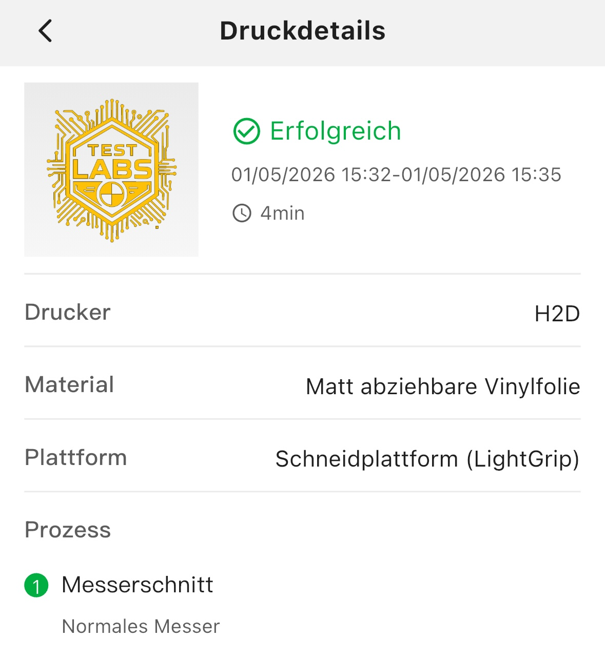 Keine zwei Minuten später und der wilde Messertanz war bereits beendet. Das Klebedruckbett, welches das Vinyl während des Plottens in Position hält, hat zwei Seiten, je nach Haftstärke. Die Bambu Suite empfiehlt aber im Vorbereitungsfenster die entsprechende Seite – bei unserem Beispiel die Light Grip Seite. Laut Handybenachrichtigung und Pop Up in der Bambu Suite war die Herstellung erfolgreich.