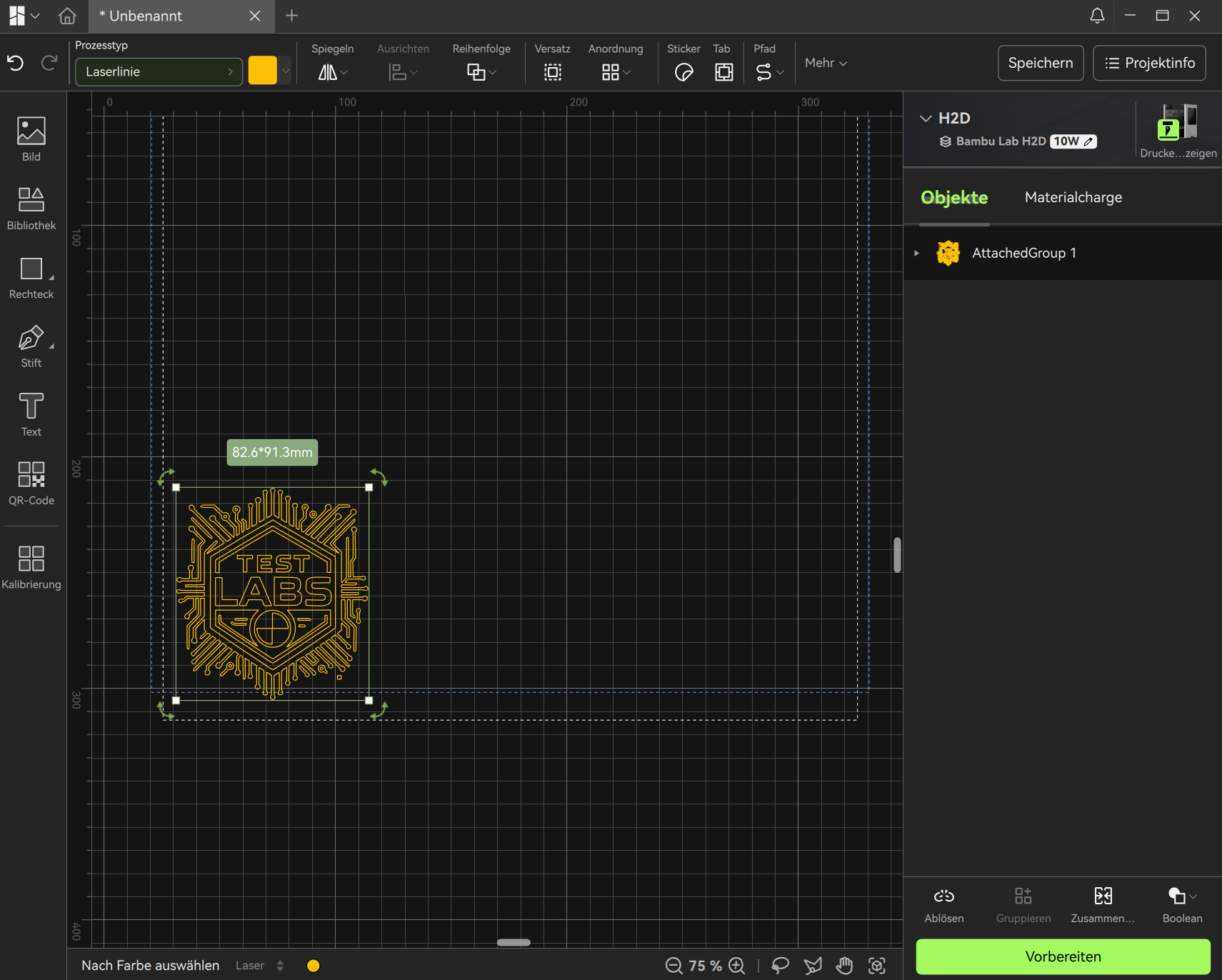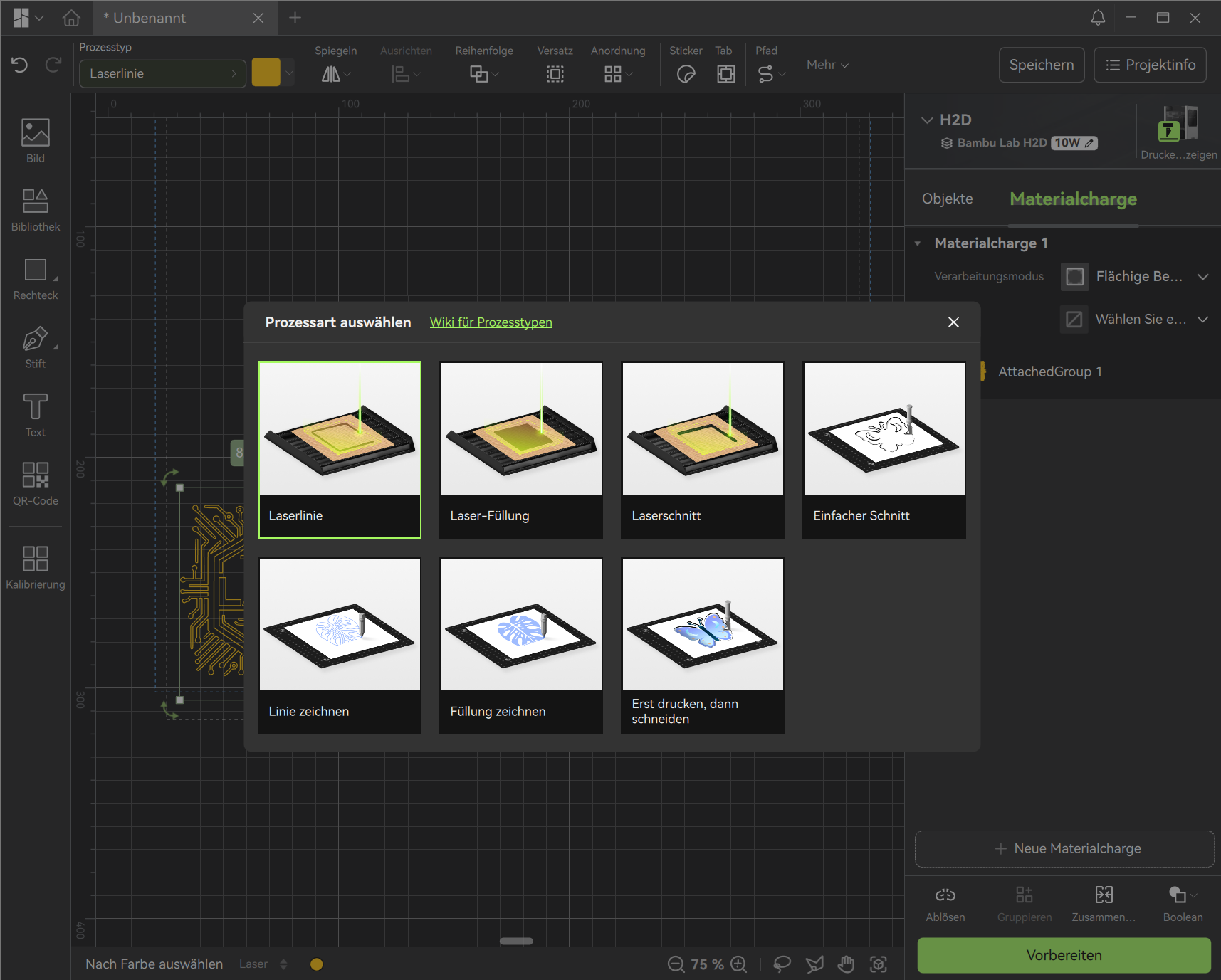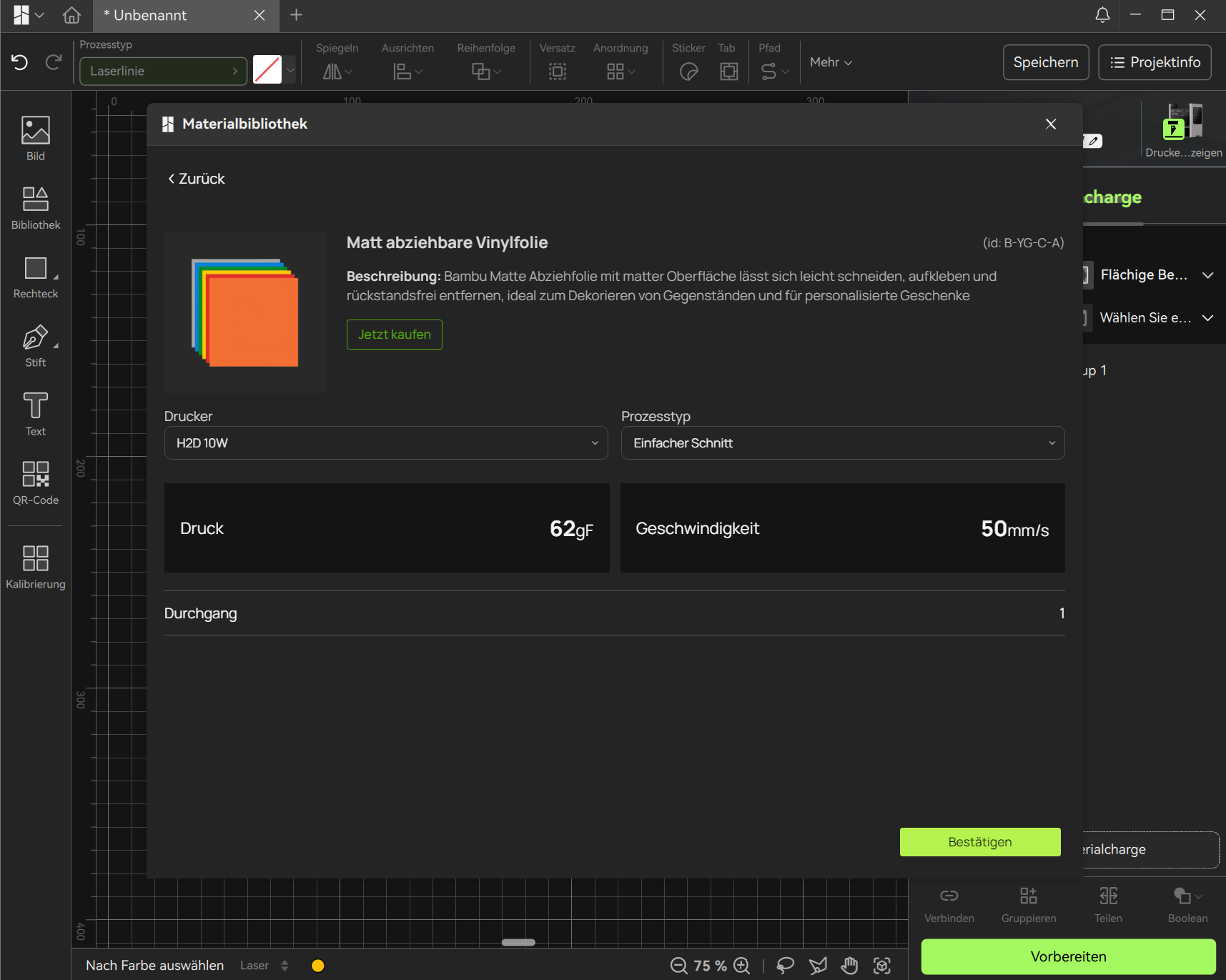 Im Gegensatz zur Bambu Studio Software für das Vorbereiten der 3D Drucke, wird fürs Lasern und auch fürs Plotten, also alle 2D Arbeiten, die Software Bambu Suite genutzt.