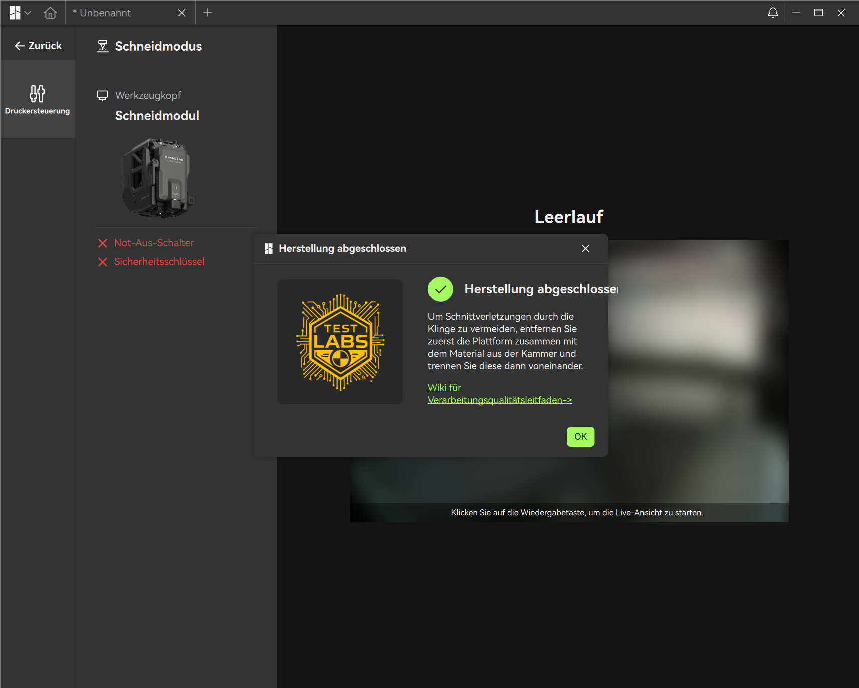 Teils sieht man hier und da noch etwas Nachholbedarf bei der Übersetzung bzw. der Orientierung. Es handelt sich aber eher nur um optische Kleinigkeiten. Text außerhalb von Fenstern, „Druck erfolgreich“ anstatt vom Schneiden oder Plotten zu reden.