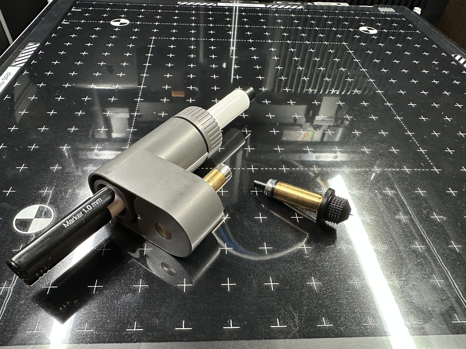 Für die Stifthalterung kann nach erfolgter Grundeinstellung das Messer mitsamt Halter nach unten herausgezogen werden. Damit der Stift auch auf der korrekten Tiefe eingespannt wird, ist die transparente Kappe dabei. Diese wird auf den Stifthalter aufgesteckt und dient als Anschlag. Der Stift kann bis zum Boden durchgeschoben und arretiert werden. Somit wird sichergestellt, dass nachher auch der eingestellte Druck aufs Papier gebracht werden kann. Der Mechanismus im Schneidmodul ist allerdings zusätzlich Federbelastet, kleine Unebenheiten oder Spitzenbelastungen können somit ausgeglichen werden.