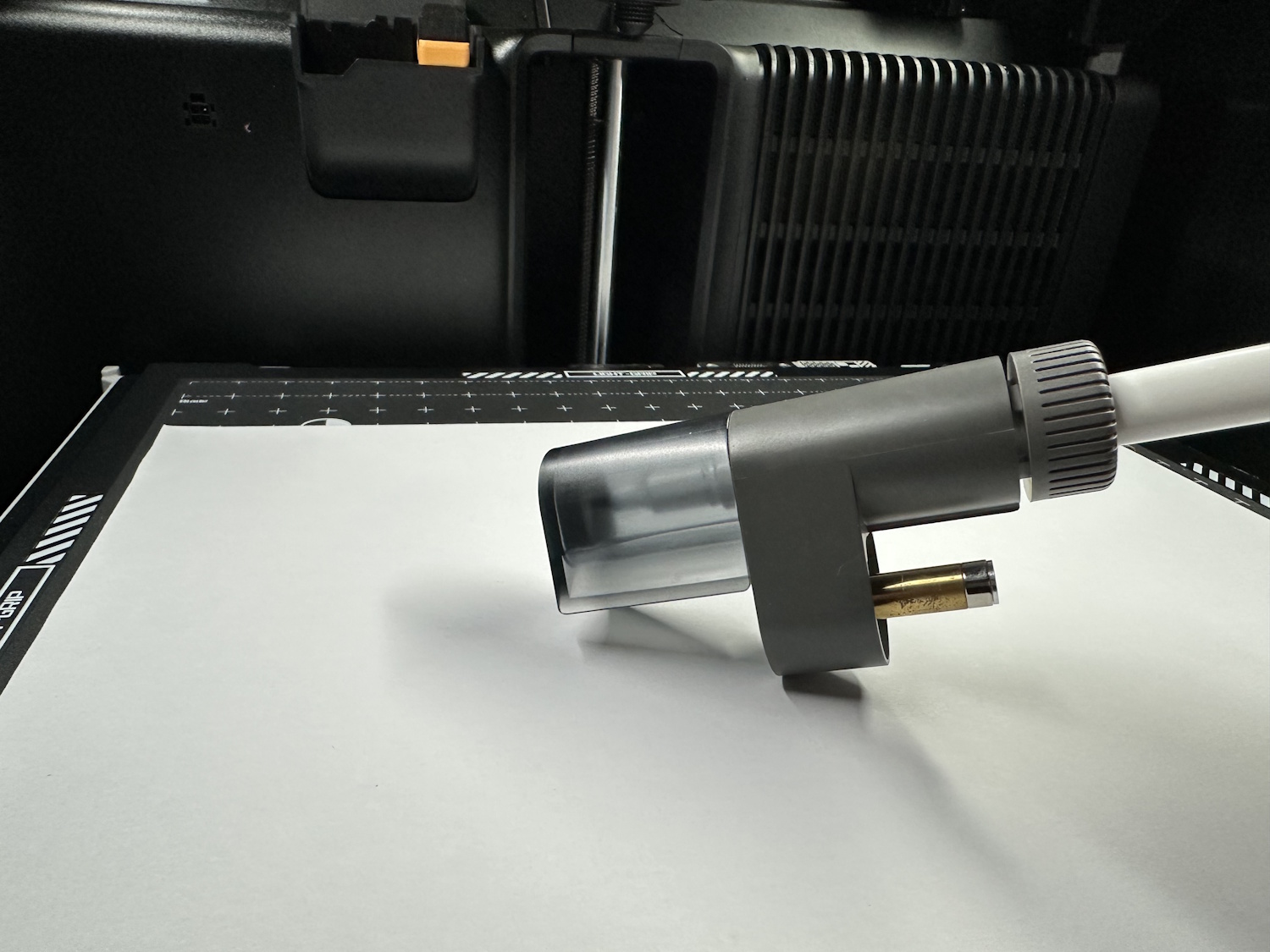 Für die Stifthalterung kann nach erfolgter Grundeinstellung das Messer mitsamt Halter nach unten herausgezogen werden. Damit der Stift auch auf der korrekten Tiefe eingespannt wird, ist die transparente Kappe dabei. Diese wird auf den Stifthalter aufgesteckt und dient als Anschlag. Der Stift kann bis zum Boden durchgeschoben und arretiert werden. Somit wird sichergestellt, dass nachher auch der eingestellte Druck aufs Papier gebracht werden kann. Der Mechanismus im Schneidmodul ist allerdings zusätzlich Federbelastet, kleine Unebenheiten oder Spitzenbelastungen können somit ausgeglichen werden.