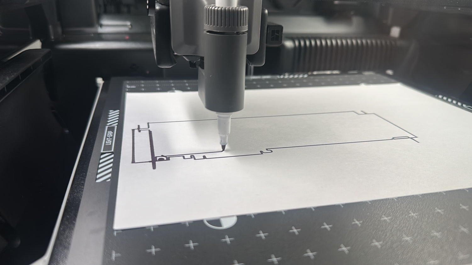 Wie bereits vorher erwähnt, muss das Schneidmodul erstmal in der Konfiguration mit dem verbauten Messer kalibriert werden. Der Drucker prüft so selbstständig die Höhe, Messer zu Druckbett und kann so die Kraft entsprechend einstellen.