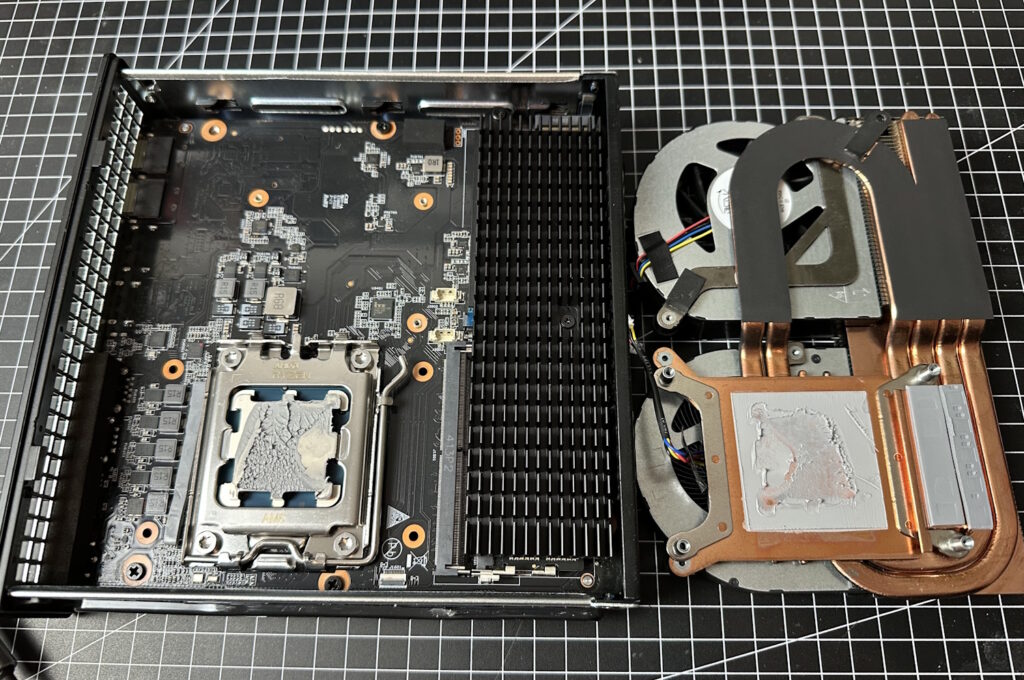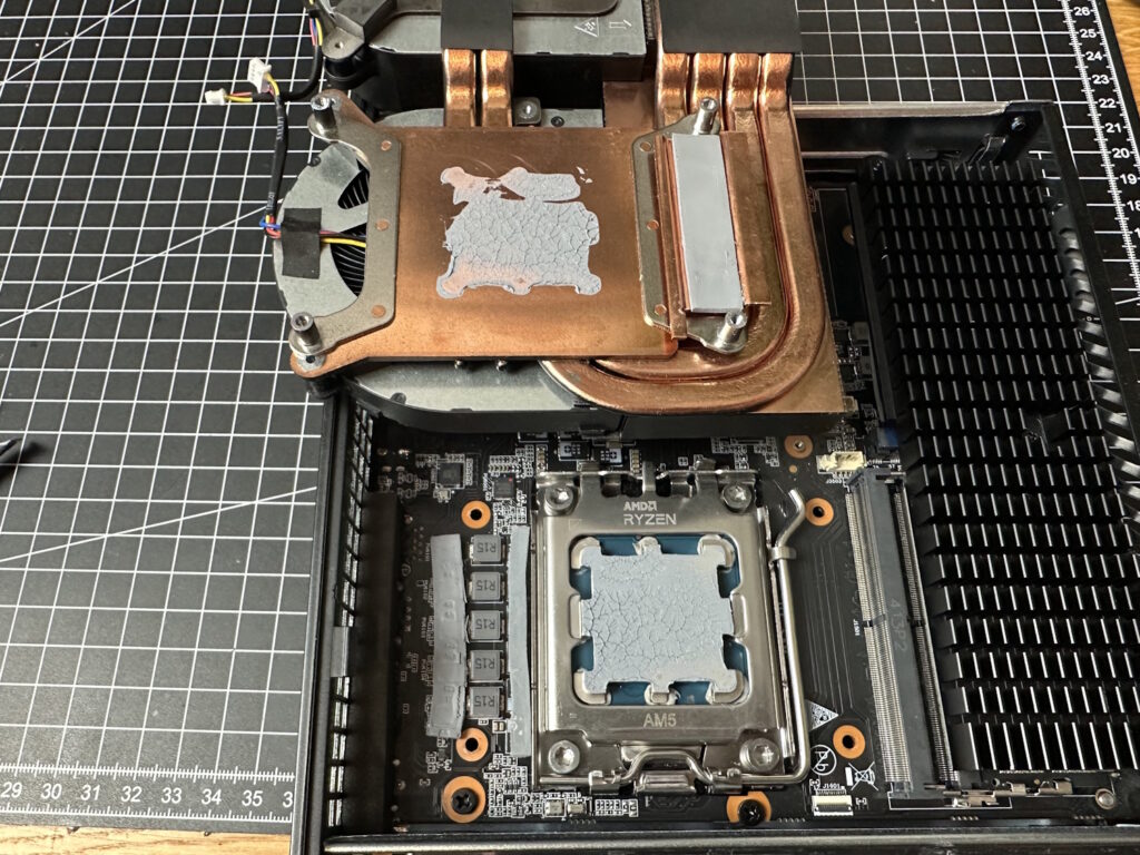 Im Rahmen des Thermal Grizzly Artikels haben wir das erste Mal nach Bau den CPU Kühler vom MS-A1 abgenommen und uns schon gewundert, warum die CPU nicht komplett in Kontakt mit dem Kühler stand – zu sehen am Bild der Wärmeleitpaste: