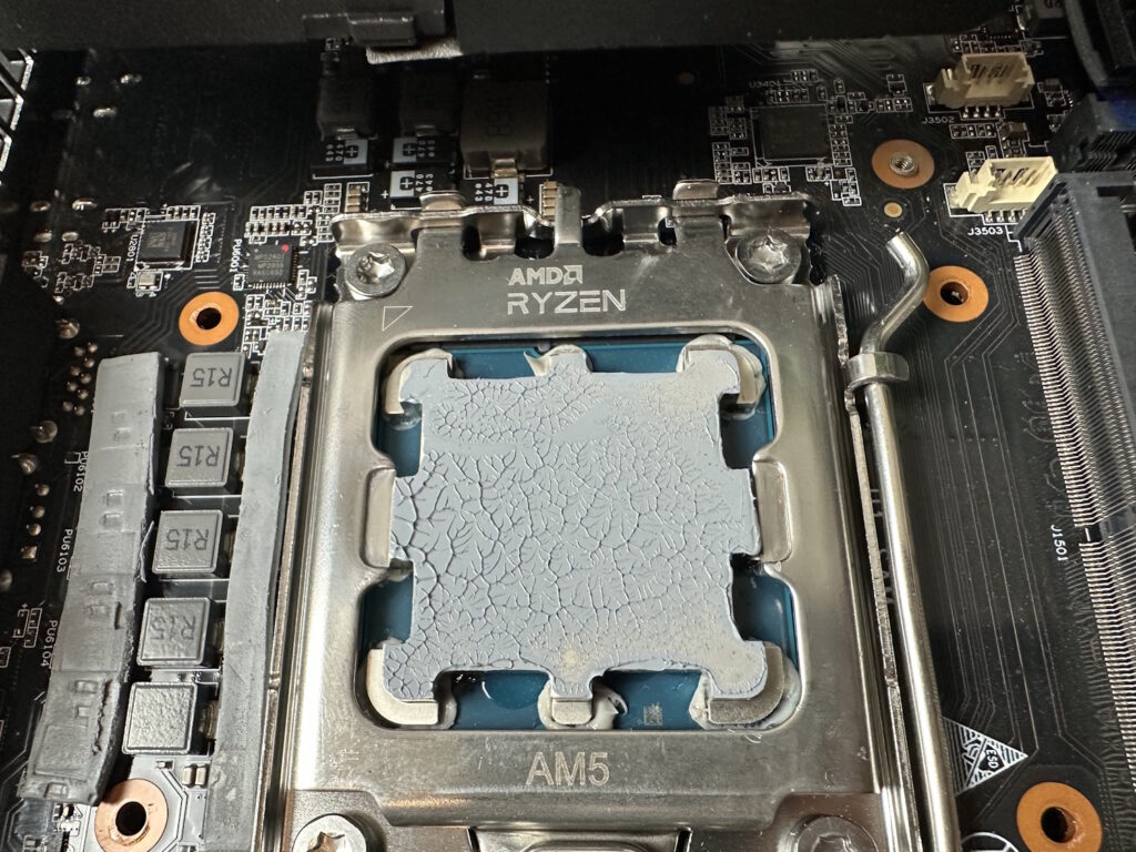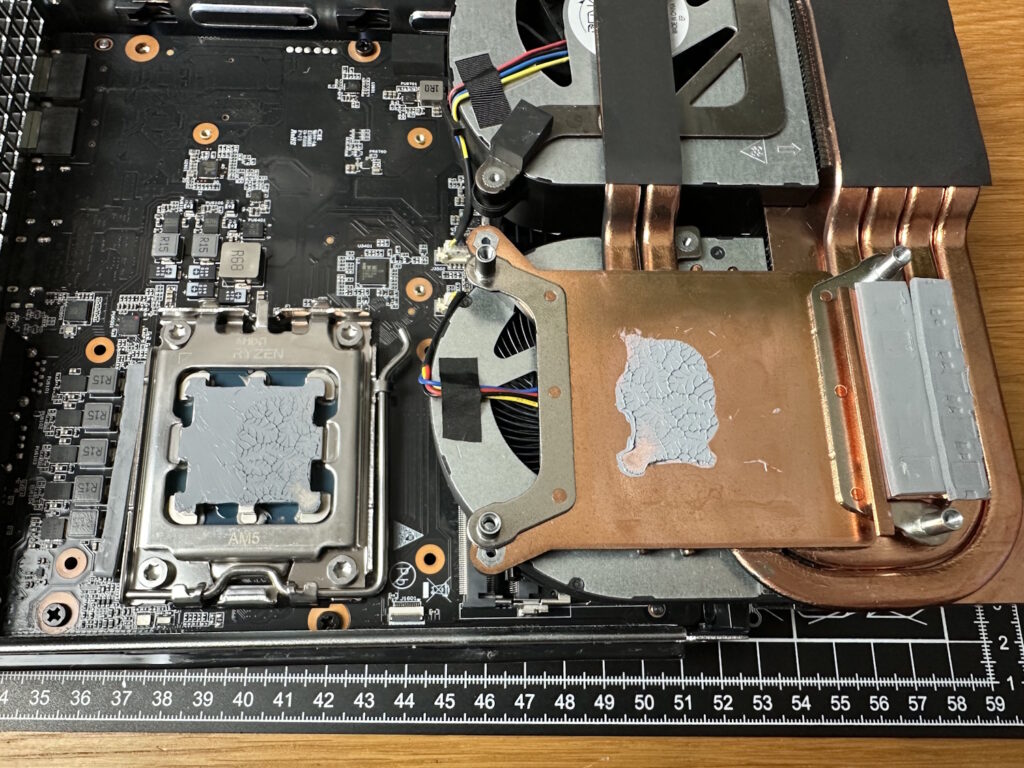 Nachdem wir die CPU geköpft hatten und die Wärmeleitpaste des 8700G durch Flüssigmetall ersetzt hatten, fehlen weitere Zehntelmillimeter, sodass sich der Effekt verstärkte. Scheinbar haben sich die Fertigungstoleranzen unseres MS-A1 soweit addiert, dass selbst für den Werkszustand die Standoffs from CPU Kühler einen Hauch zu lang waren. Da aber immer noch ein Großteil der CPU in Kontakt mit dem Kühler stand, passten die Temperaturen ins Bild.