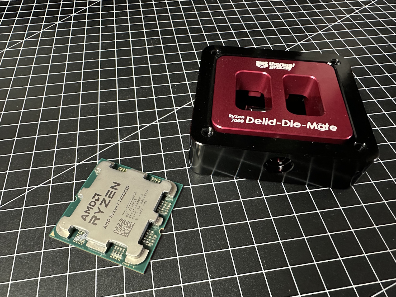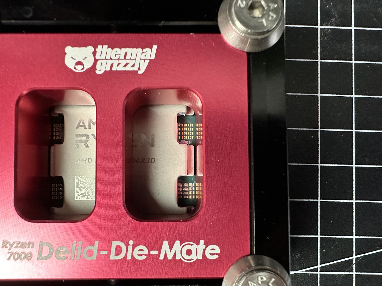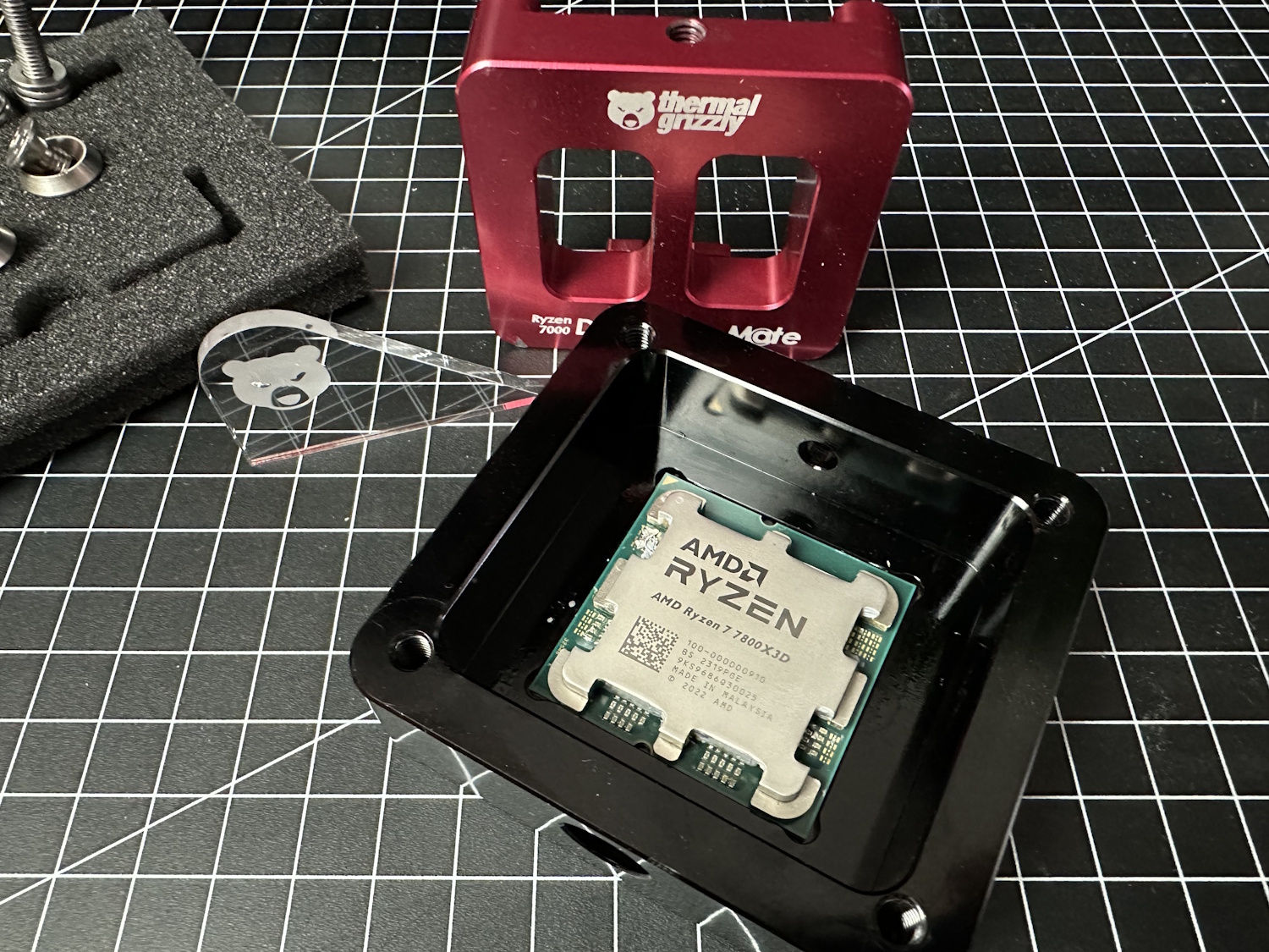 Das Spannendste und Aufregendste an diesem Projekt direkt zu erst. Wir köpfen den Ryzen 7 7800X3D – bleibt er heile?! Hoffen wir mal. Die Ryzen 7000 Variante des Delid Die Mates ist generell kompatibel zu 7000/8000G/9000-Prozessoren (bis auf Ryzen 5 7400F, prüft TGs Angaben). Thermal Grizzly führt aber auch Modelle speziell für Intels 13. Generation oder Sockel 1851 CPUs, mehr dazu auf TGs Website.